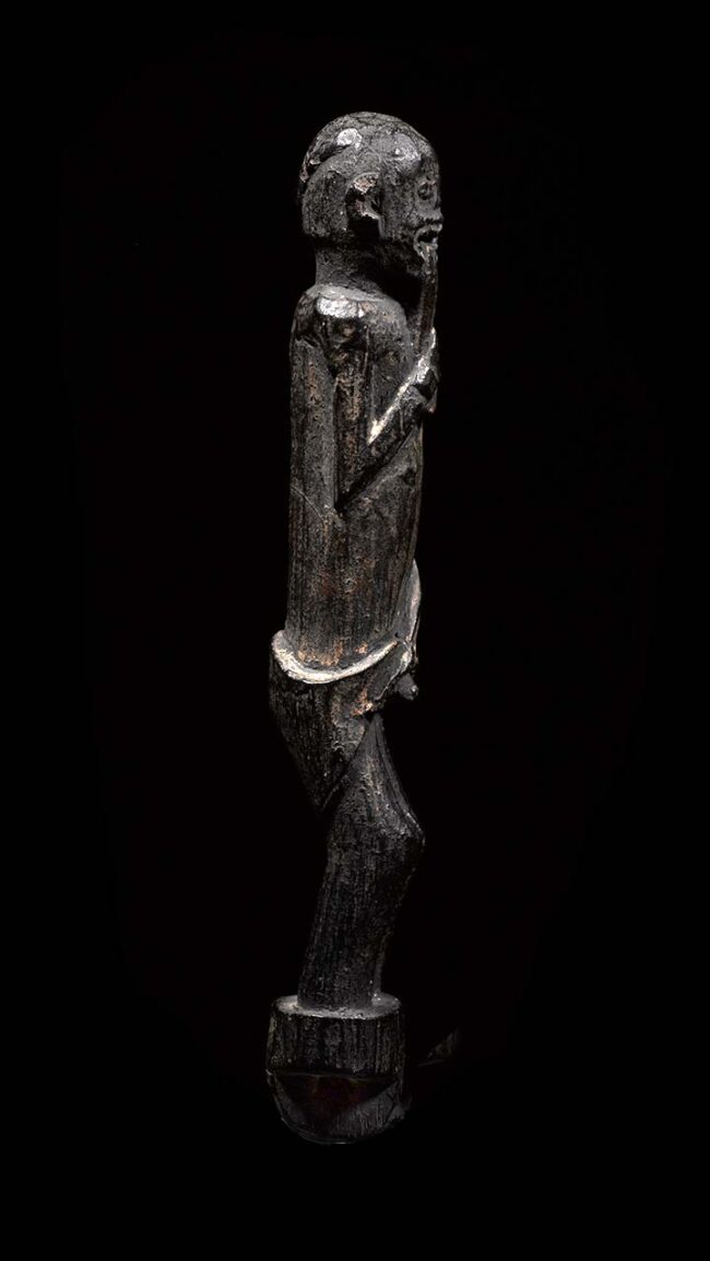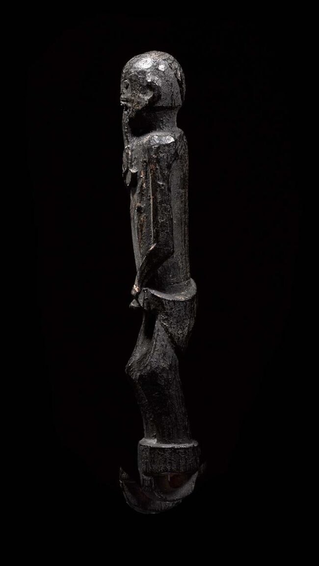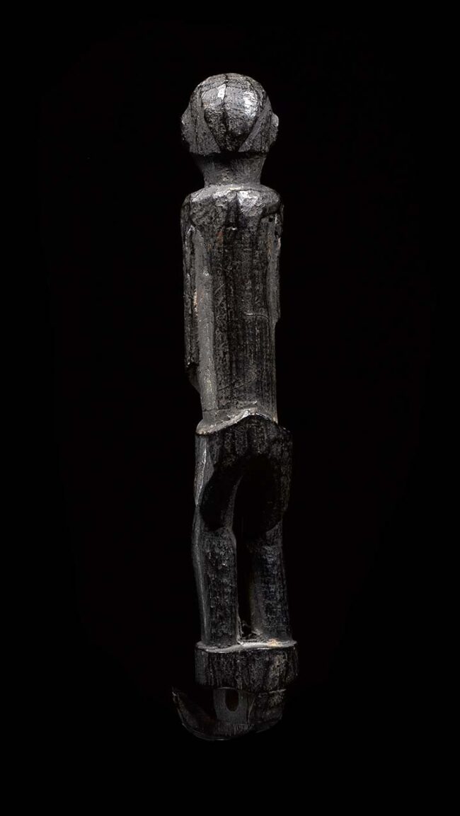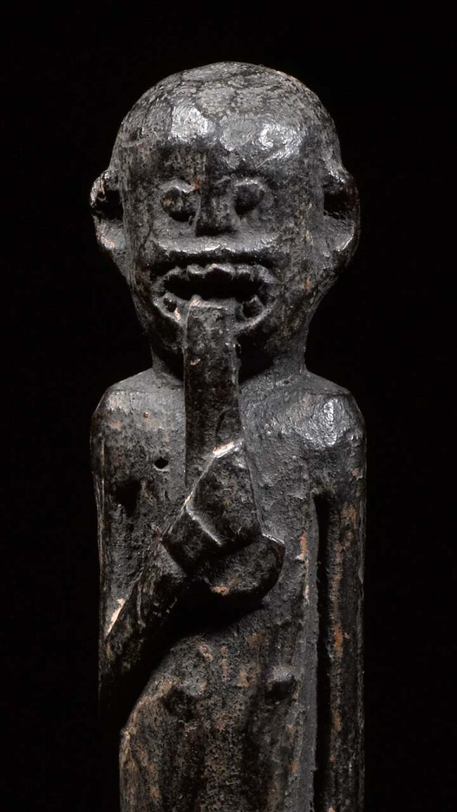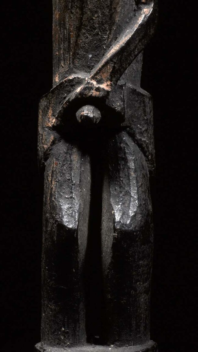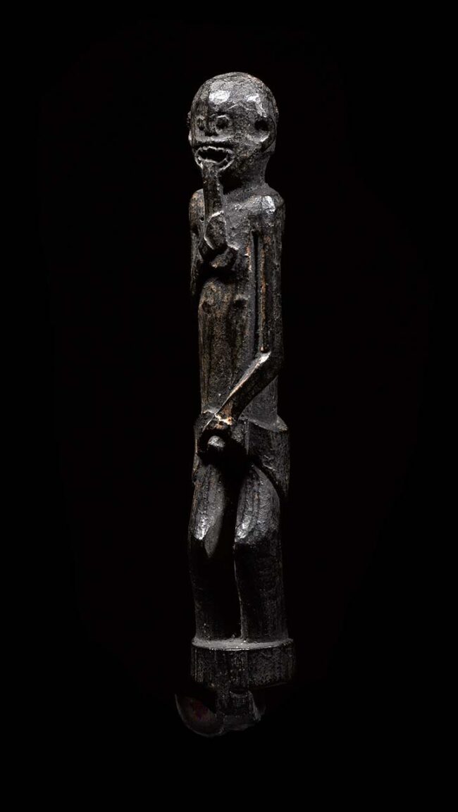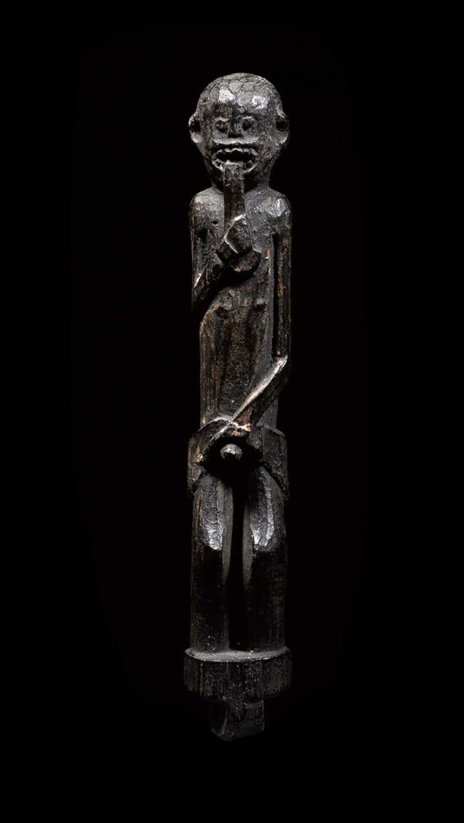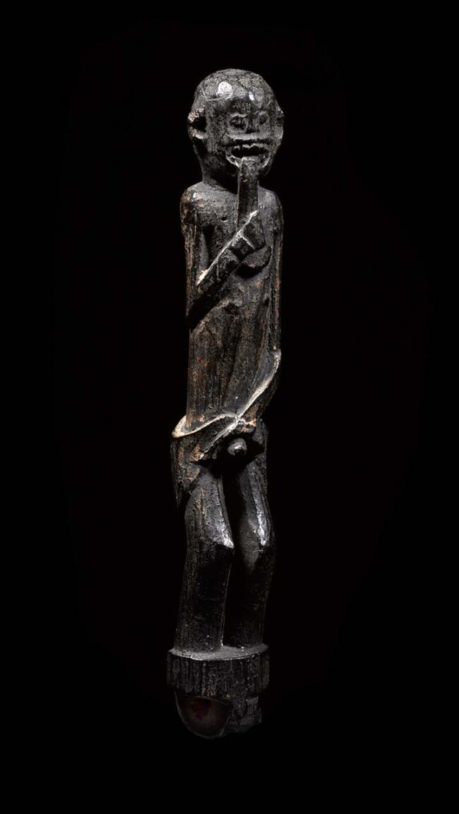 This powerful amulet figure from Borneo is reminiscent of the large Hampatong figures that surround and protect Dayak villages. It possesses a strong and menacing presence, with its exposed teeth and open mouth. One arm is holding its extended tongue while the other is grasping at its genitals. This lower hand’s fingers take the form of claws, suggesting transformation and a stylistic indication of its early creation. The patina is deep and blackened from decades of use and storage. Also of note is its large size; most likely it was the centerpiece and most prominent amulet on a Shaman’s necklace.