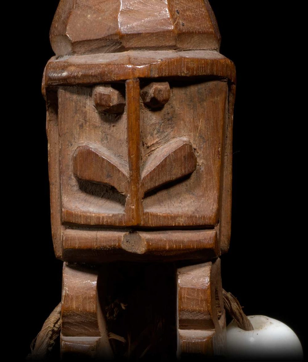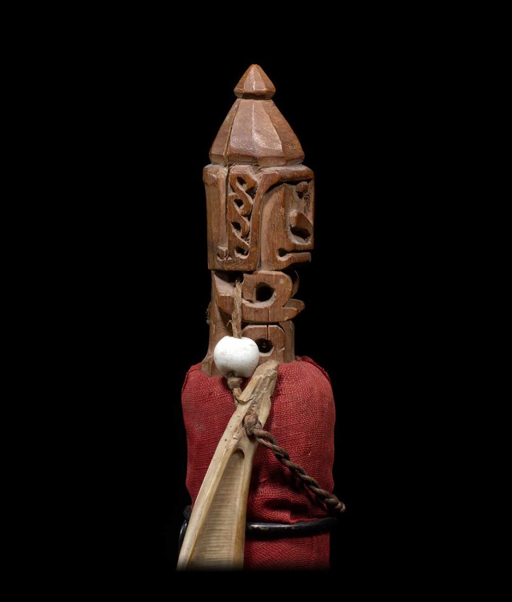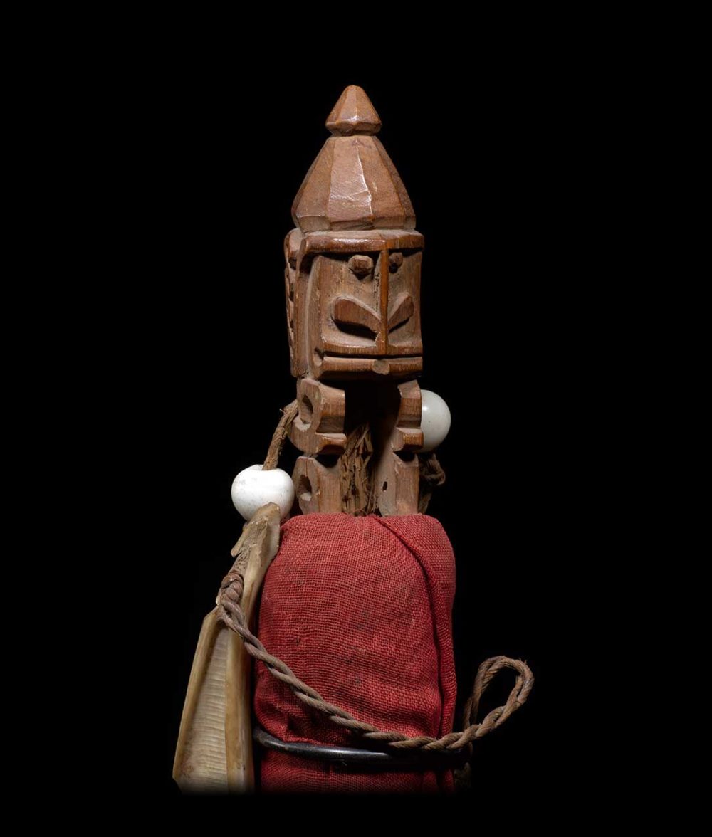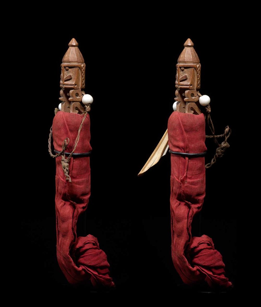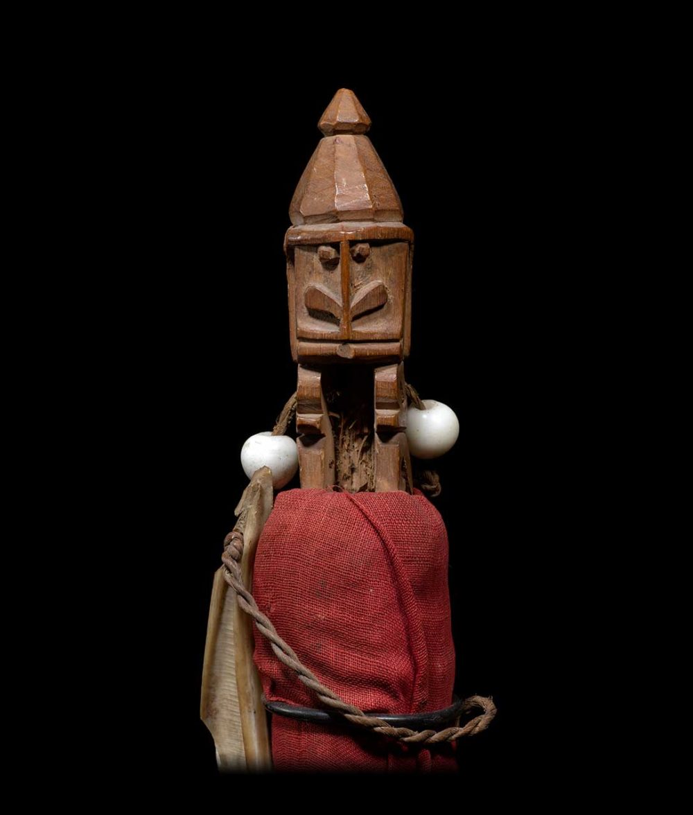 Korwars are a link between the dead and the living: hosts of the deceased’s spirit, they can be summoned with offerings to provide advice in time of important decisions (war expedition, important fishing trip). During the mourning period, the deceased body is draped in a red shroud, evoked on this particular korwar with the red textile piece still wrapping it. This amulet has a protective purpose for its bearer. Note the very fine carving of the face and the elegance of the stylized limbs. The amulet is pierced with a fiber cord that is adorned with two European glass trade beads and a bone attachment.