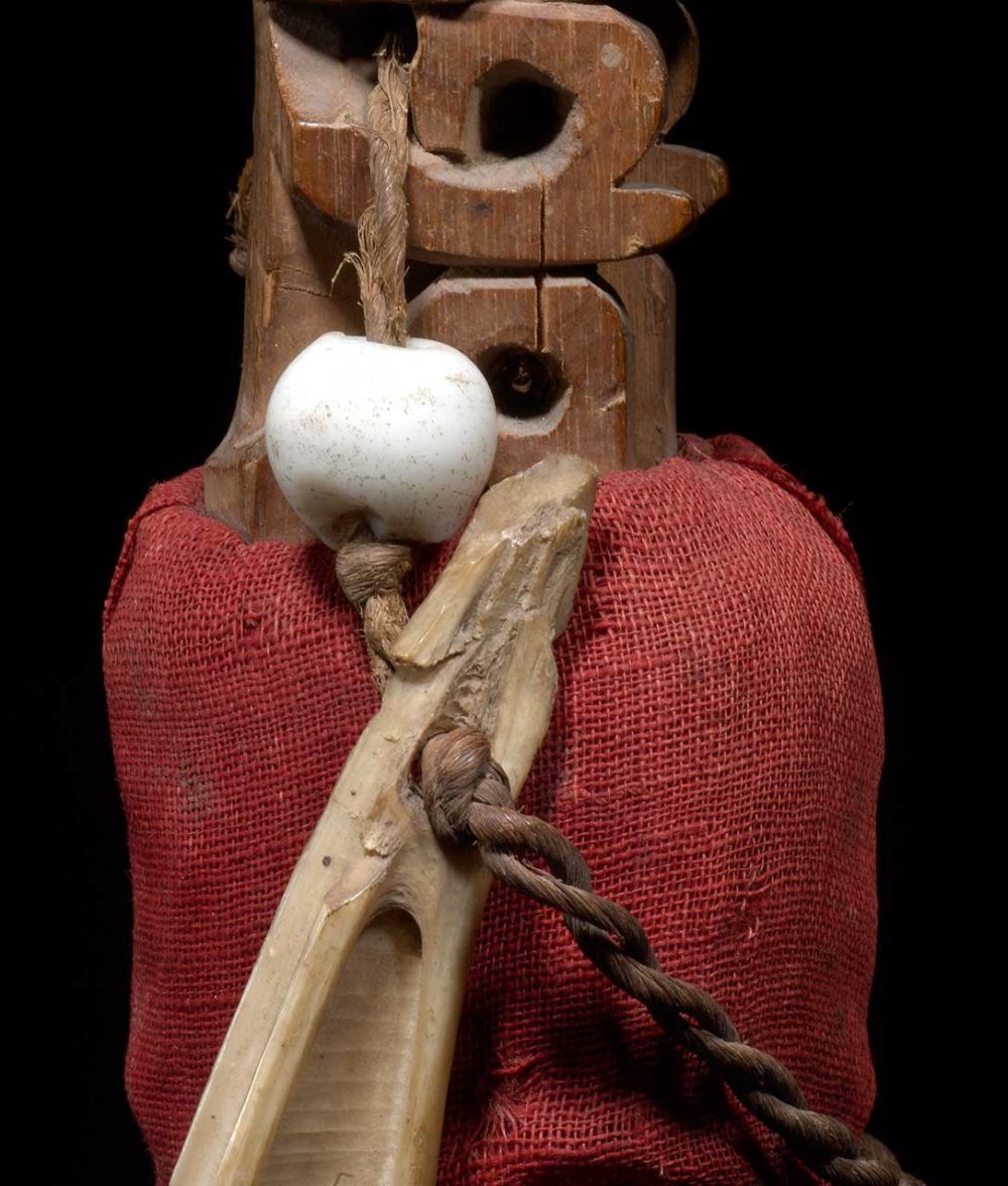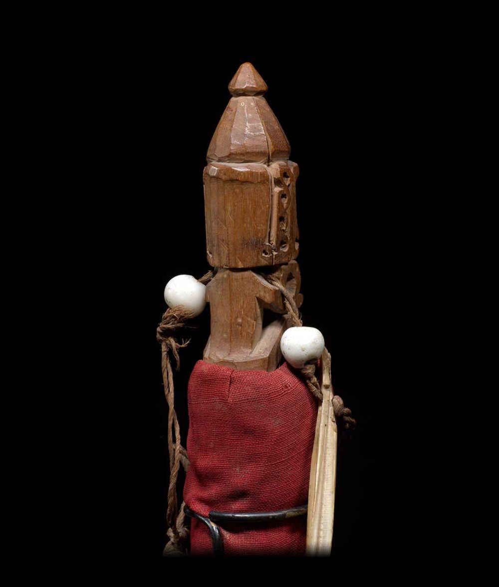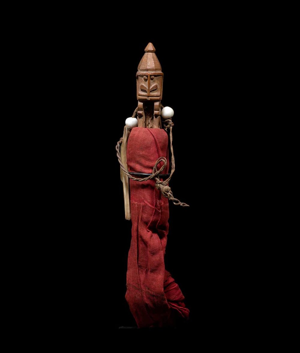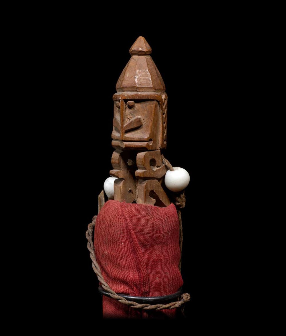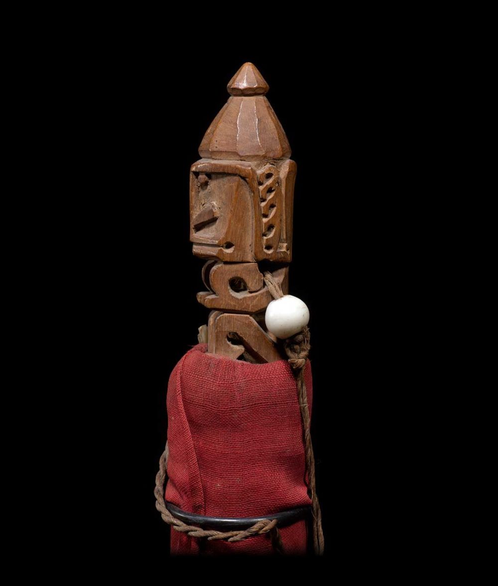 Korwars are a link between the dead and the living: hosts of the deceased’s spirit, they can be summoned with offerings to provide advice in time of important decisions (war expedition, important fishing trip). During the mourning period, the deceased body is draped in a red shroud, evoked on this particular korwar with the red textile piece still wrapping it. This amulet has a protective purpose for its bearer. Note the very fine carving of the face and the elegance of the stylized limbs. The amulet is pierced with a fiber cord that is adorned with two European glass trade beads and a bone attachment.