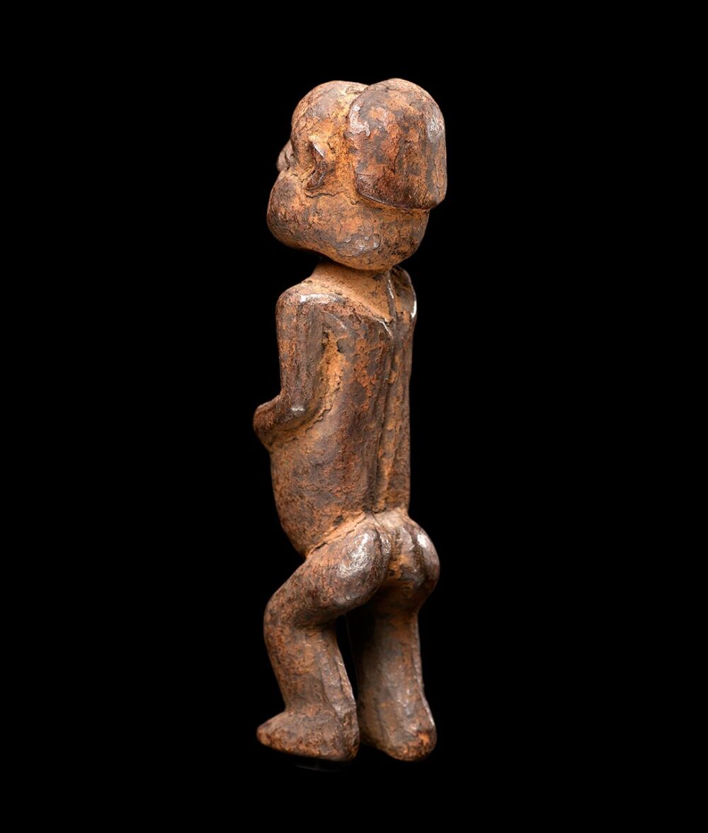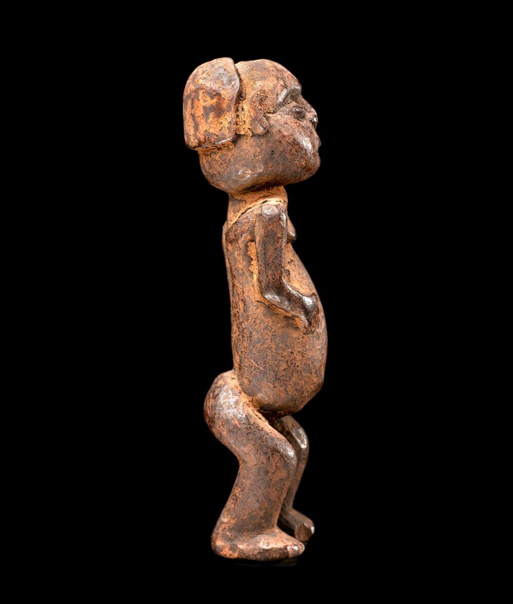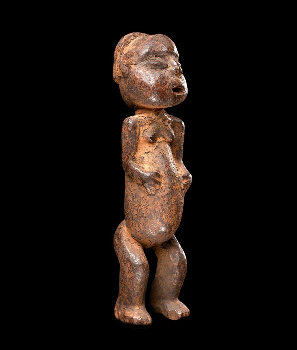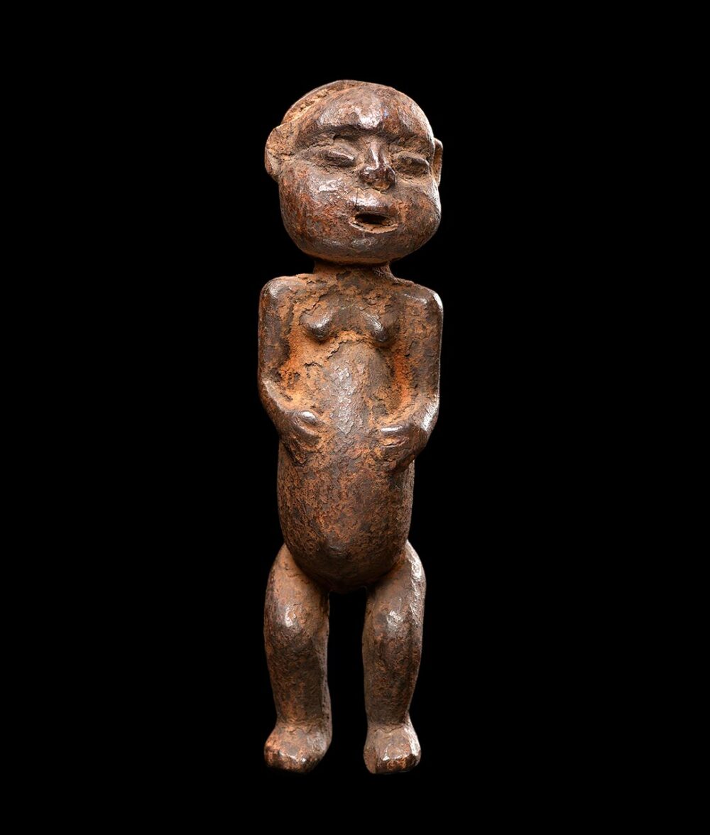 Standing on bent legs with a protruding belly with hands classically placed there, this figure is an early and very expressive example. The rounded head slightly tilts back, adding tension and movement to the sculpture. The patina is deep and encrusted from generations of use. Authentic figures of this type are becoming very scarce on the market, especially ones that possess exceptional qualities. The figure is carved from hard wood and it’s in excellent condition.
