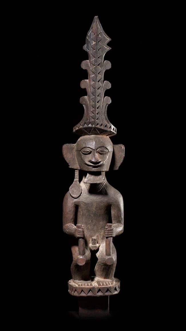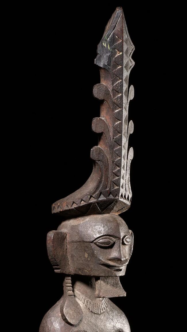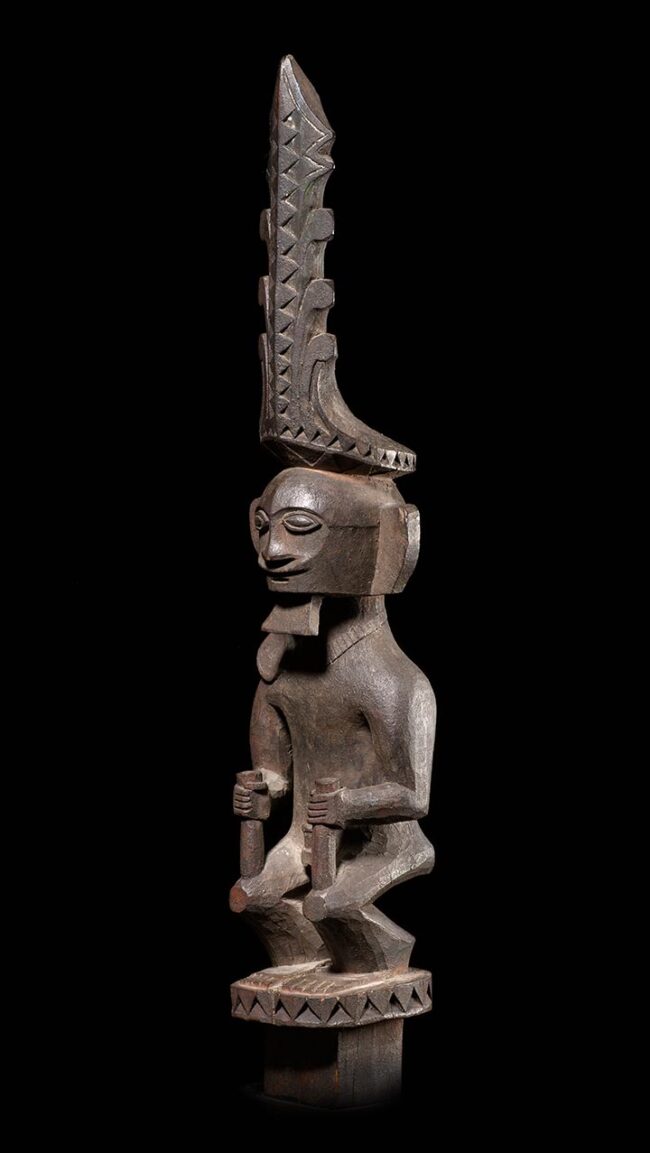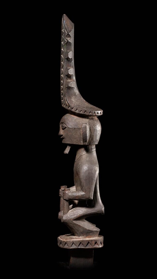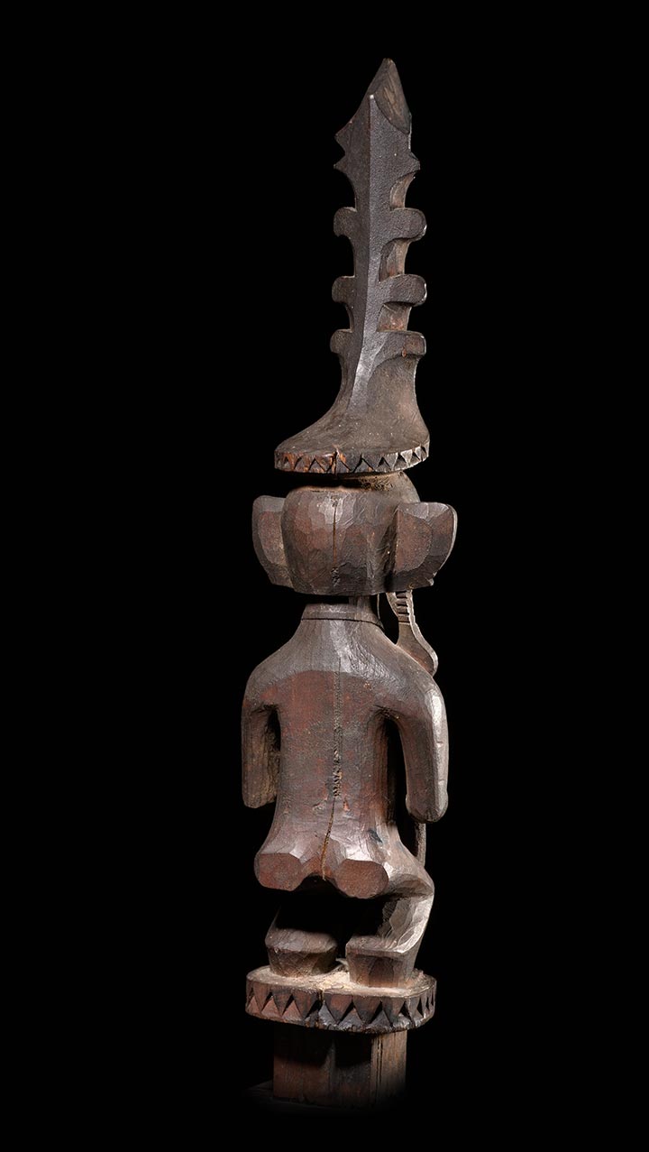 This royal Nias figure is of superb quality. The body is classically conceived with great tension and posture. The single long earring and elaborately carved crown are features only associated with great importance. The square shaped peg at the bottom indicates this figure was inserted on to a sacred altar. The deep blackened and encrusted patina occurred during generations of use and exposure. Carved from hardwood it’s in excellent condition.