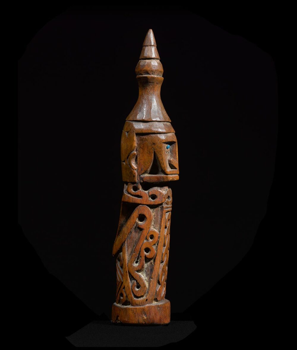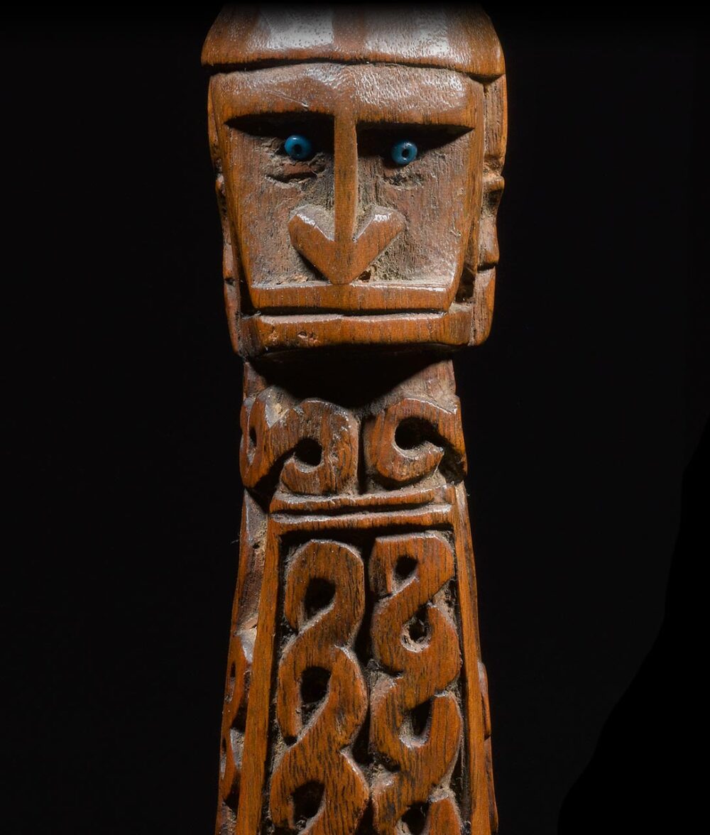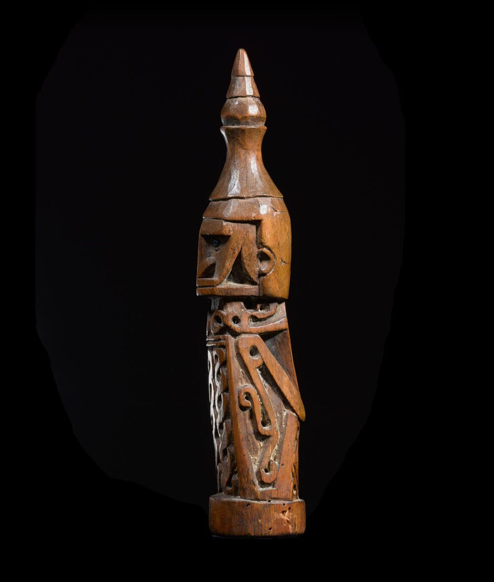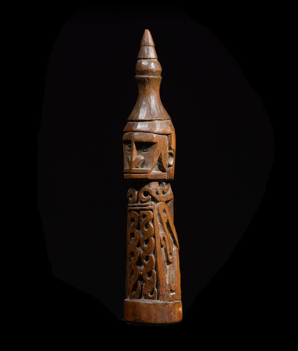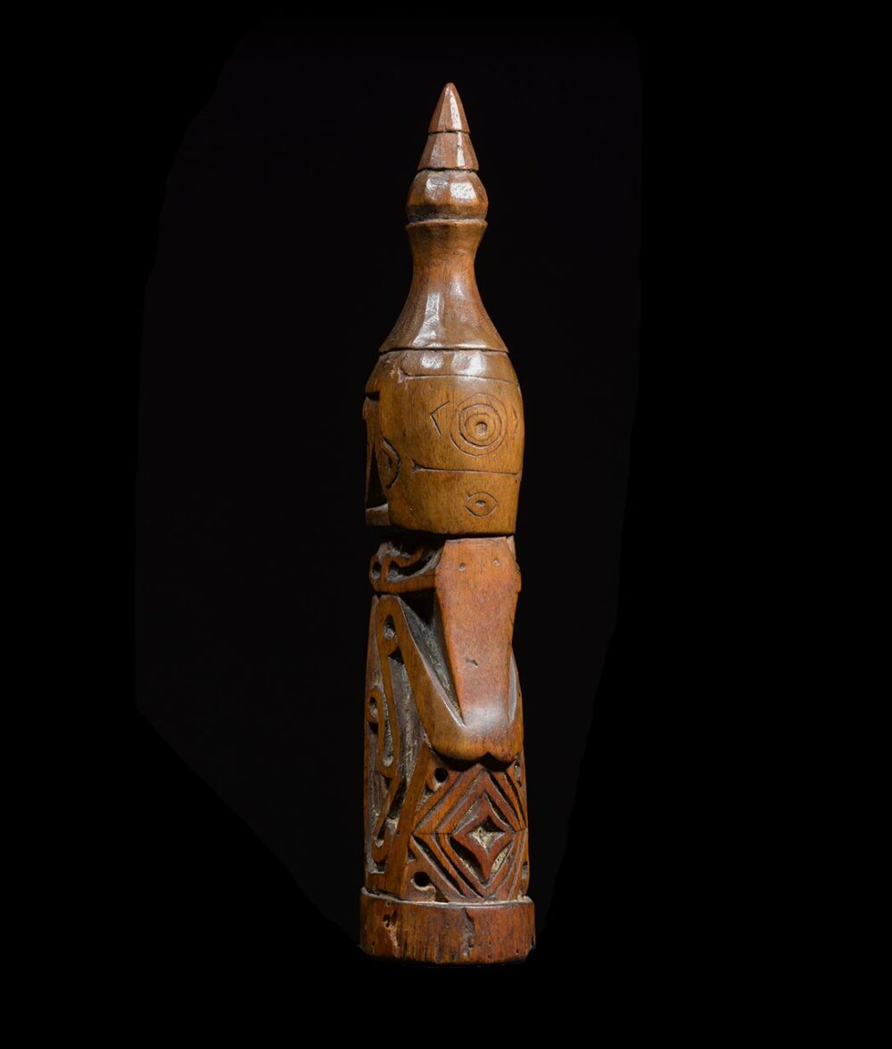 This amulet figure is unique, as it is quite large, approaching the scale of a full sized ancestor figure. Korwar amulets represent an ancestral spirit and served many functions. They were attached to objects in order to prevent theft, worn by young men in order to attract girls, as well as used to enhance success during hunting and warfare. This particular example is masterly conceived. It has a large head with arrow shaped nose and glass inset eyes. The elongated body with scrolling limbs and arched back sits behind a large shield richly decorated with classical ornamentation. Carved from hard wood it’s in excellent condition.