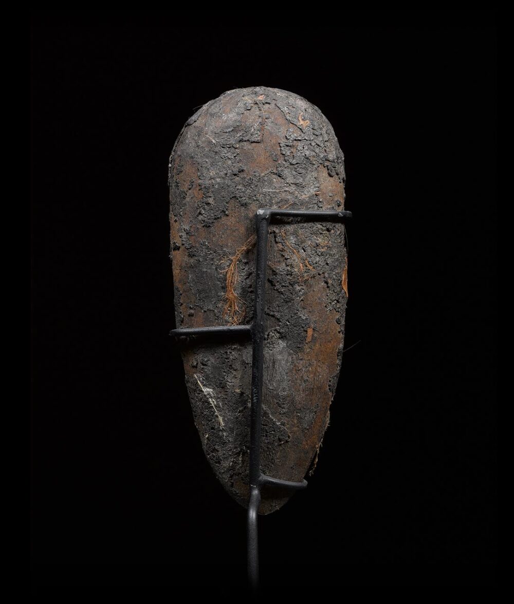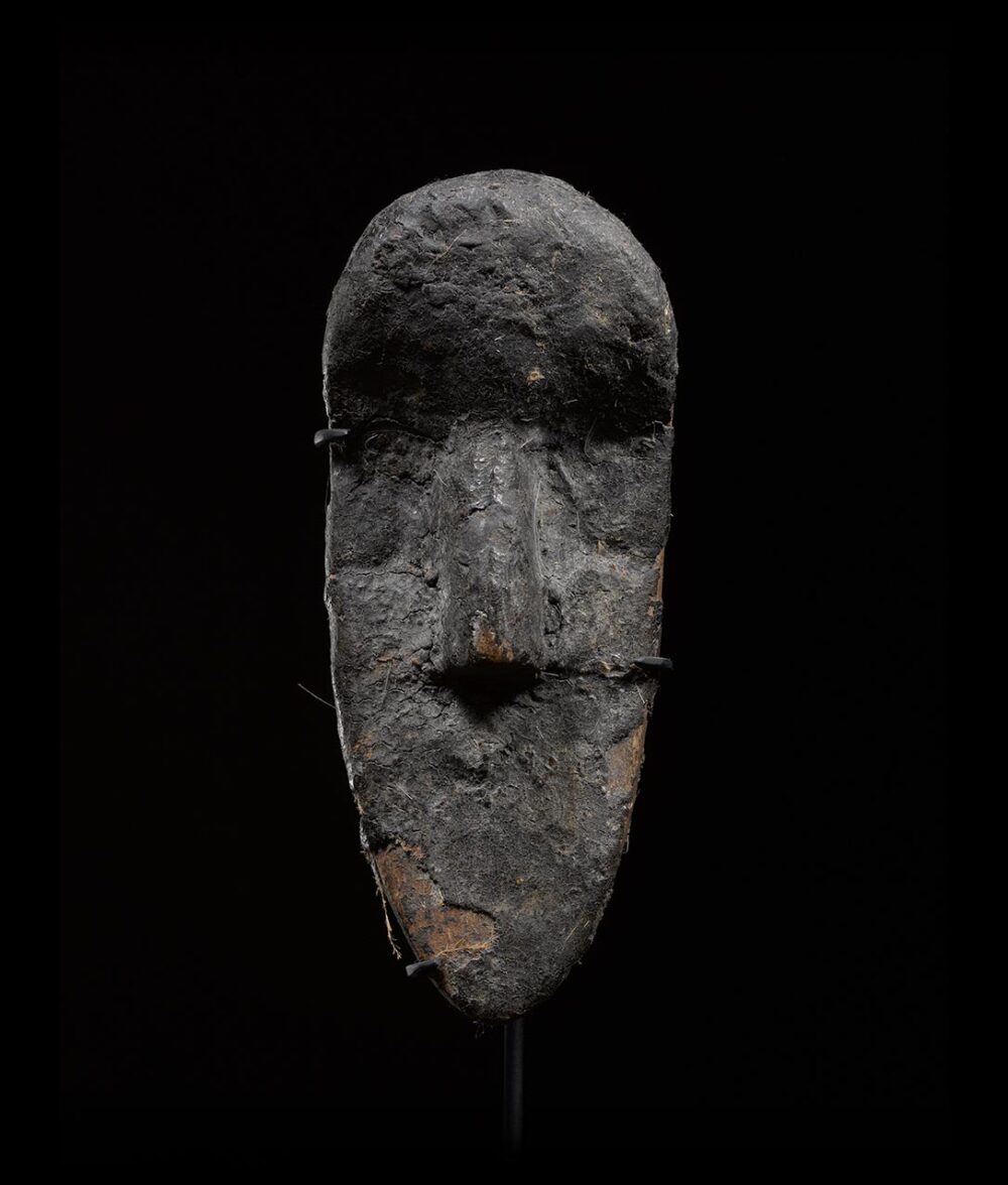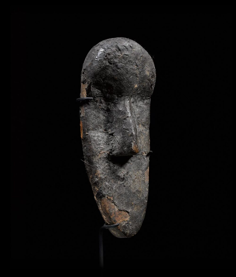 The tribes of Liberia excel at creating miniature masks and produce more than any other culture in West Africa. The variety in form and expression is extensive. Passport masks created by the Loma are very rare to find. These miniature personal masks replicate the forms of masks used in powerful ceremonies and dances. They protect the owner and are generally carried on the person. This examples rich encrusted patina makes it all the more intriguing, and attests to the numerous ritual offerings and libations it received to enhance its power and effectiveness.