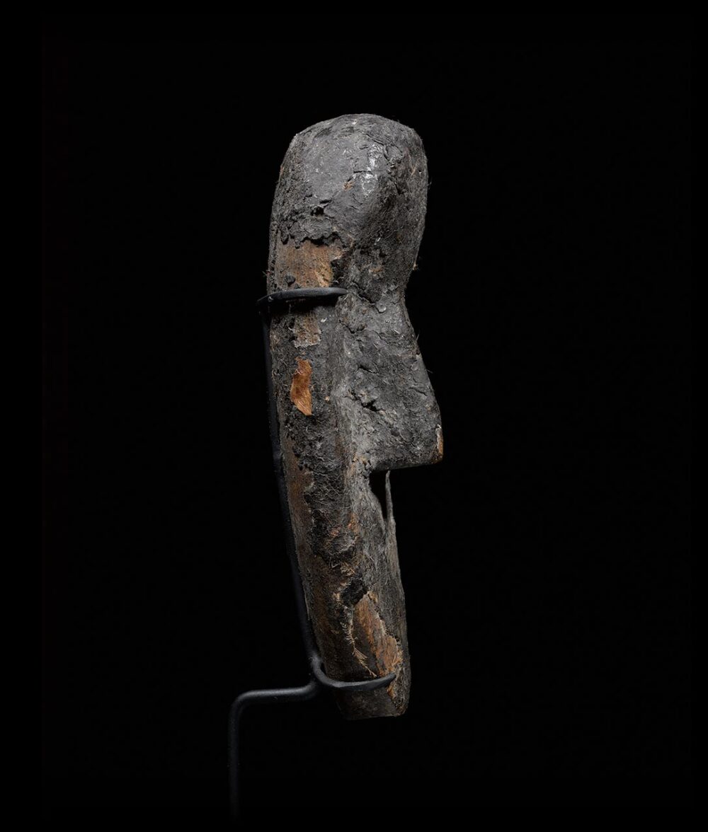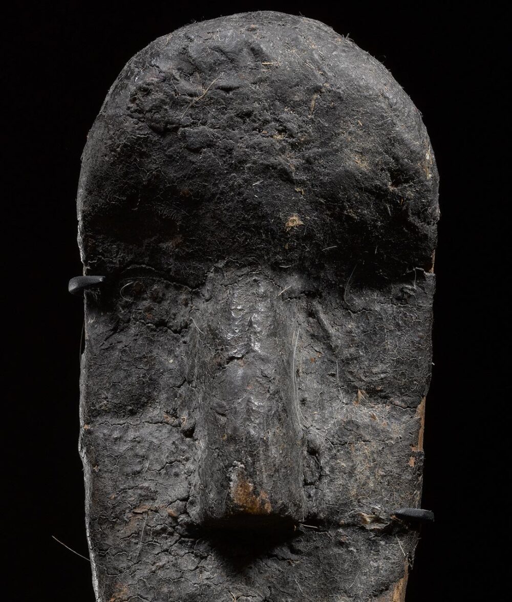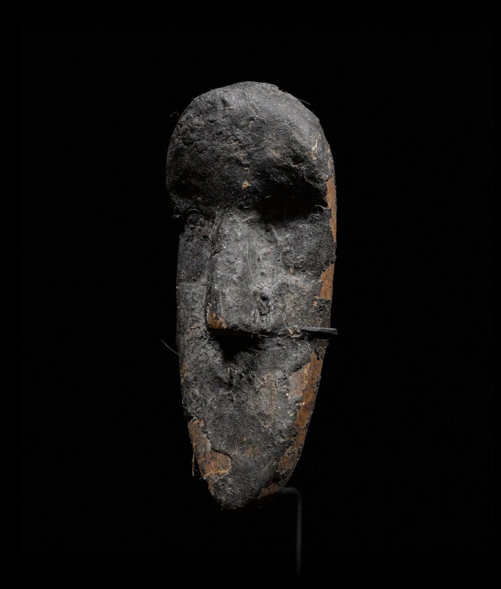 The tribes of Liberia excel at creating miniature masks and produce more than any other culture in West Africa. The variety in form and expression is extensive. Passport masks created by the Loma are very rare to find. These miniature personal masks replicate the forms of masks used in powerful ceremonies and dances. They protect the owner and are generally carried on the person. This examples rich encrusted patina makes it all the more intriguing, and attests to the numerous ritual offerings and libations it received to enhance its power and effectiveness.