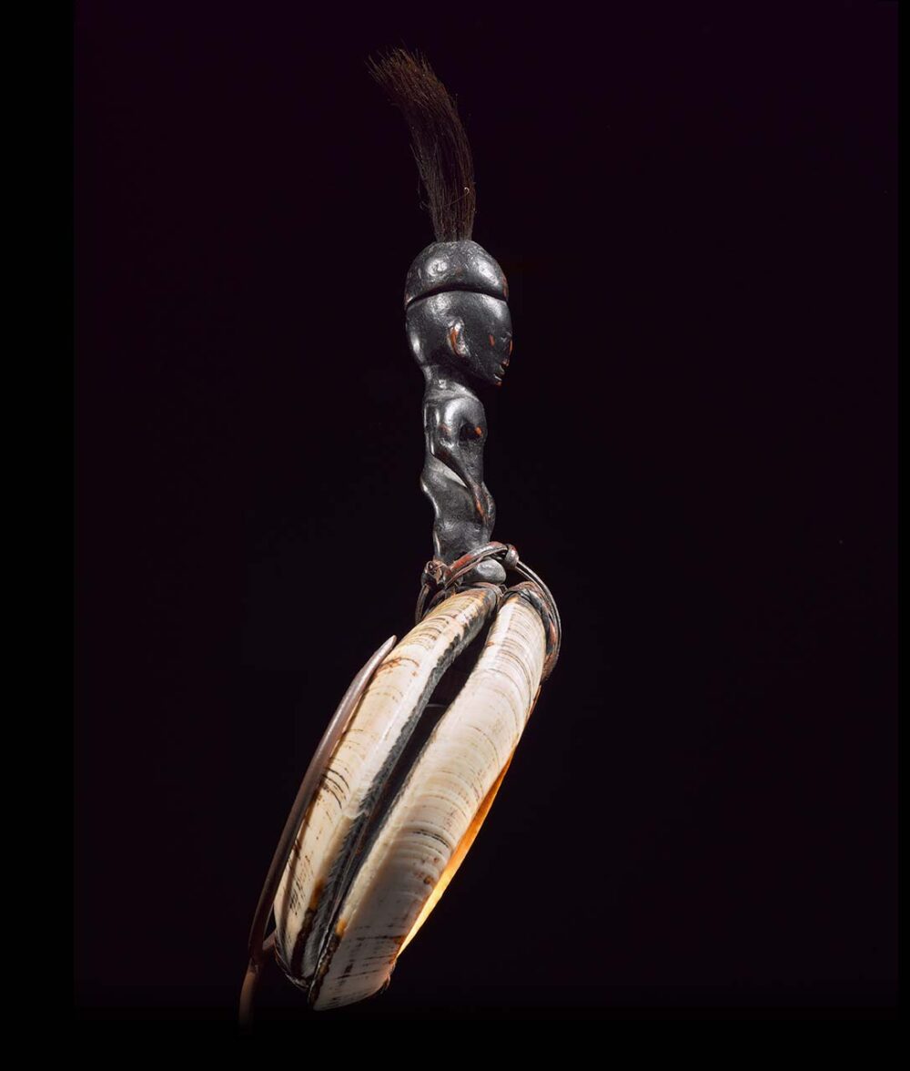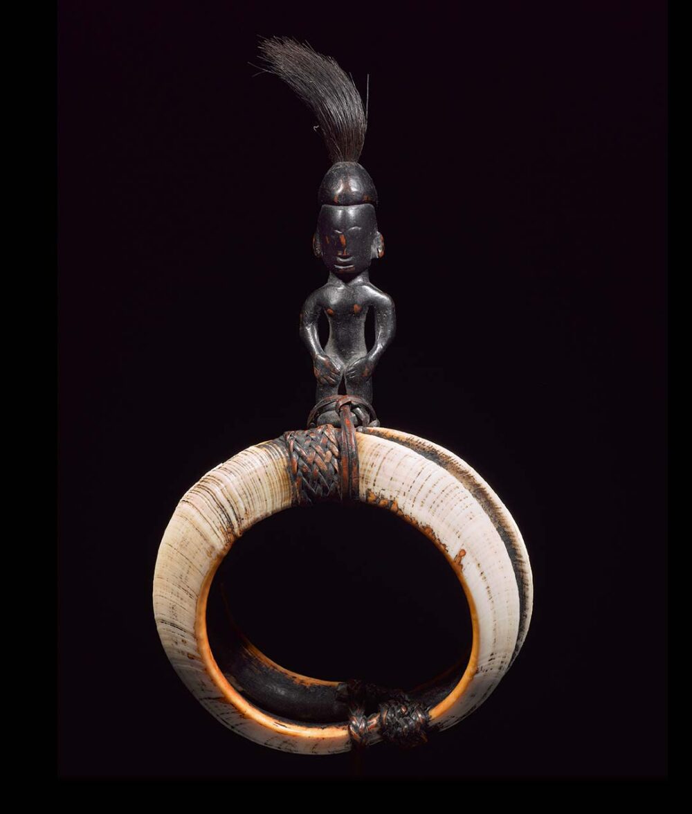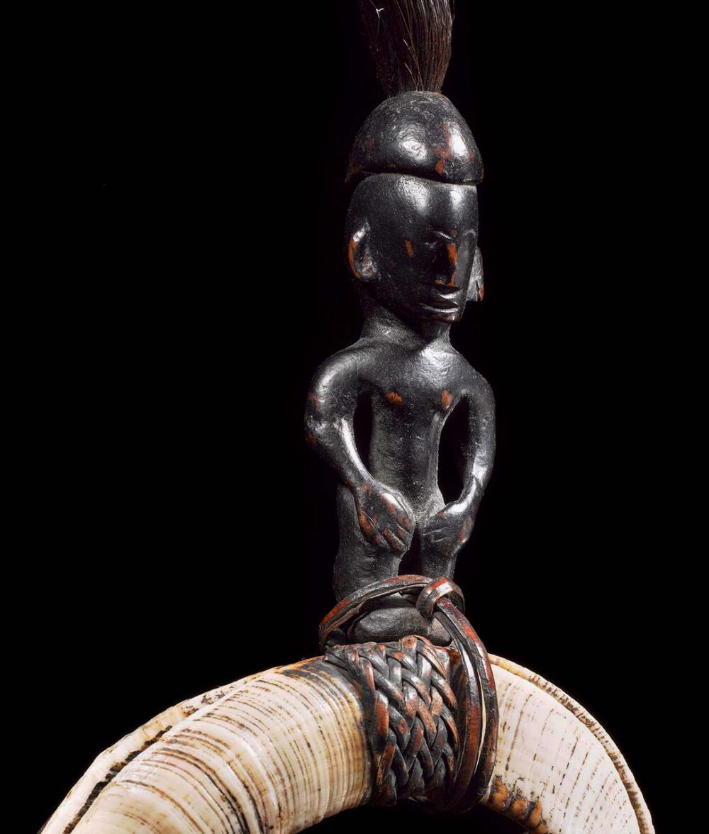 Carved wood, rattan, boar tusks and hair