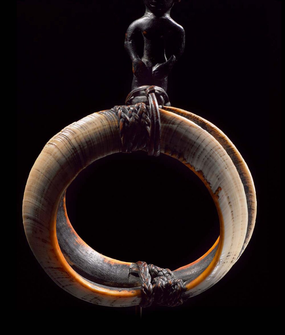 This Tangkil boar’s tusk armlet with an attached small standing wooden Bulul figure is made of two wild boar’s tusks, lashed together with rattan to form a circle. This armlet is worn on the upper arm by tribal warriors as an ornament before head hunting. The boar’s tusk empowers the wearer with the ferocity, endurance, and strength of a wild boar.