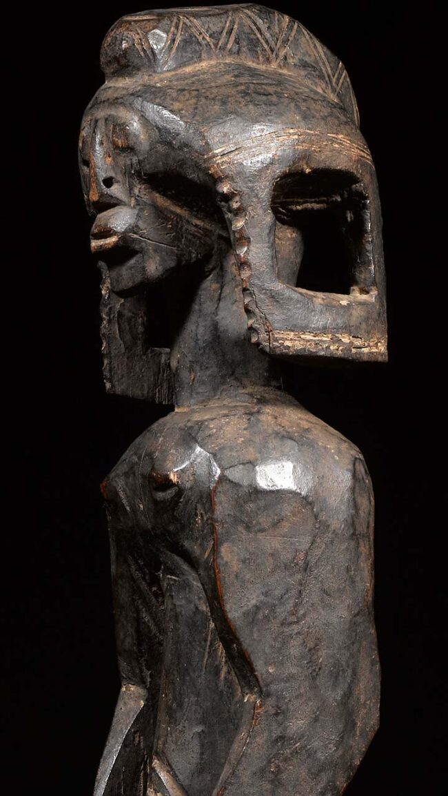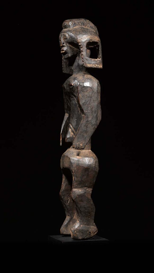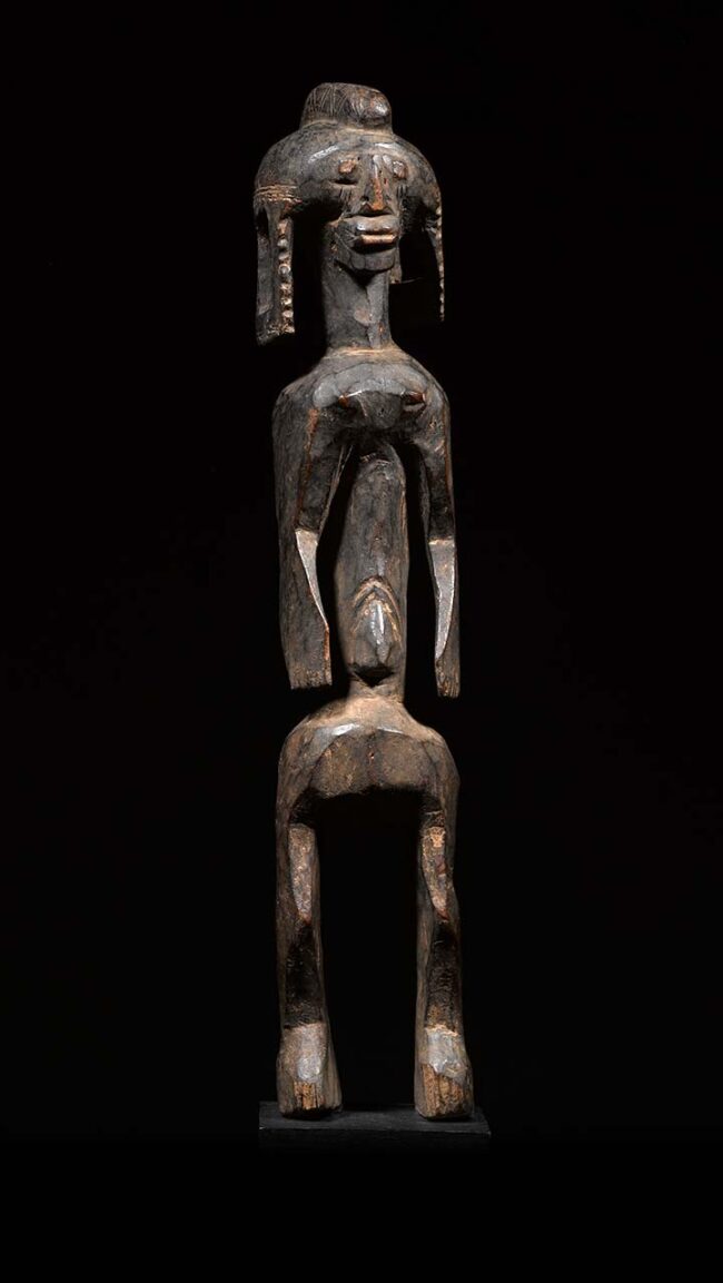 The Mumuye live near the banks of the Benue River in eastern Nigeria. They used sculptures called Lagalagana in different rituals: the figures played a central role in ancestor worship and served as interceptors between the spirit world and that of men. This figure has angular legs and ribbon-like arms that wrap around the torso with its elbows clearly marked. The head displays a coiffure in the form of a crest. The scarification on its face is delineated and the nasal septum is perforated for the insertion of a short section of a stalk of Guinea corn. Both scarification and nasal septum ornamentation reflect local custom. Its slightly tipping torso, animated arms and body and elongated earlobes; are some of the other notable features which exemplifies what is most compelling about Mumuye art. The patina is deep and rich from handling.