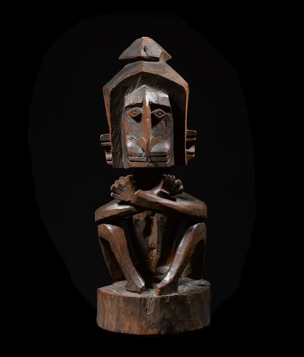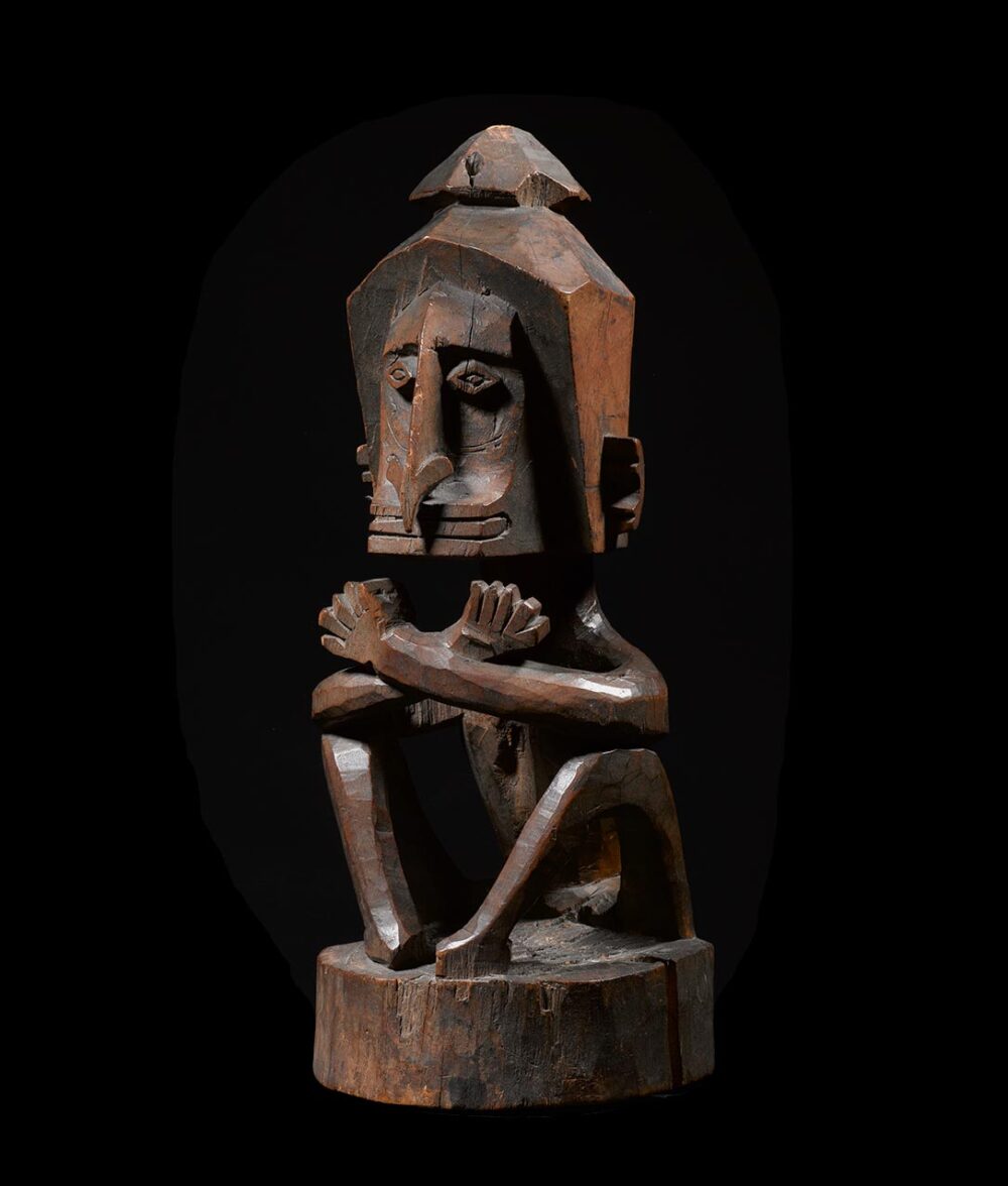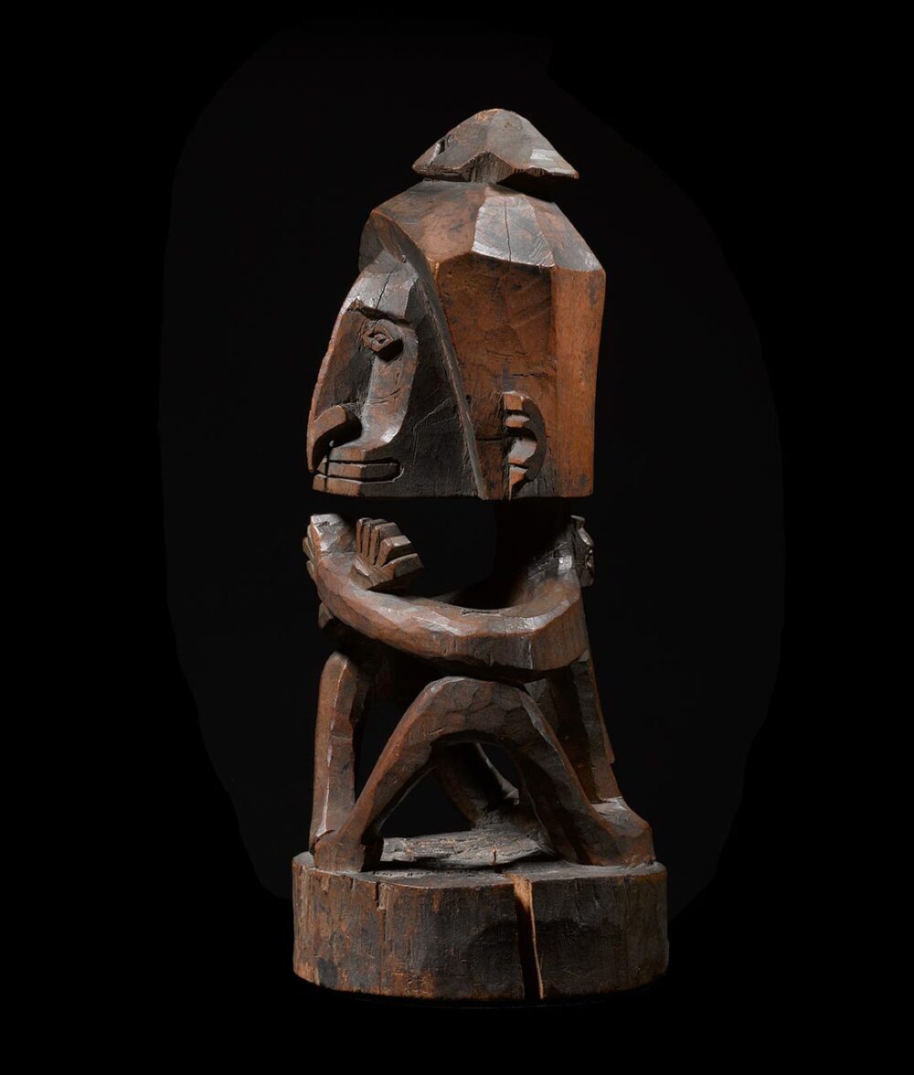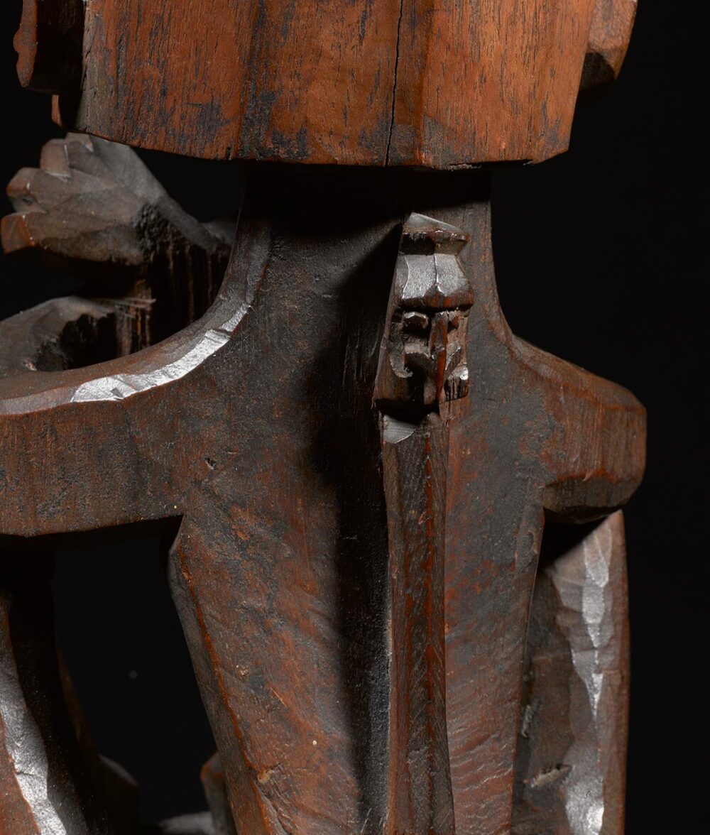 The present Korwar, a ritual effigy of a deceased person, is unquestionably a very fine example of a style which we can attribute to the southcoast of Biak Island. Whereas the prominent head is angular and rather massive, the body parts, limbs and torso, are rendered in a curving, slender manner, in execution accentuating the confines of a cylinder. The presence of a diminutive figure at the back represents an amulet. According to an early missionary report, (Ottow & Geissler 1857) amulets were worn in the Doreh Bay on the back and tied around the neck by a string. Corbey (2019) illustrates this with a watercolor by Jules-Louis-Lejeune, draftsman on the Duperrey expedition between 1822-24. Apparently, this custom was also found in the Biak area.