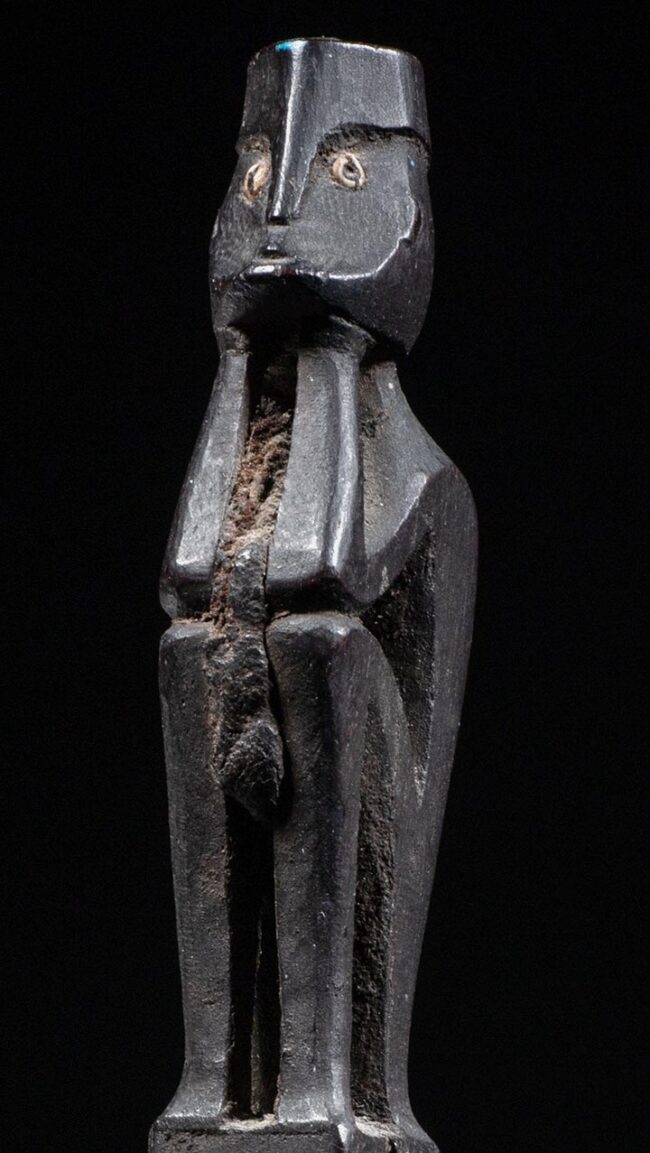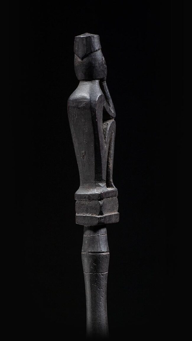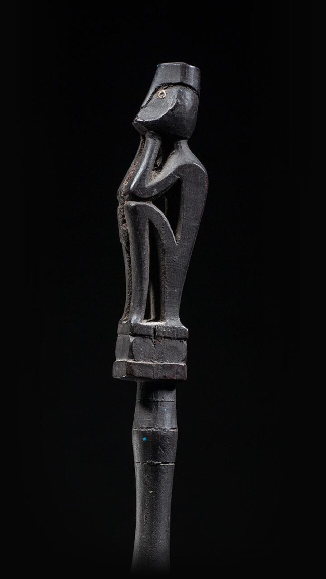 This is an exceptional example of a tun tun. Its expressive face with inlayed glass eyes and curvilinear body are elegantly stylized. The well-balanced proportions of this tun tun, make it a masterly carving. In between its legs the original magic bundle is still present, which is very rare to find. The wood is very hard and it has a dark crusty patina,