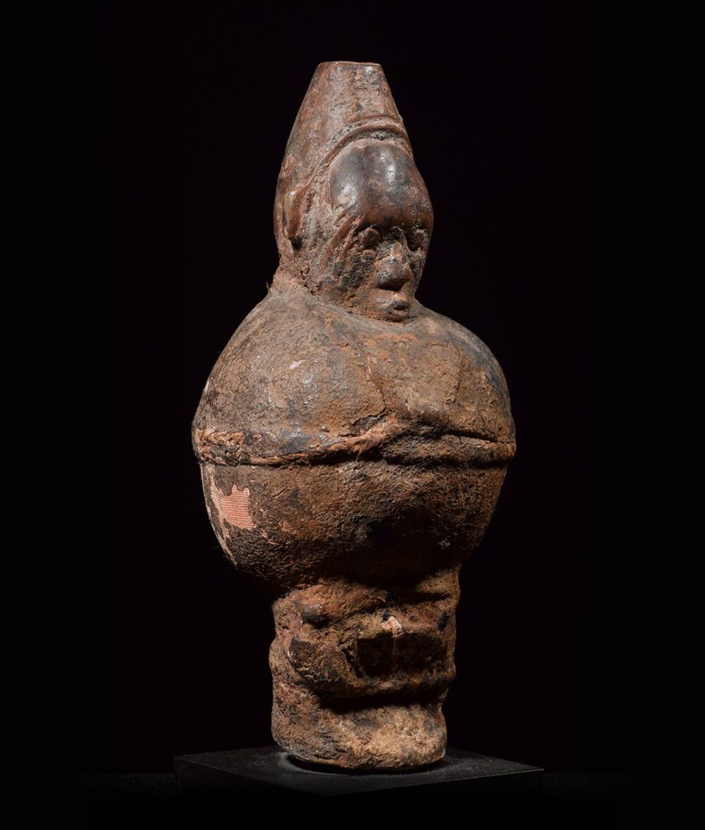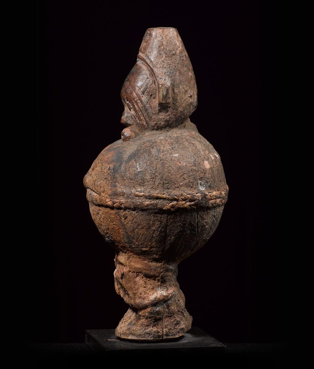 The Teke are famous among the surrounding tribes for the supposed efficacy of their fetish figures. This figure exhibits an elaborate fetish bundle consisting of a ball-like shaped mixture of earth and various organic medicines. It is covered in cloth and cord. Emerging from the top and bottom of the magic bundle are the figures head and conjoined legs. The figure creates an astonishing effect considering that only the head and legs are visible. The deep encrusted dark brown patina only adds more to this objects allure.