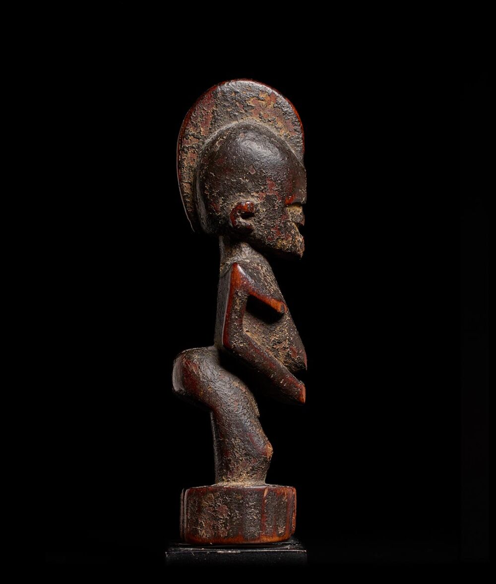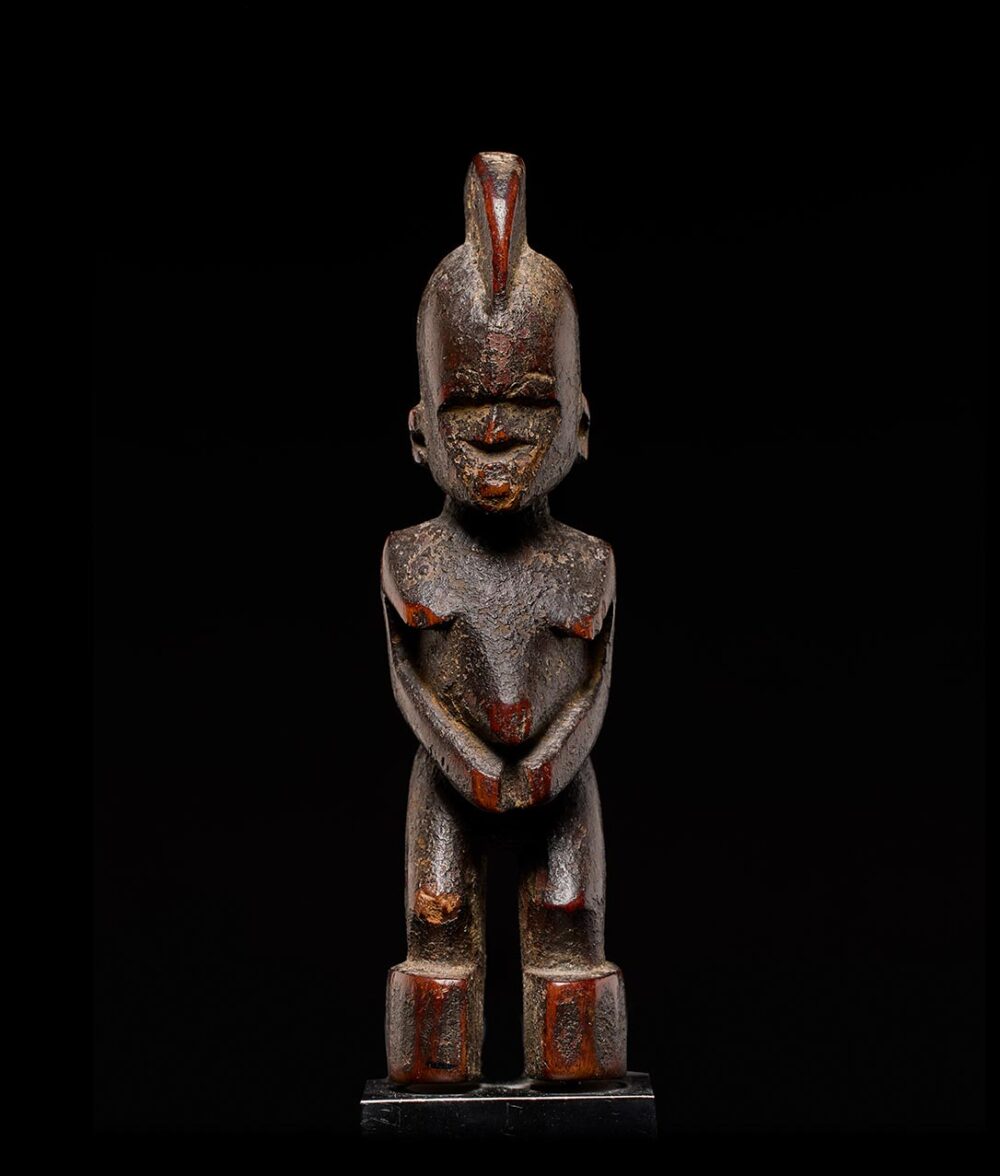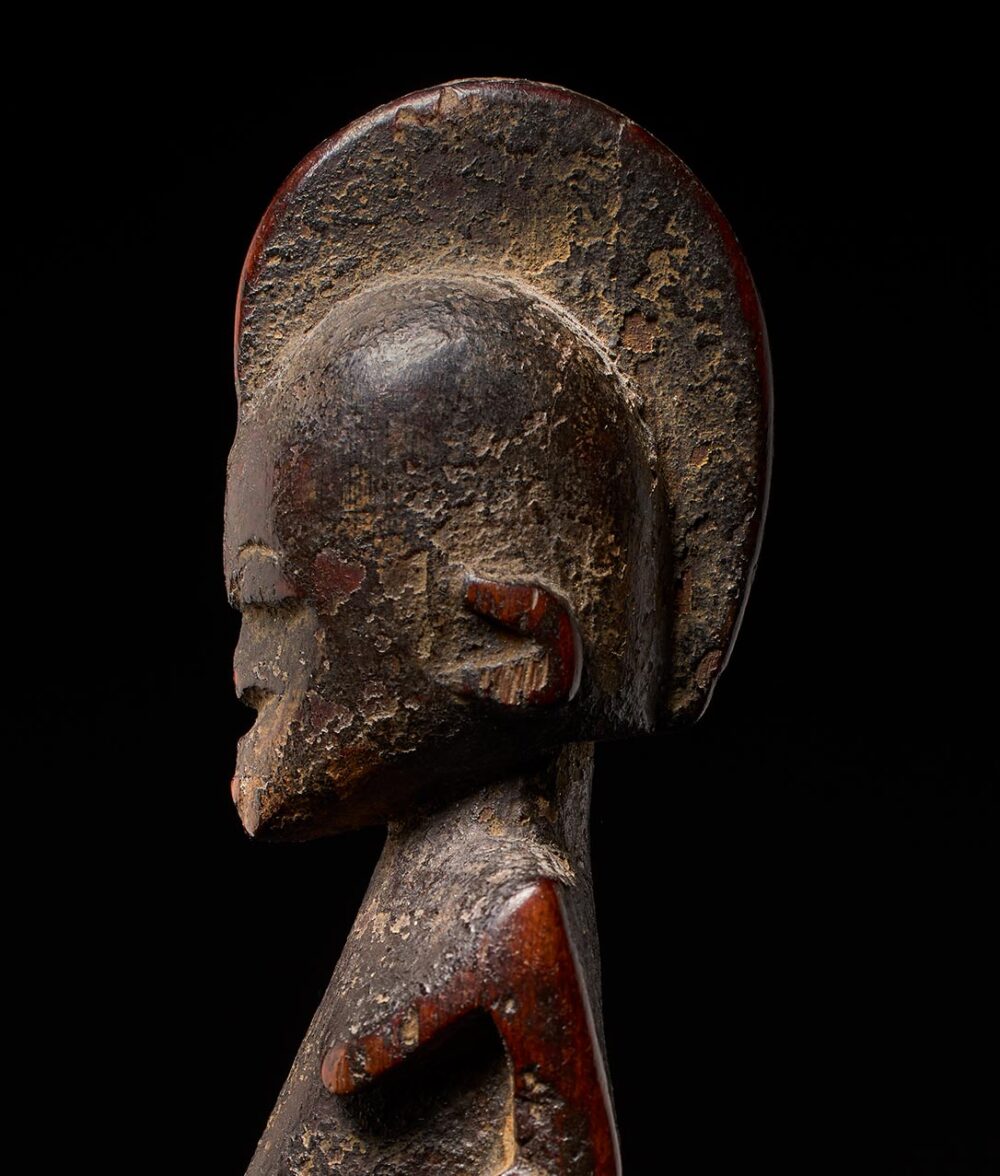 Among the Lobi, each male engages in the art of figure carving, resulting in a vast array of inventive and varied expressions. This particular artisan stands out for both the inventive quality of their work and its high demand among collectors. This specific piece boasts an extraordinary, deep, and encrusted patina—a testament to its antiquity. The passage of time has obscured the facial features, lending an enigmatic aura that speaks to the figure’s extensive history of use.