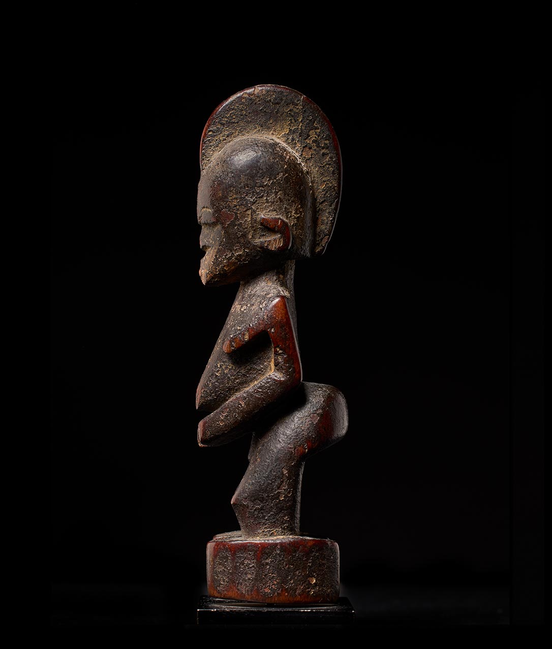 Among the Lobi, each male engages in the art of figure carving, resulting in a vast array of inventive and varied expressions. This particular artisan stands out for both the inventive quality of their work and its high demand among collectors. This specific piece boasts an extraordinary, deep, and encrusted patina—a testament to its antiquity. The passage of time has obscured the facial features, lending an enigmatic aura that speaks to the figure’s extensive history of use.