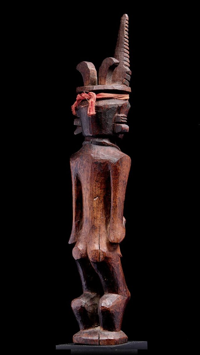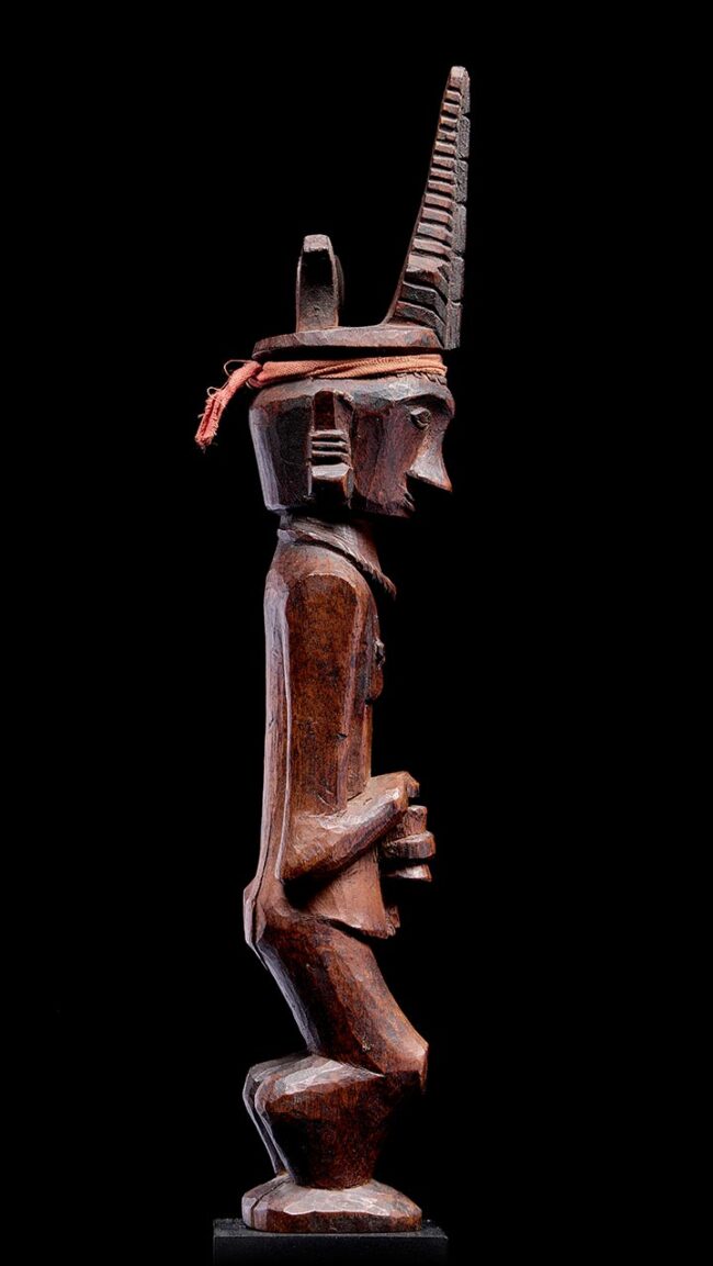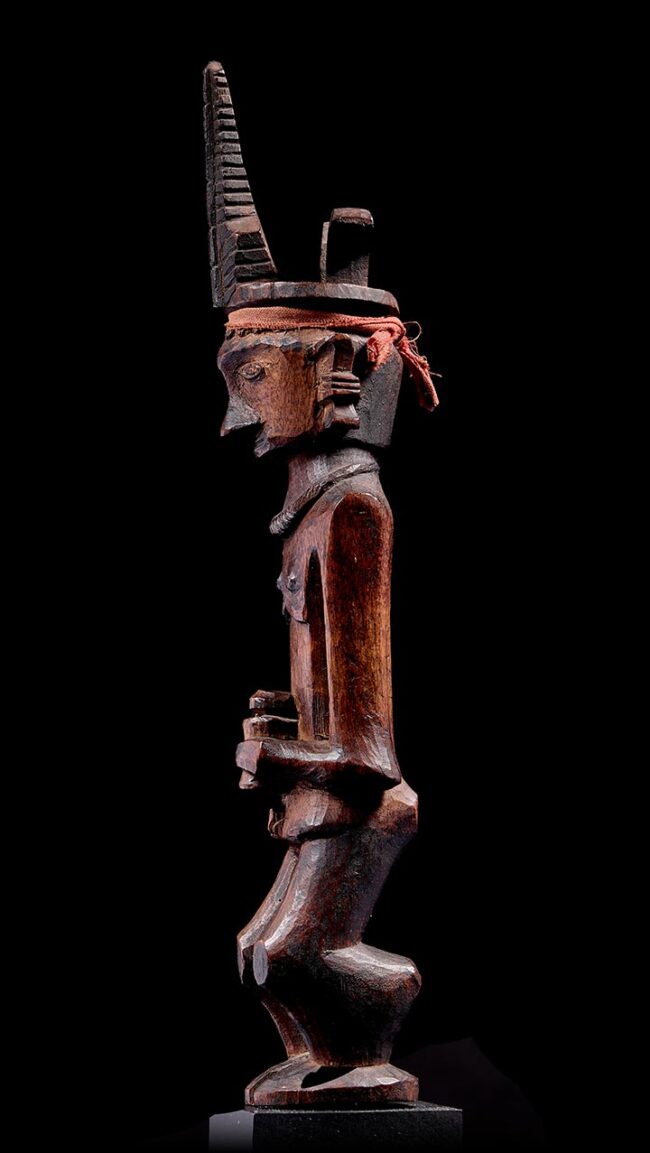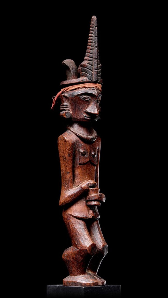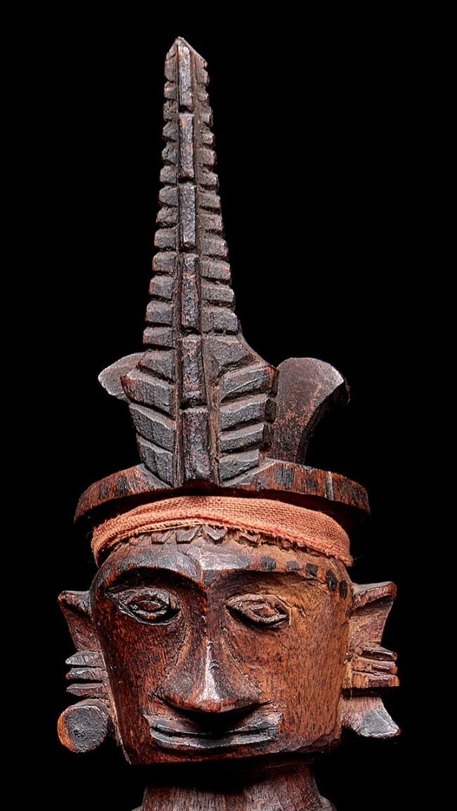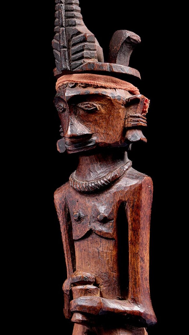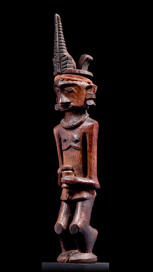 The figure’s aesthetic attributes are equally striking. The standing figure is depicted with bent legs, holding a container between its hands. This container is likely a betel mortar and pestle, a common symbol of wealth and status in the region. The tall crown atop the figure’s head further emphasizes its importance and authority. Carved from hardwood, the adu zatua figure has a dark brown patina that enhances its visual appeal. Both the stone and wood sculptures of Central Nias are angular and far more stylized than those found in the north and south.