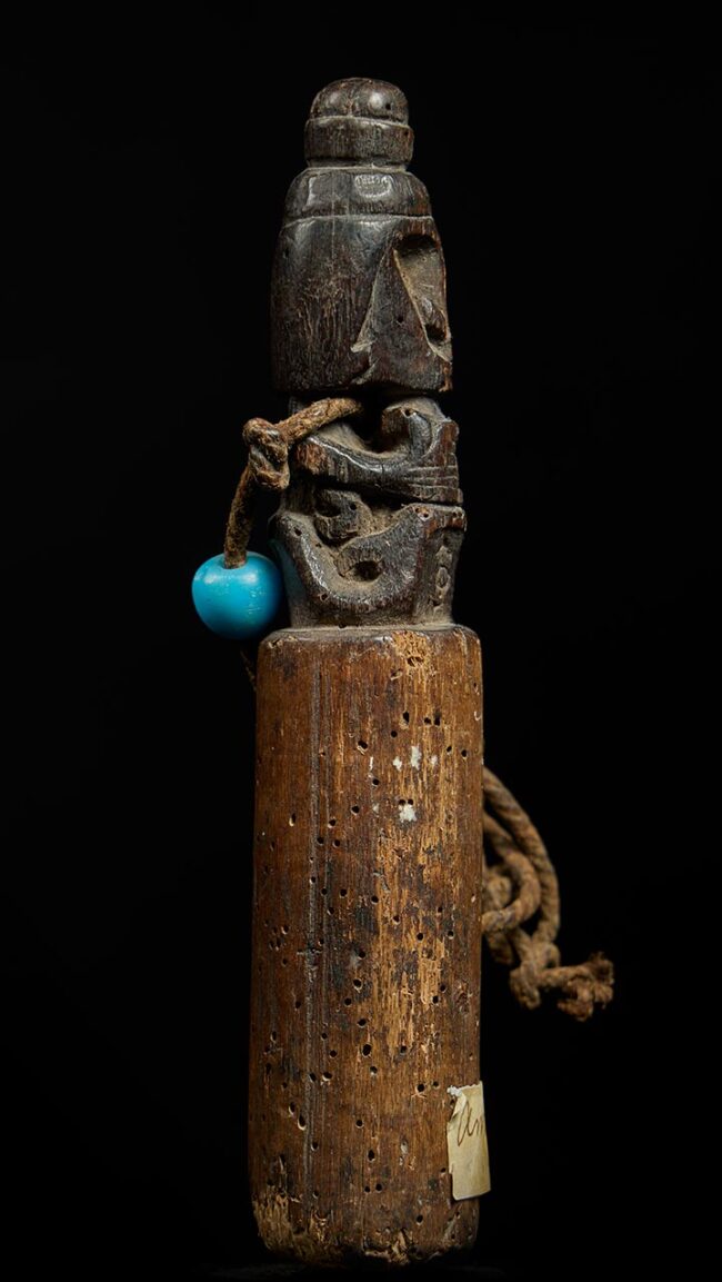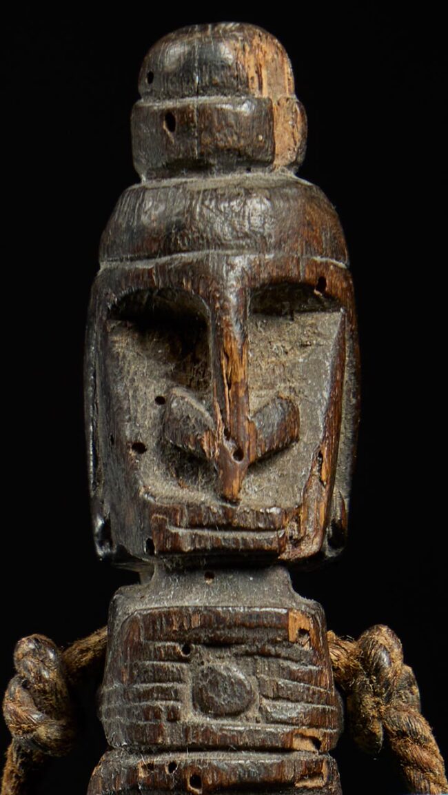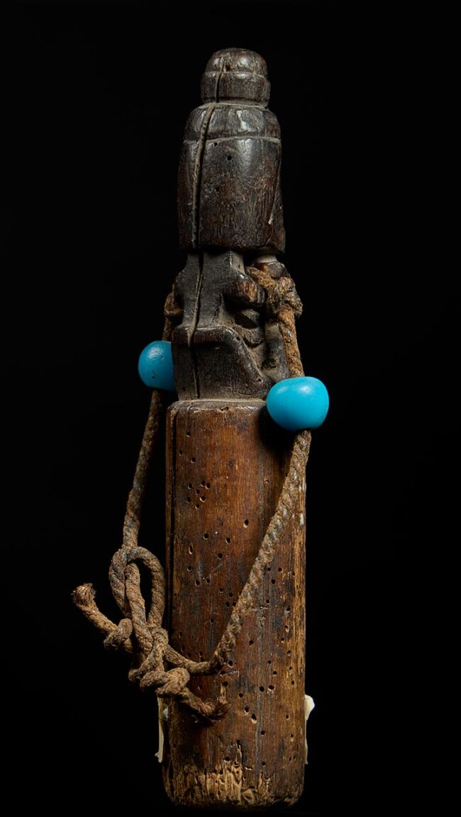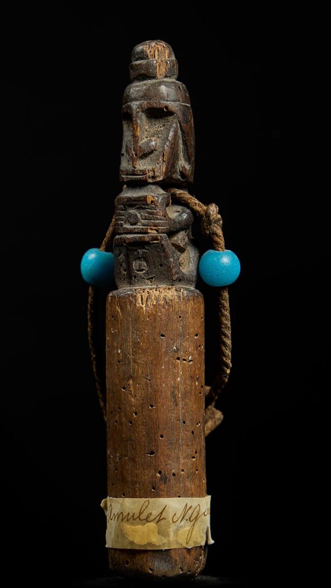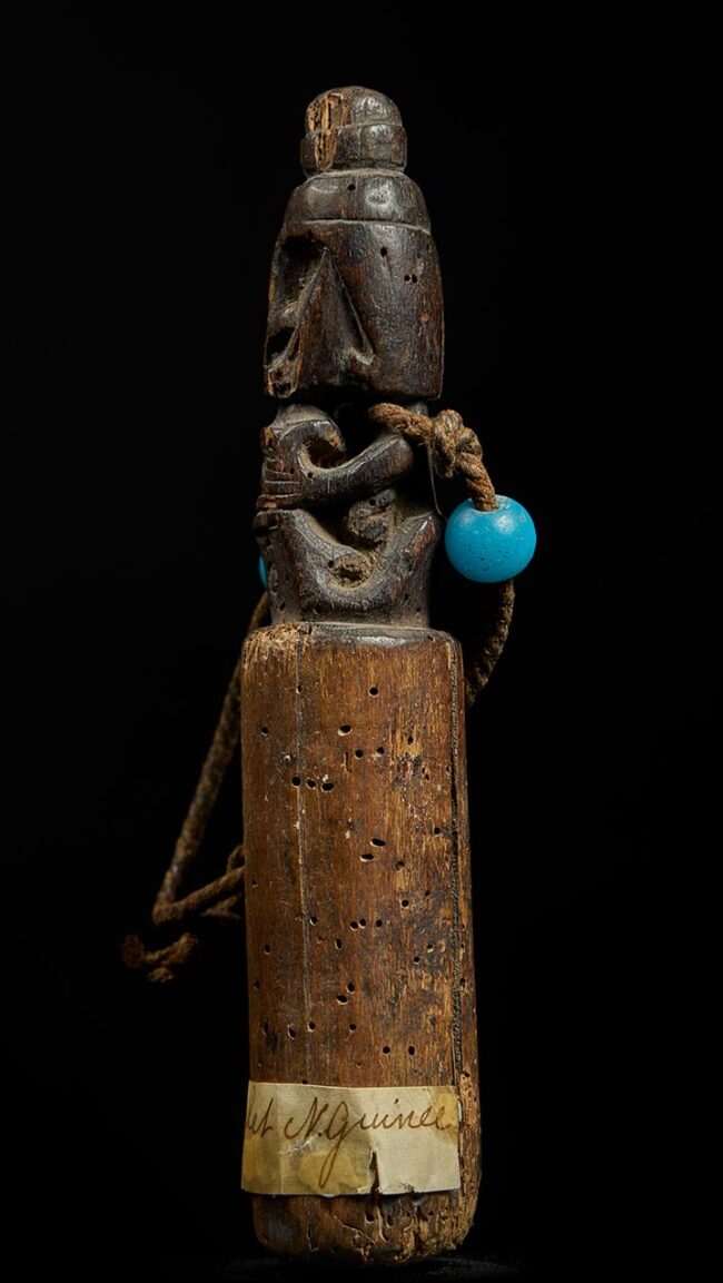 Korwar amulets were believed to grant men courage and protection against disaster and were worn on the body. Carved from wood, this example features a standing figure at one end, designed in a classic style. Scrolling-shaped carvings represent the figure’s limbs, while the rectangular face with an arrow-shaped nose is distinctive of Korwar aesthetics. The original blue glass trade beads are still attached to the body of the amulet with hand-spun fiber cord. A very old label is still affixed to the bottom of the amulet.