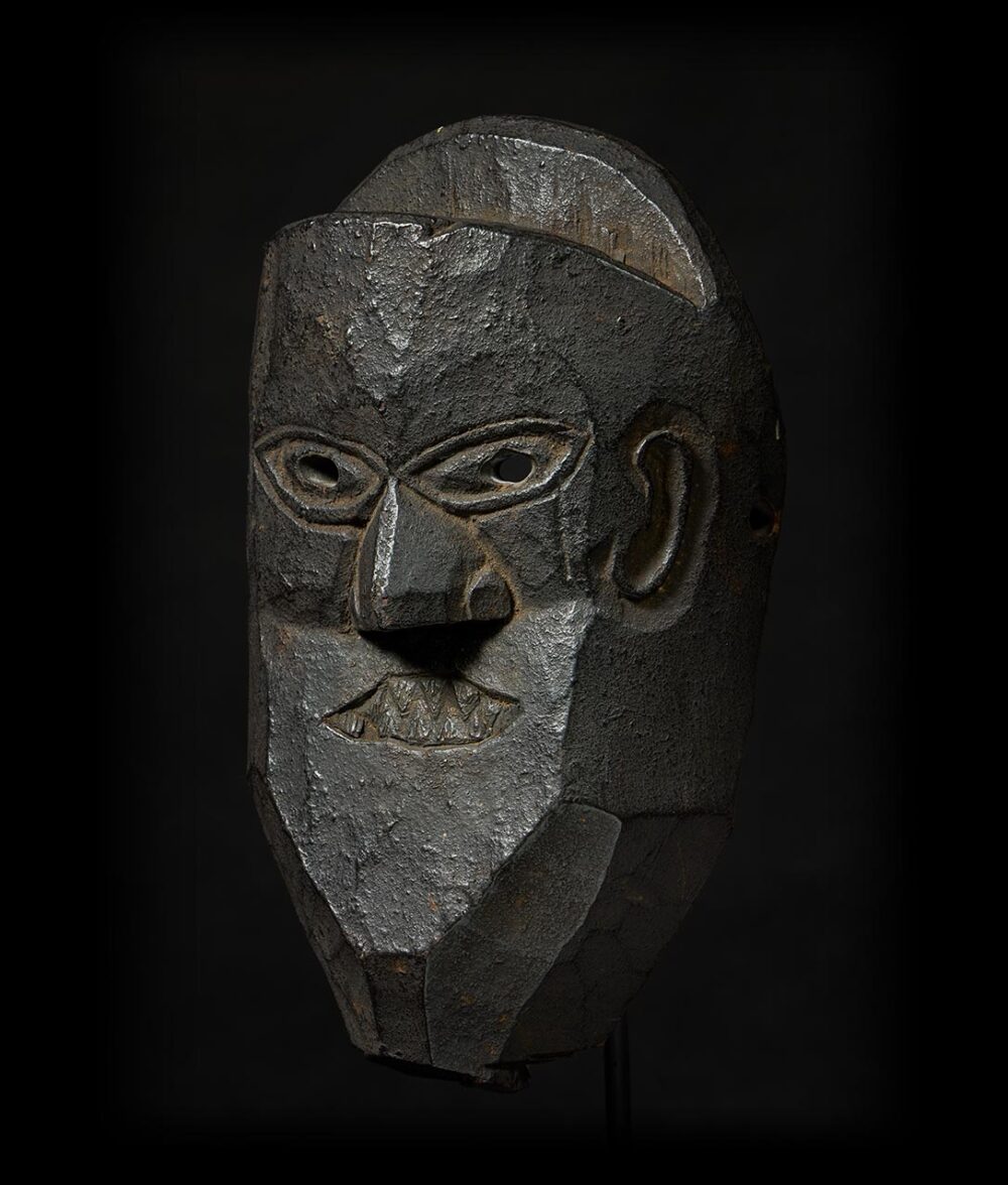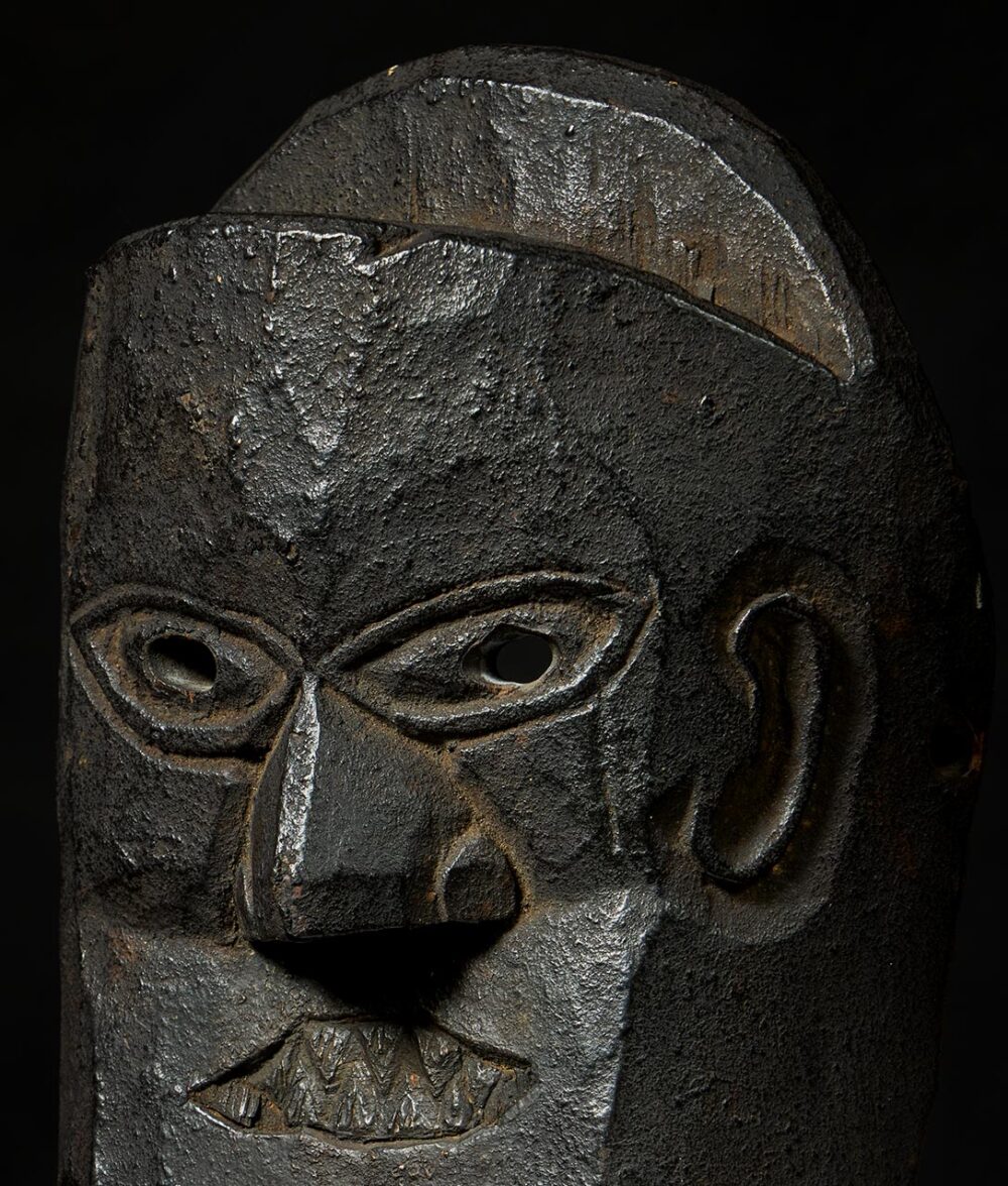 The shaman mask featured here is characterized by its simplicity yet profound expressiveness. Carved from hard, brown wood, it showcases a prominent, domed forehead, large oval eyes, a broad nose, and hooked-shaped ears. The open mouth reveals sharp, pointed teeth. The faceting and knife marks on the lower half of the mask complement its overall design. Despite its abstract simplicity, the mask exudes a remarkable powerful presence. Both the front and back surfaces display a dark, heavily encrusted patina, a testament to its extensive use and age.