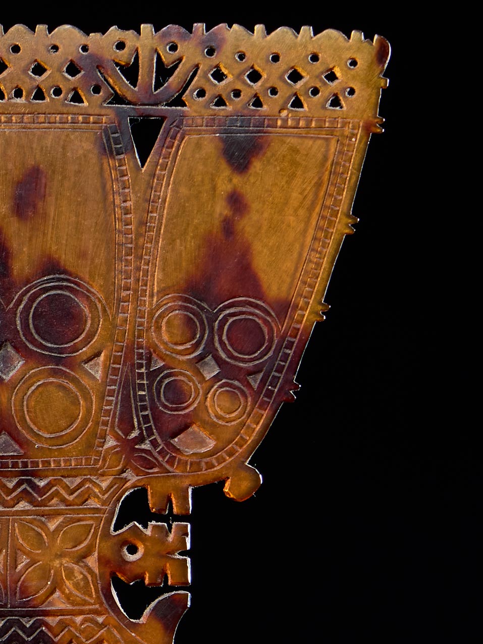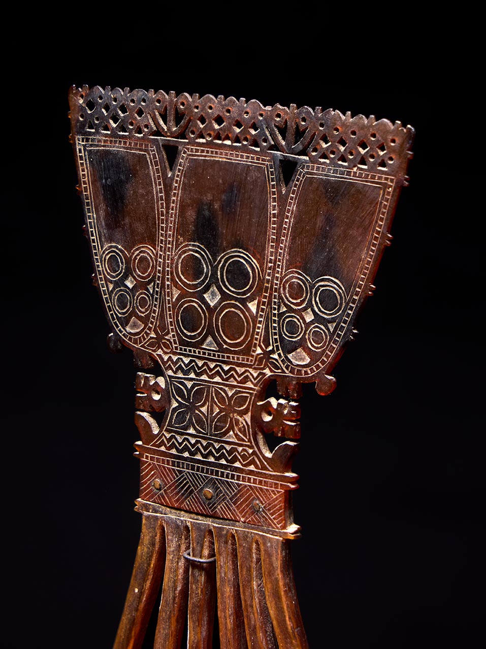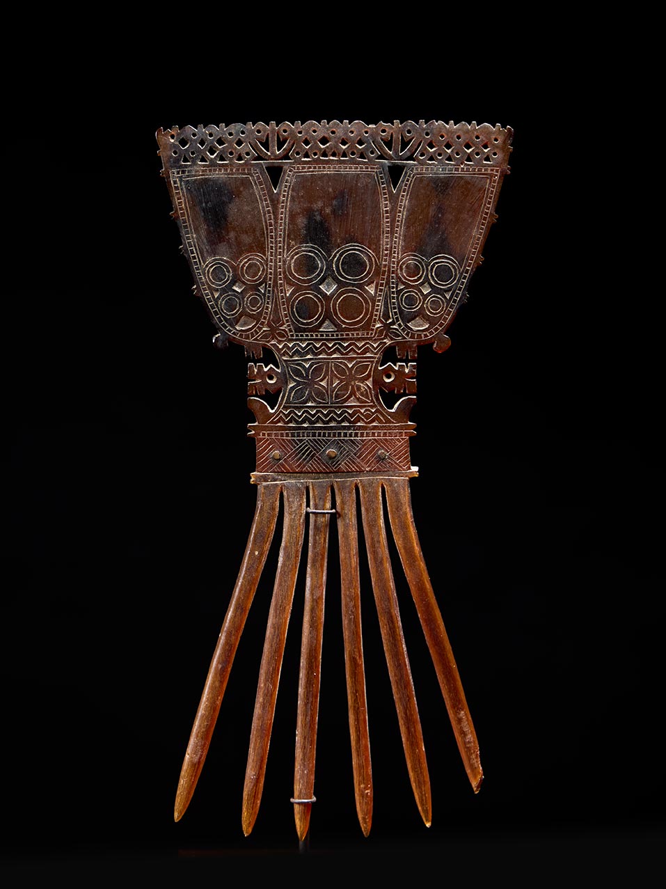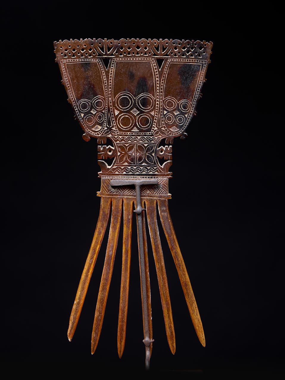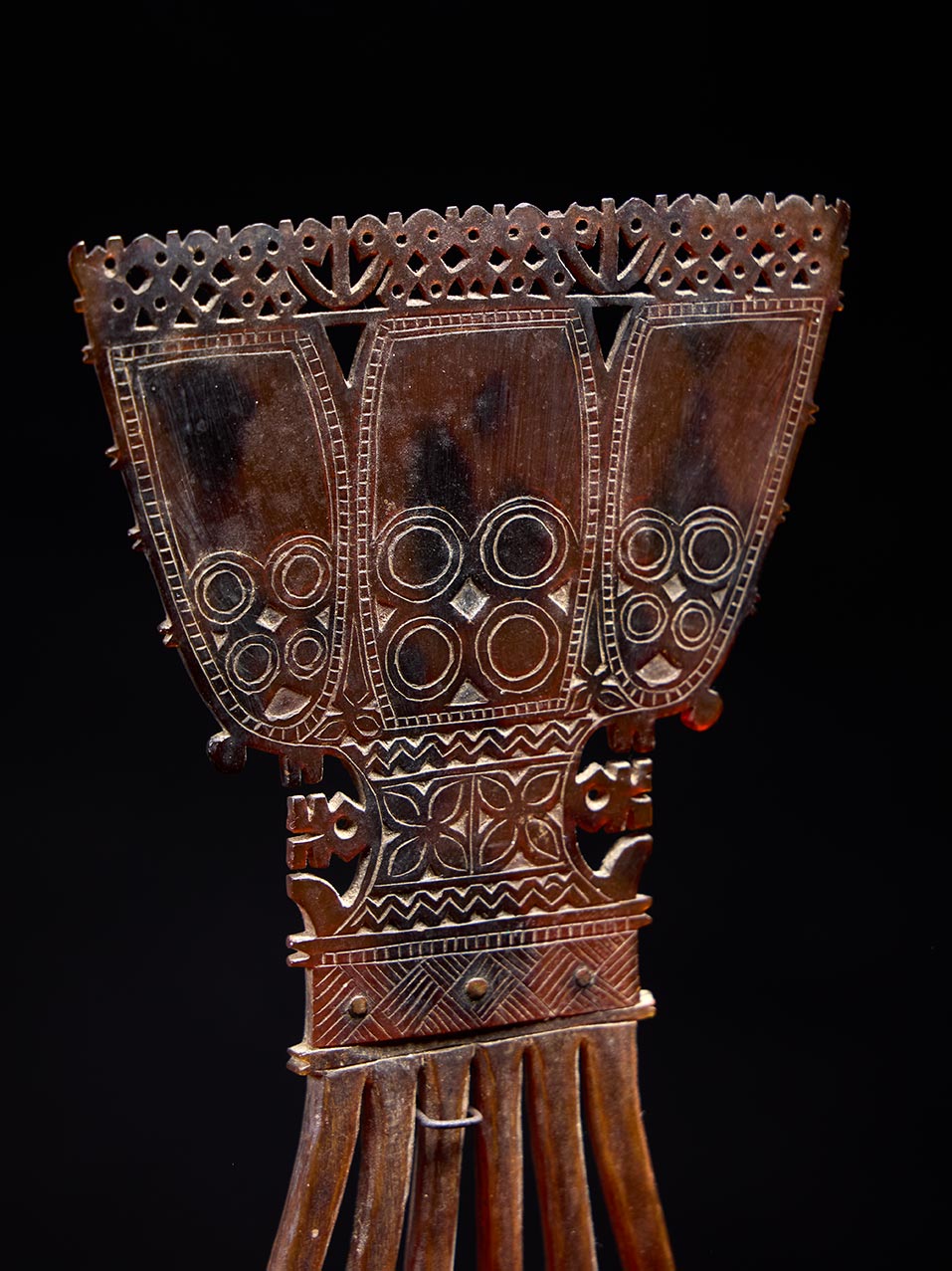 This striking ceremonial comb from Timor is carved from turtle shell, a prized and symbolically charged material throughout eastern Indonesia. When held to the light, the comb reveals a luminous, translucent surface animated by natural mottling—its warm amber tones and dark clouded inclusions lending the object a remarkable sense of depth and vitality. The material’s inherent transparency enhances the delicacy of the carving, giving the comb an almost ethereal presence.