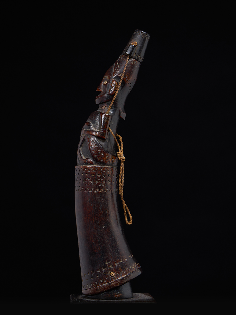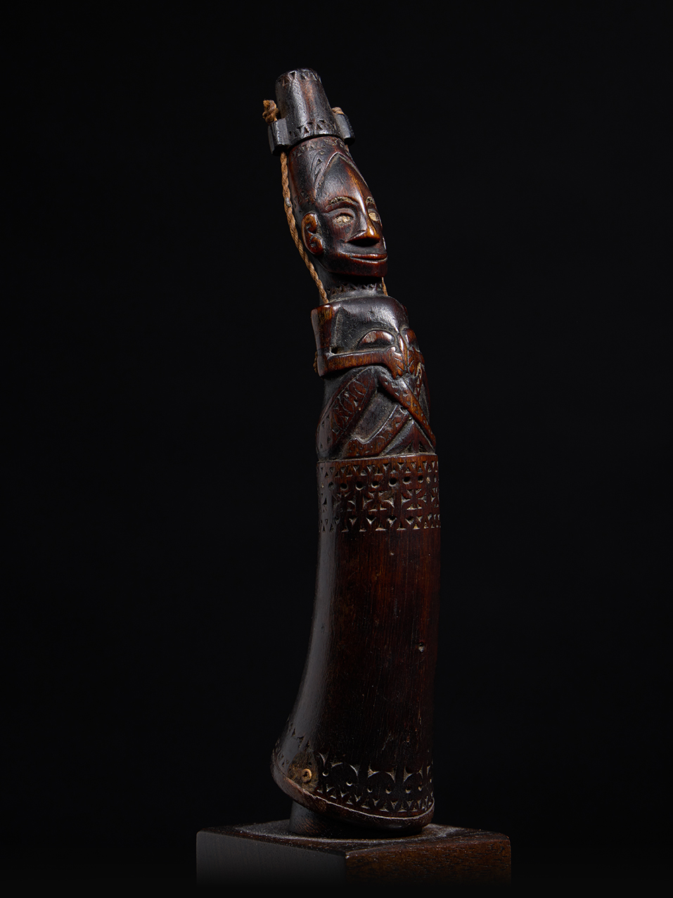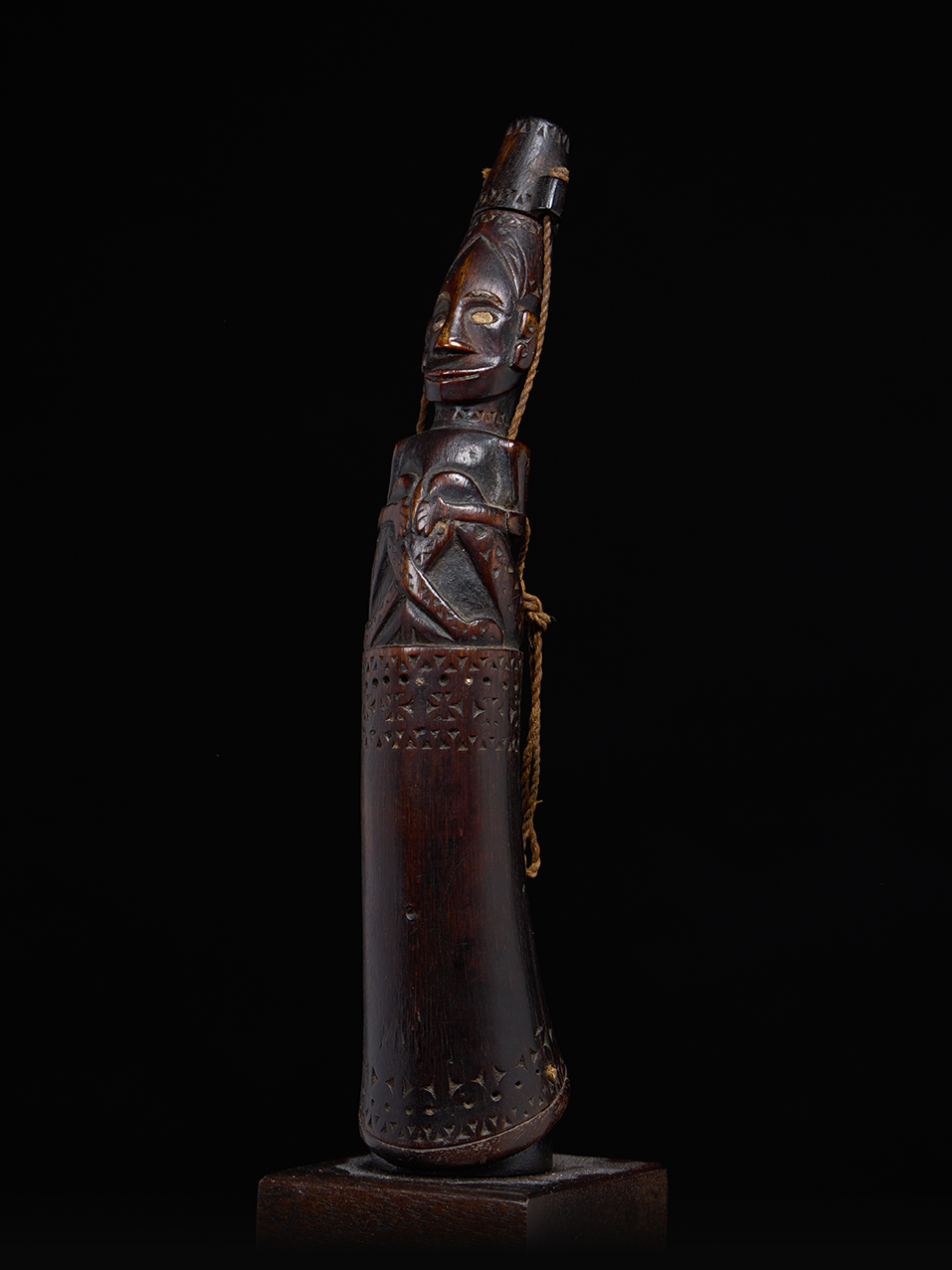 This finely carved gunpowder container originates from the Toba Batak of North Sumatra and was used to store black powder for flintlock firearms. Such containers were functional objects carried by men, yet they were also potent expressions of status, identity, and ancestral protection—often carved with human figures that served both symbolic and apotropaic roles.