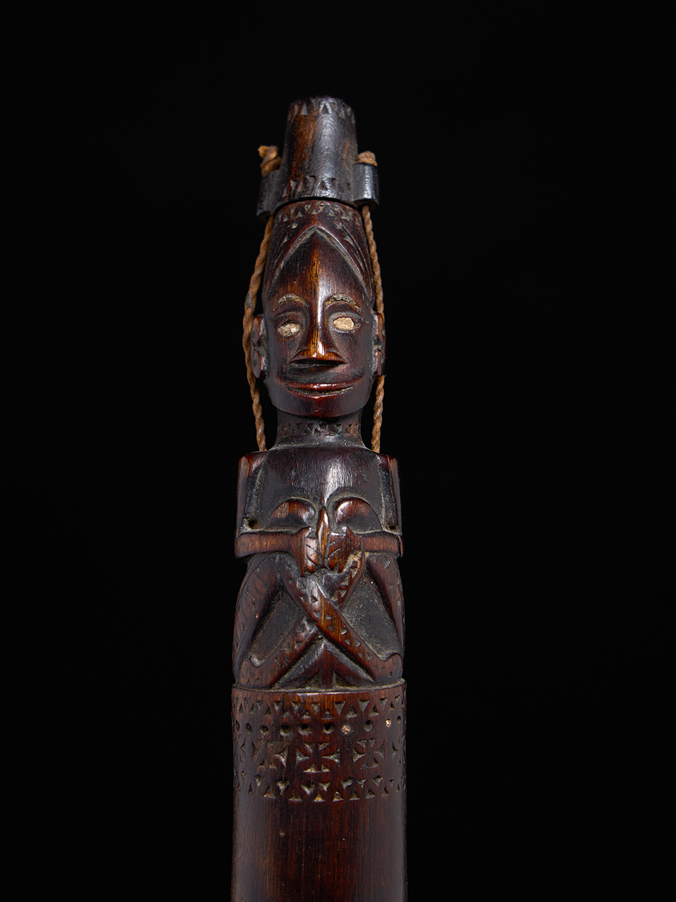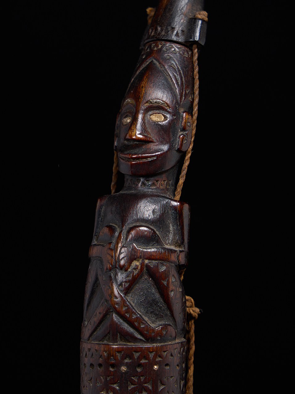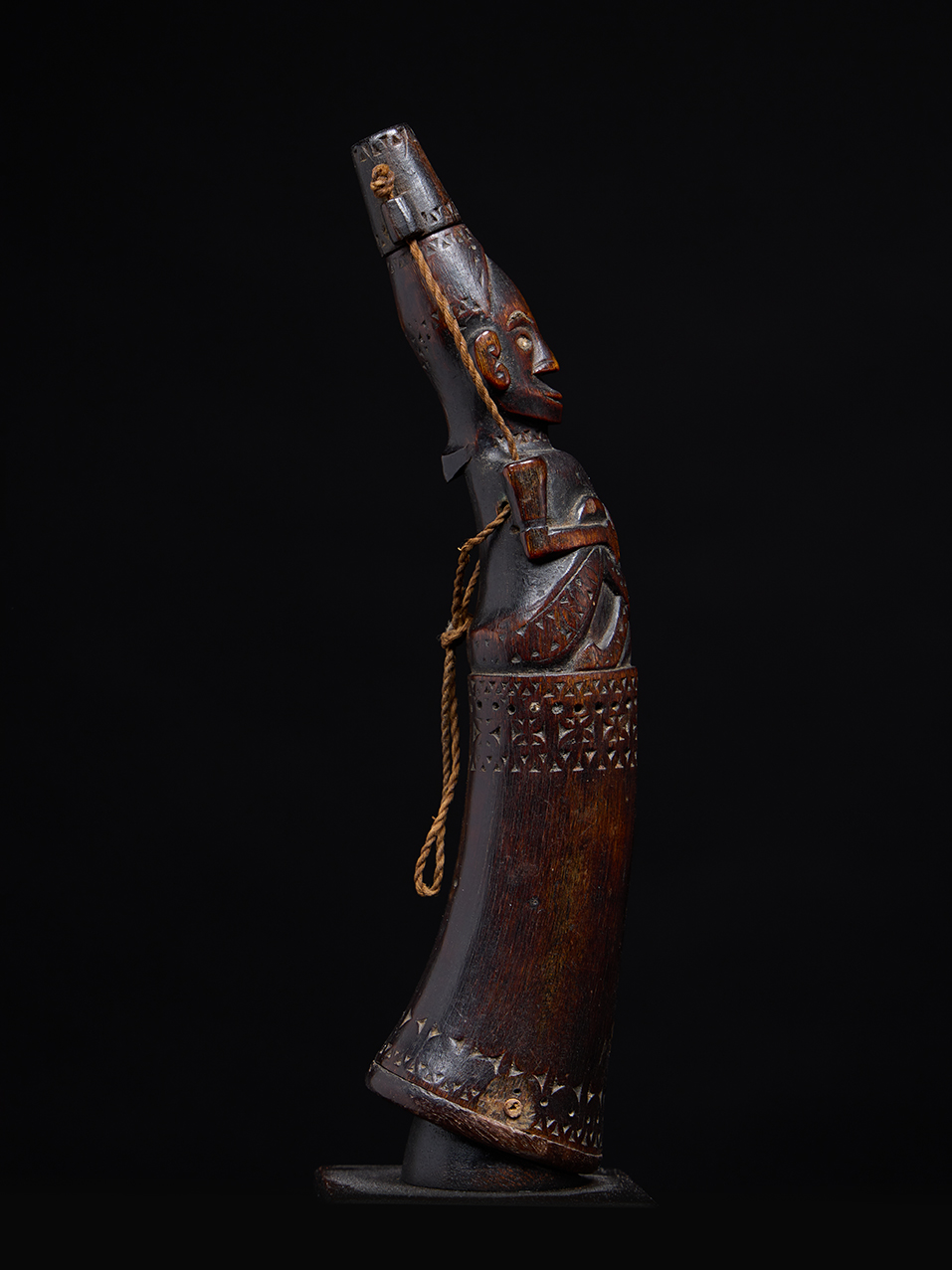 This finely carved gunpowder container originates from the Toba Batak of North Sumatra and was used to store black powder for flintlock firearms. Such containers were functional objects carried by men, yet they were also potent expressions of status, identity, and ancestral protection—often carved with human figures that served both symbolic and apotropaic roles.