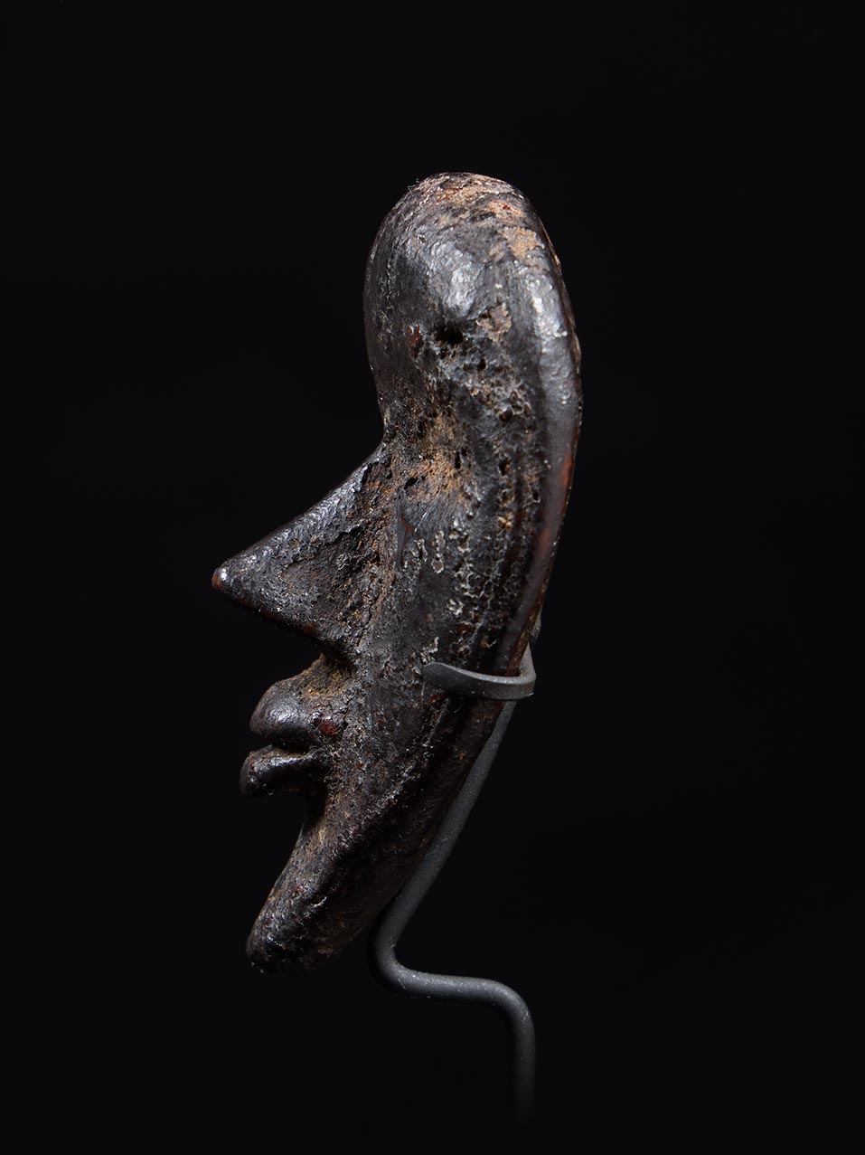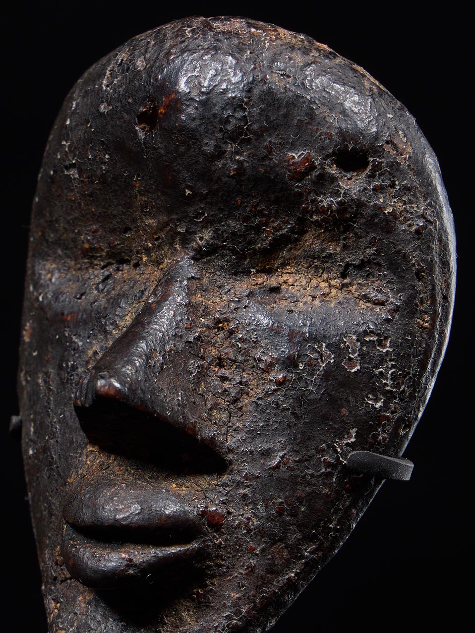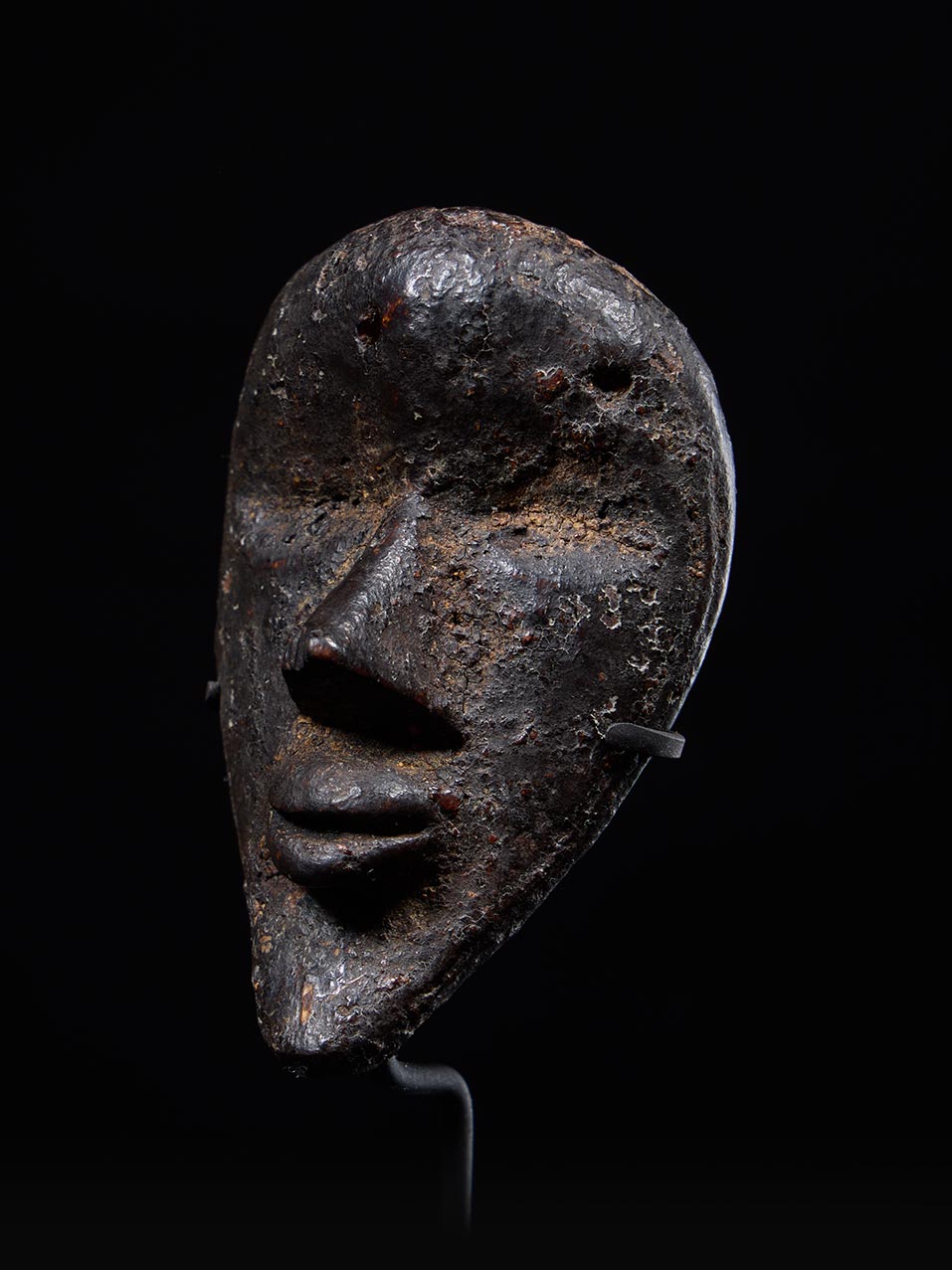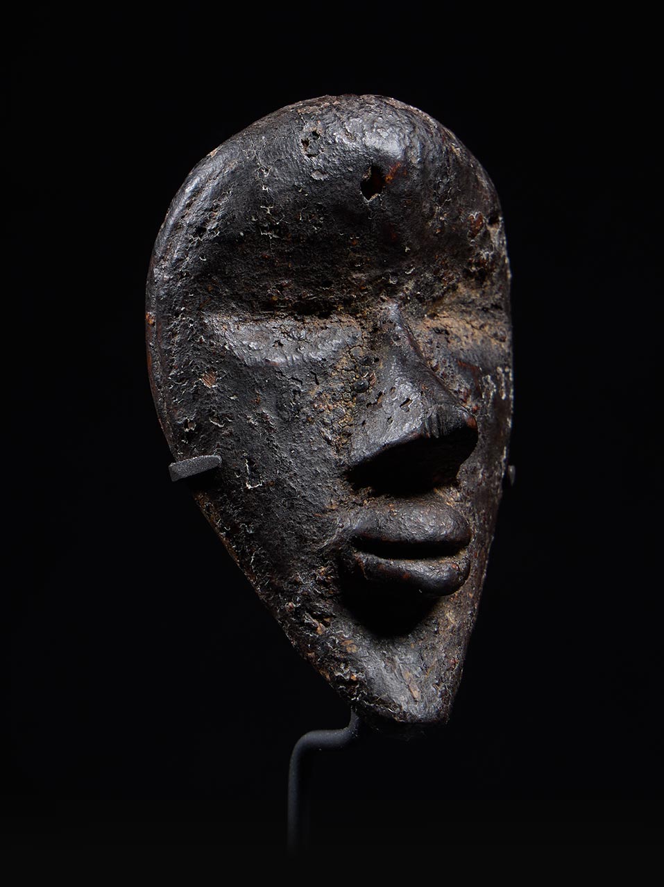 The surface is covered in a deep, dark patina built up through age, handling, and ritual use. Areas of encrustation remain intact, particularly within recesses and along the contours of the face, reinforcing the mask’s authenticity and long ceremonial life. This rich surface treatment enhances the sculptural depth of the carving and gives the object a gravitas that belies its modest scale.