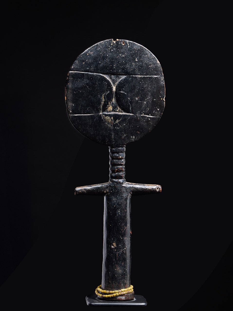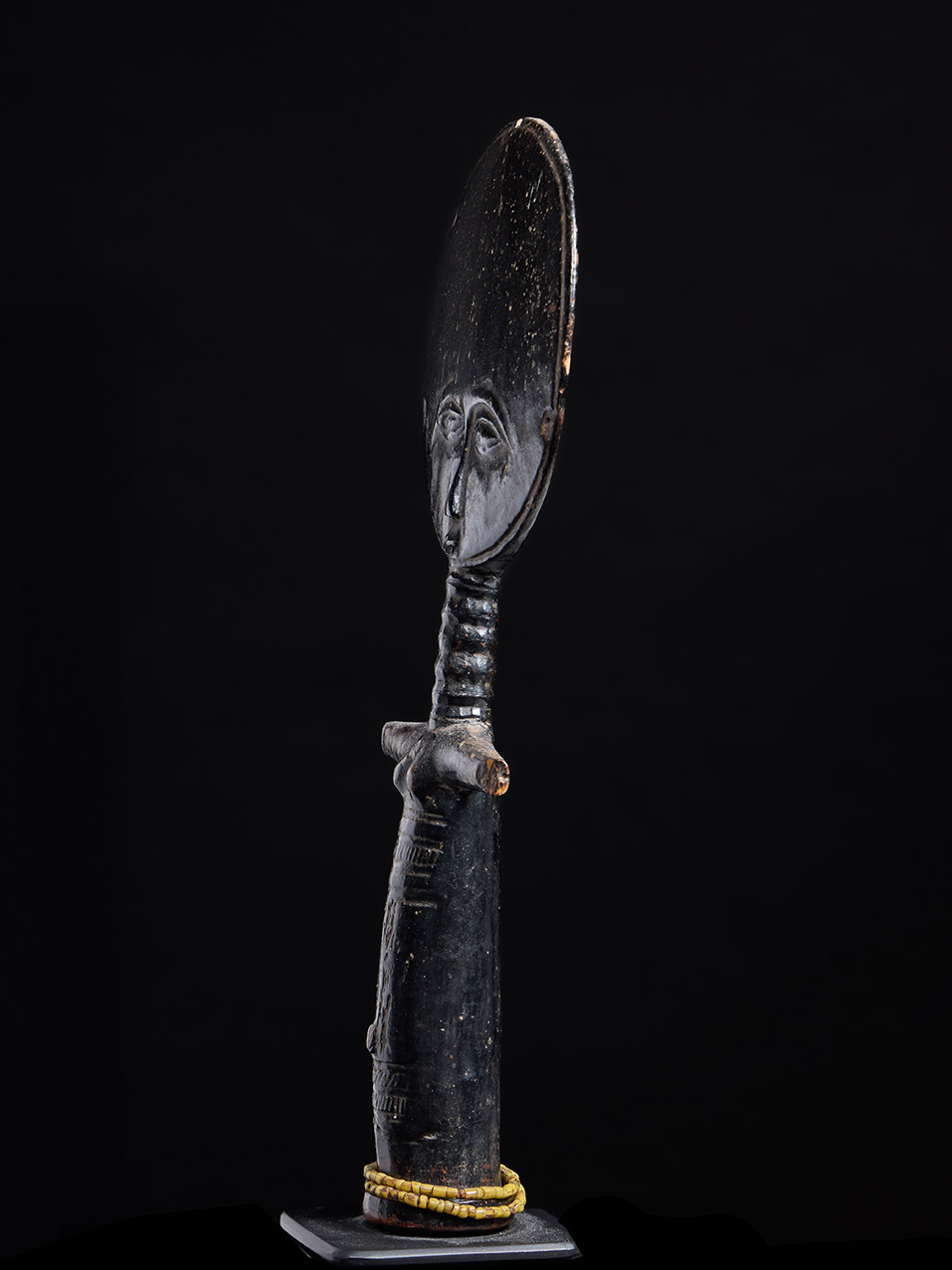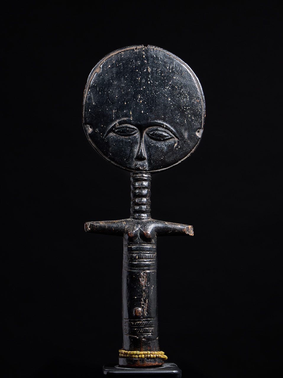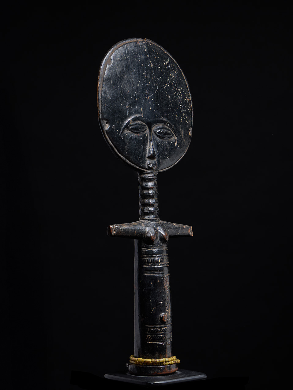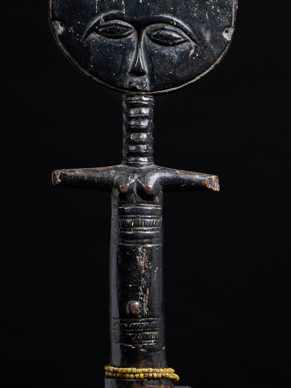 This classic Akua’ba figure was carved for use by Ashanti women as a fertility aid and idealized image of beauty. Such figures were carried on the back like an infant or kept close to the body, believed to encourage conception and ensure the birth of a healthy, beautiful child. Beyond their ritual role, Akua’ba figures also functioned as cultural statements, expressing Ashanti ideals of femininity, harmony, and balance.