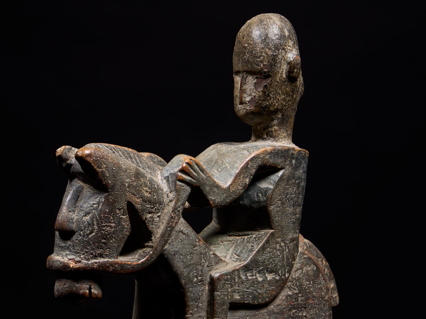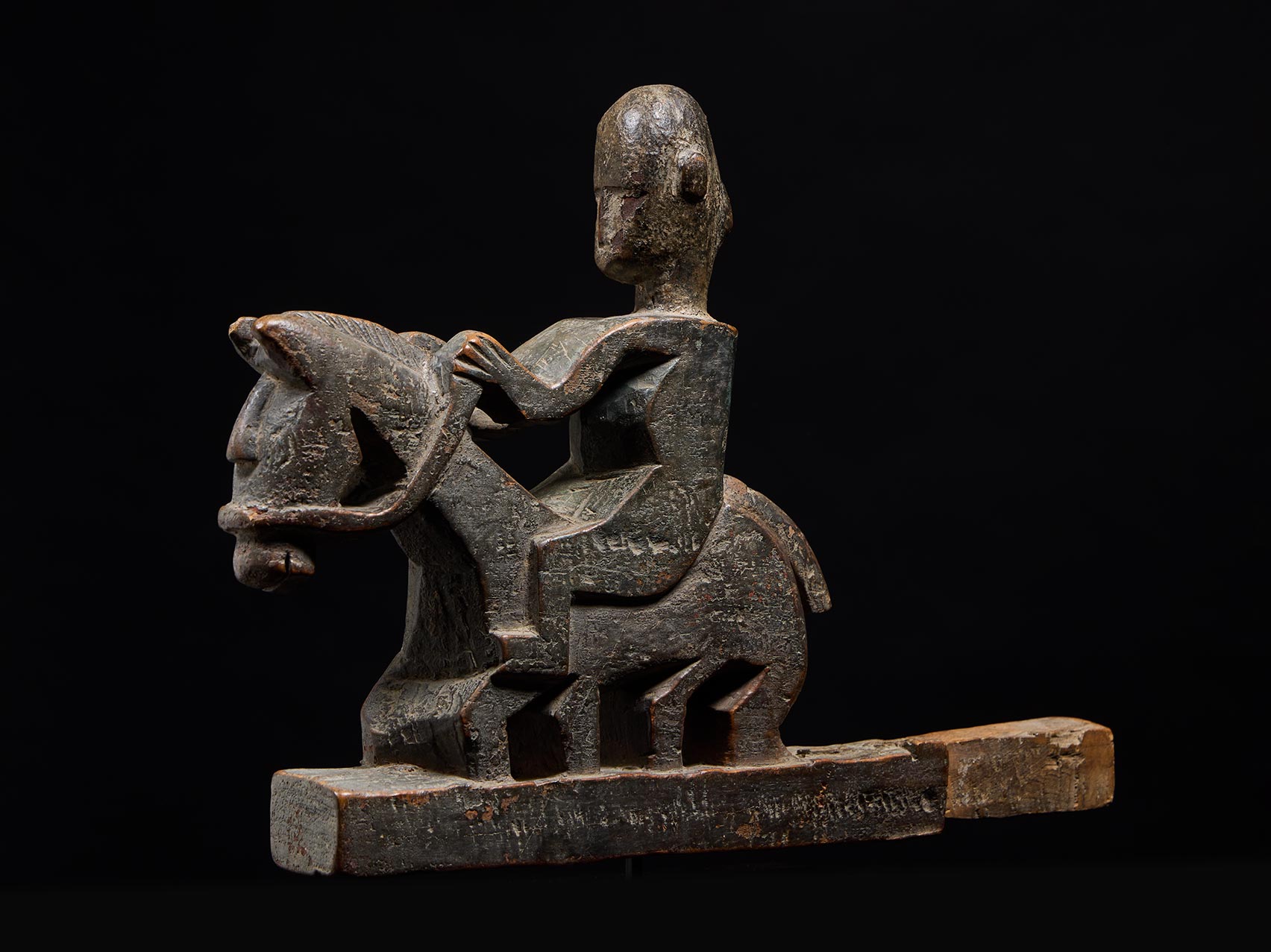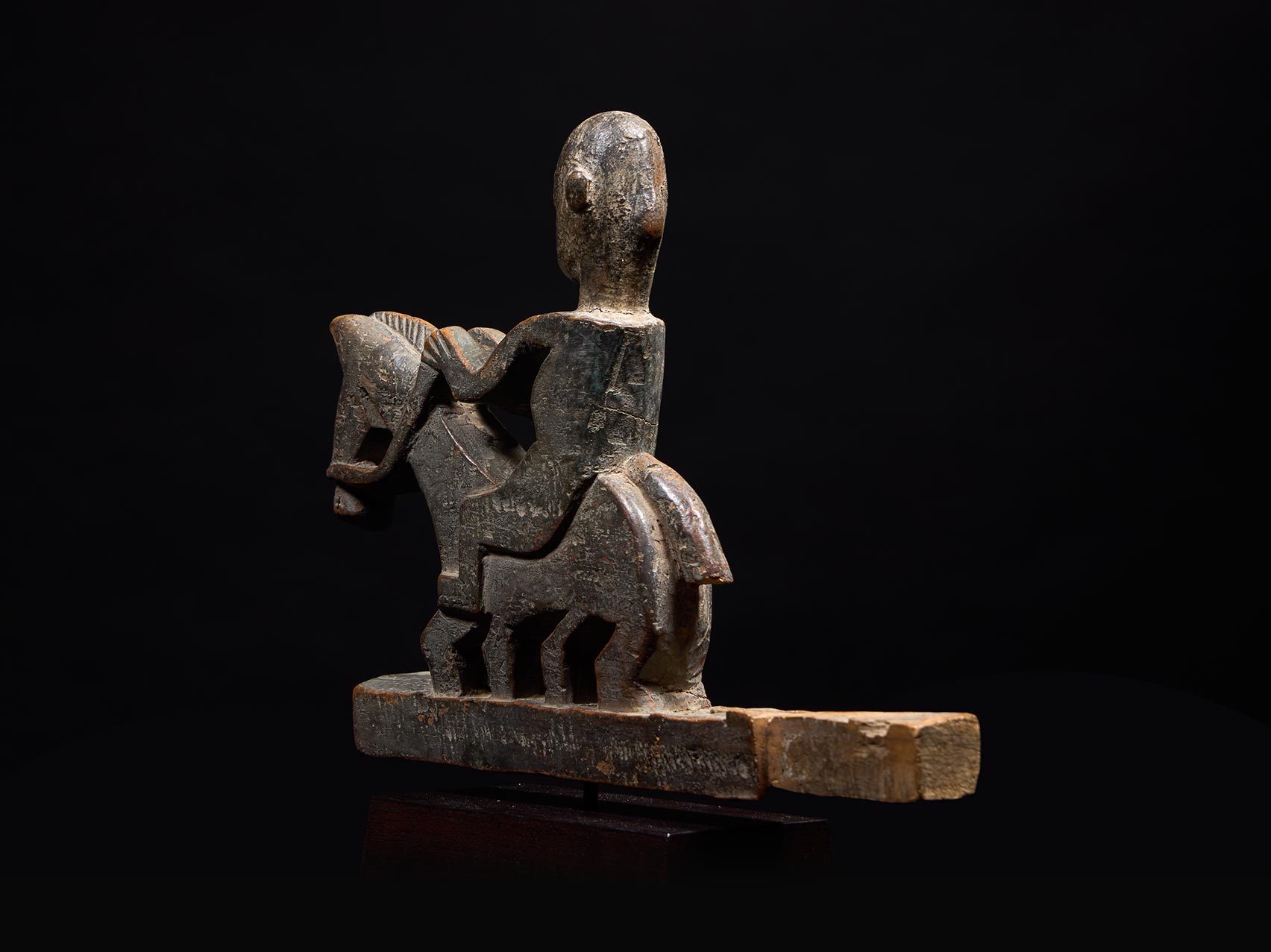 Carved in a highly stylized and abstract manner, the composition reduces both rider and horse to essential geometric elements. The face is minimal—quietly expressive through its restraint—while the body and mount are shaped with confident, rhythmic cuts. This economy of form gives the sculpture a modern sensibility, balancing narrative clarity with sculptural abstraction.