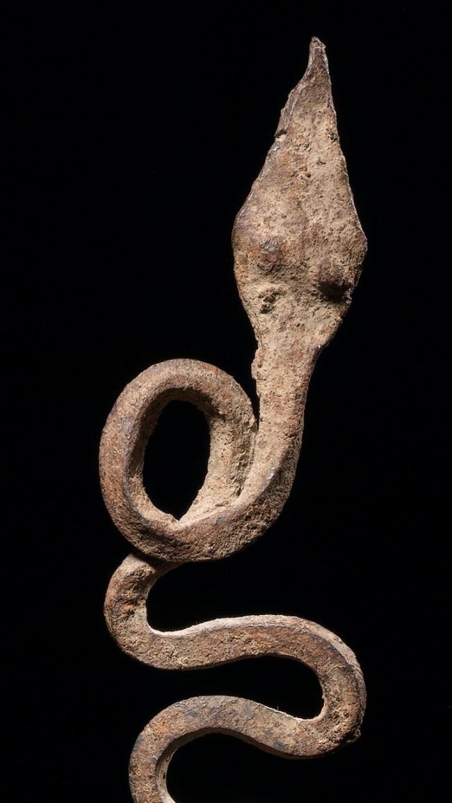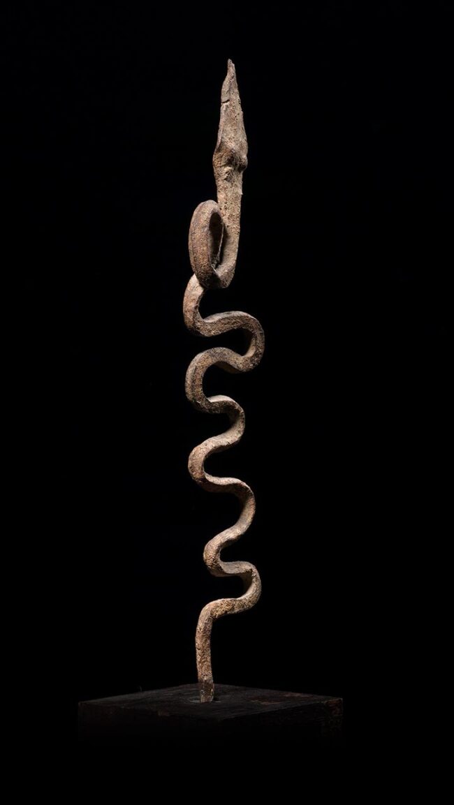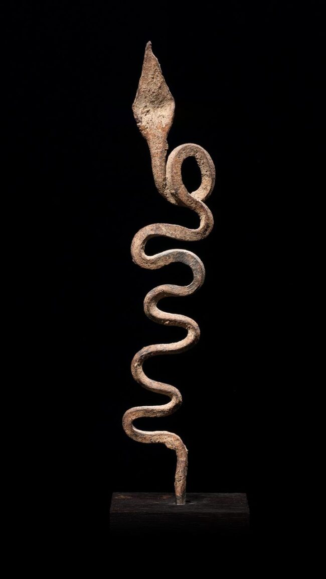 So many of these snakes on the market today are reproductions; they are falsely aged with rust. This example has a deep varied patina from decades of use. The organic form of this stylized snake is truly wonderful; it flows with life-like body movement that gives the impression the piece is actually in motion. A very high quality example.