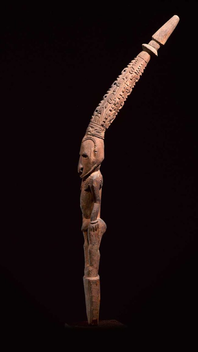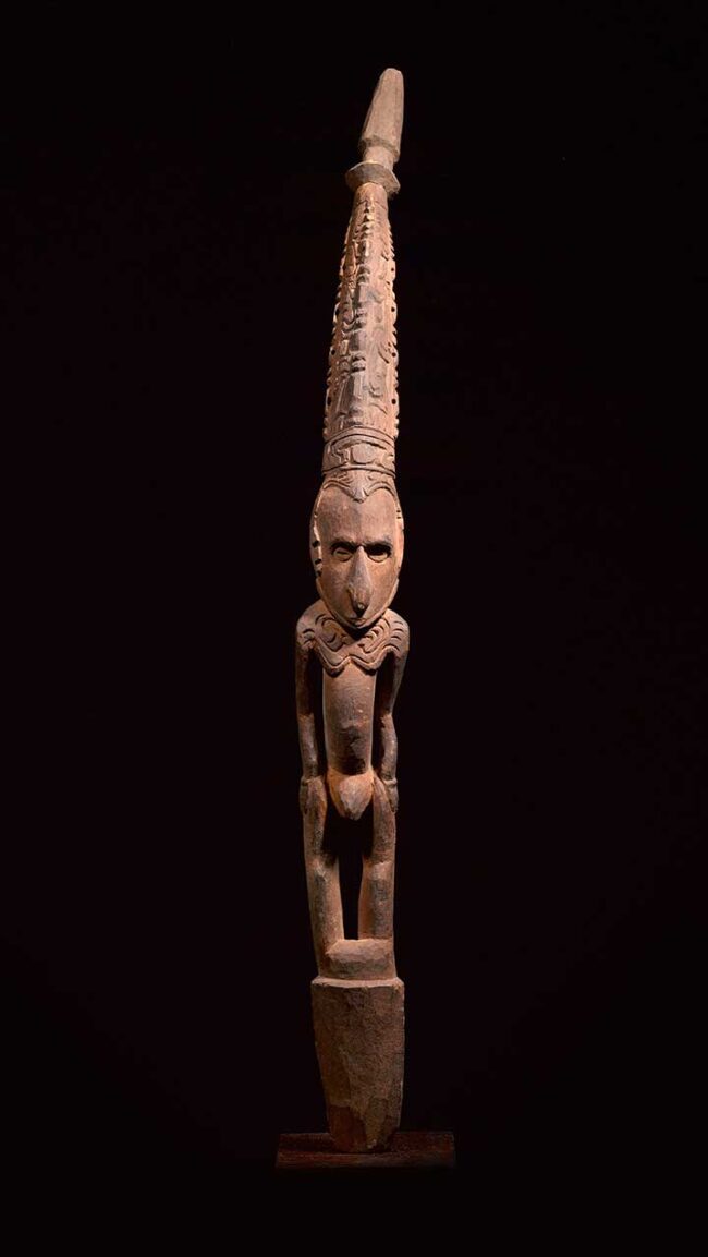 This dynamic figure with a tall headdress was probably a decoration on a large seagoing canoe used for coastal trade in the area. The figure has great presence, its posture is filled with tension and the spirit of the figure can be felt by just gazing into its face. Its original red ochre pigment still decorates the entire sculpture. A very similar example can be found published in “New Guinea Art: Masterpieces from the Jolika Collection”, fig. 53.
