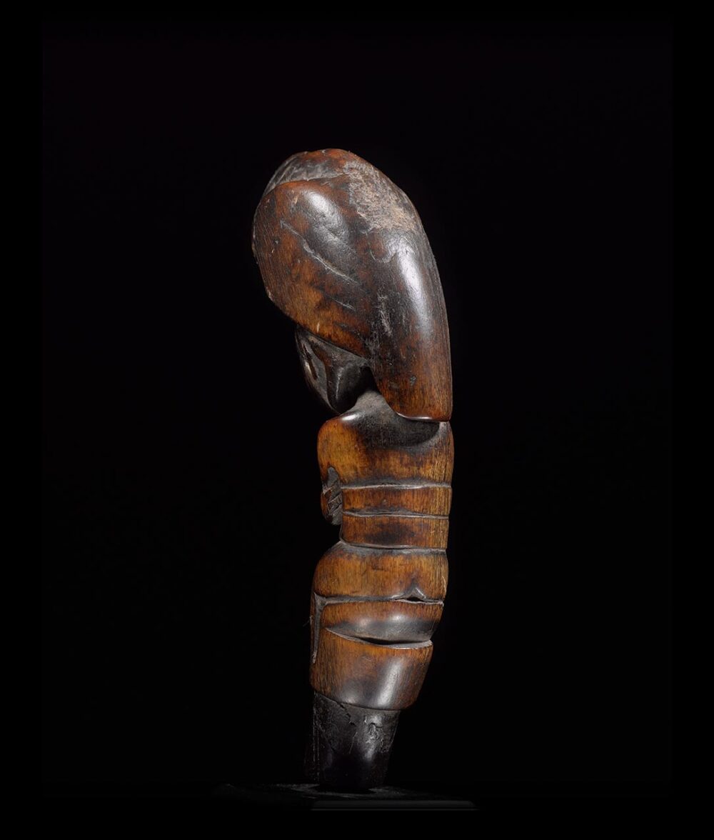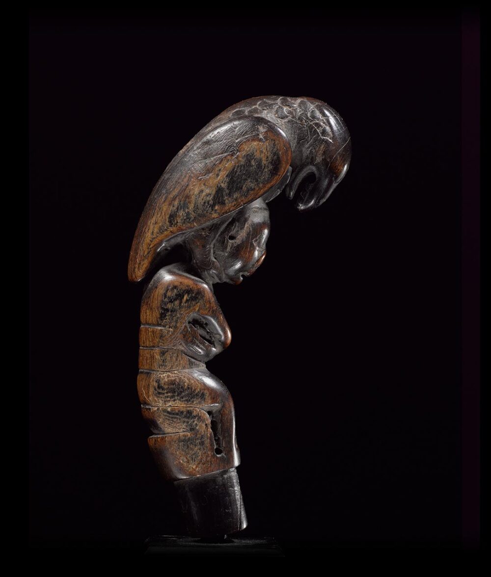 Carved from buffalo horn, this handle is a tour de force. Its sculpture is both compact and powerful and has fluid movement throughout. Its composition consists of a seated figure with crossed arms and pug-like nose, surmounted by an opened beaked and ferocious looking bird. Clearly used over a very long period of time, its surface is very well worn and it has a beautiful deep and handled patina.