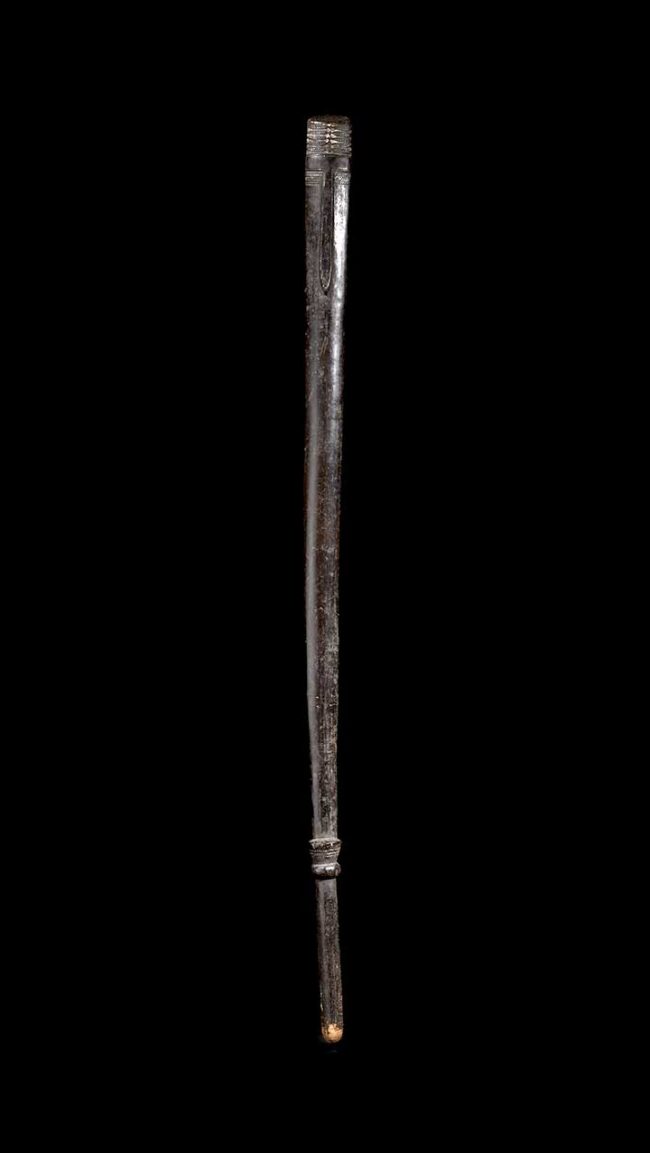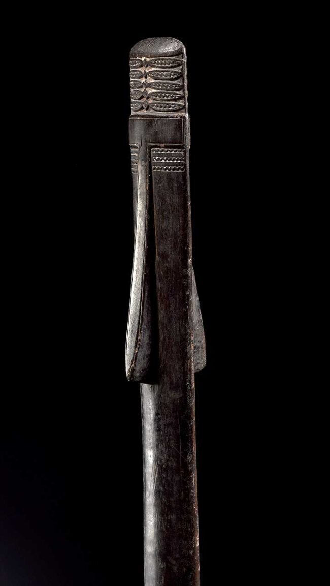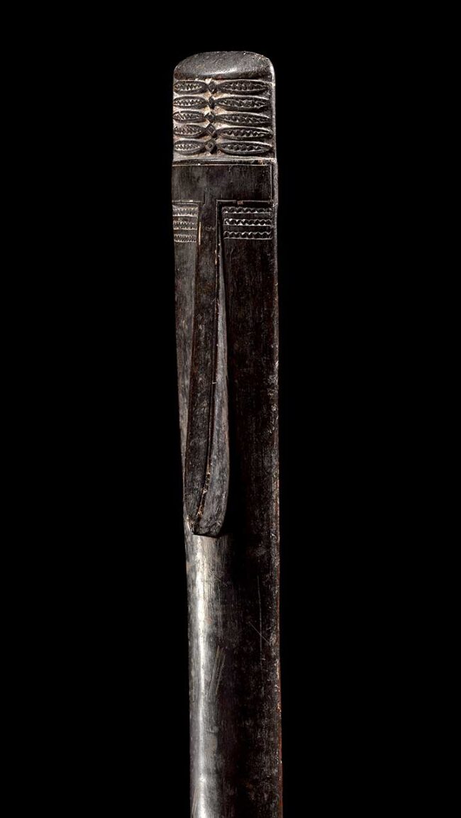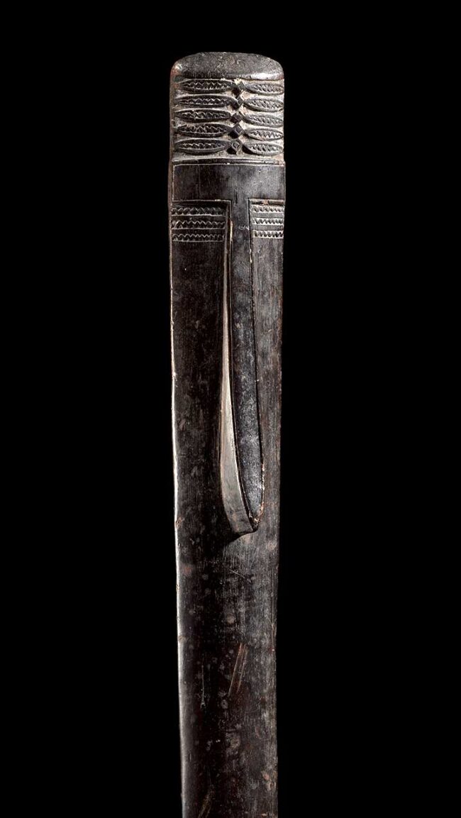 This very fine and old war club is wonderfully carved on both sides with stylized faces. The clan designs carved in relief at the top and bottom still retain the lime fillings inserted to enhance the designs impact. Its well-handled surface is in excellent condition. Its patina is dark and varied.