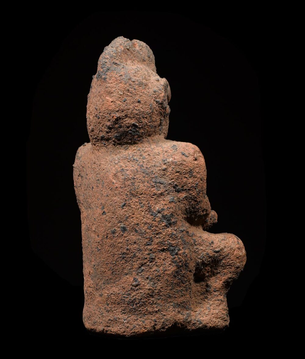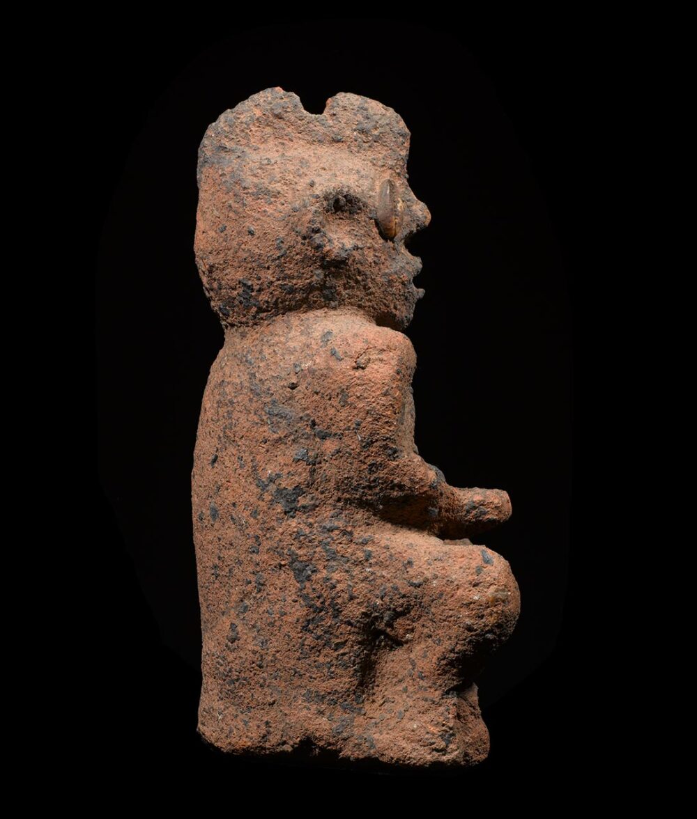 This is a unique example from the Yoruba terracotta art tradition. Dating to the 19th Century, this small figure sits, with his hands clasped in front of its belly, like many other figures in the Yoruba tradition. He is contemplative, with attached cowrie shells for eyes and a distinctive nose. Its surface is heavily encrusted, possibly indicating it received repeated ritual libations while it was stored on a sacred shrine.