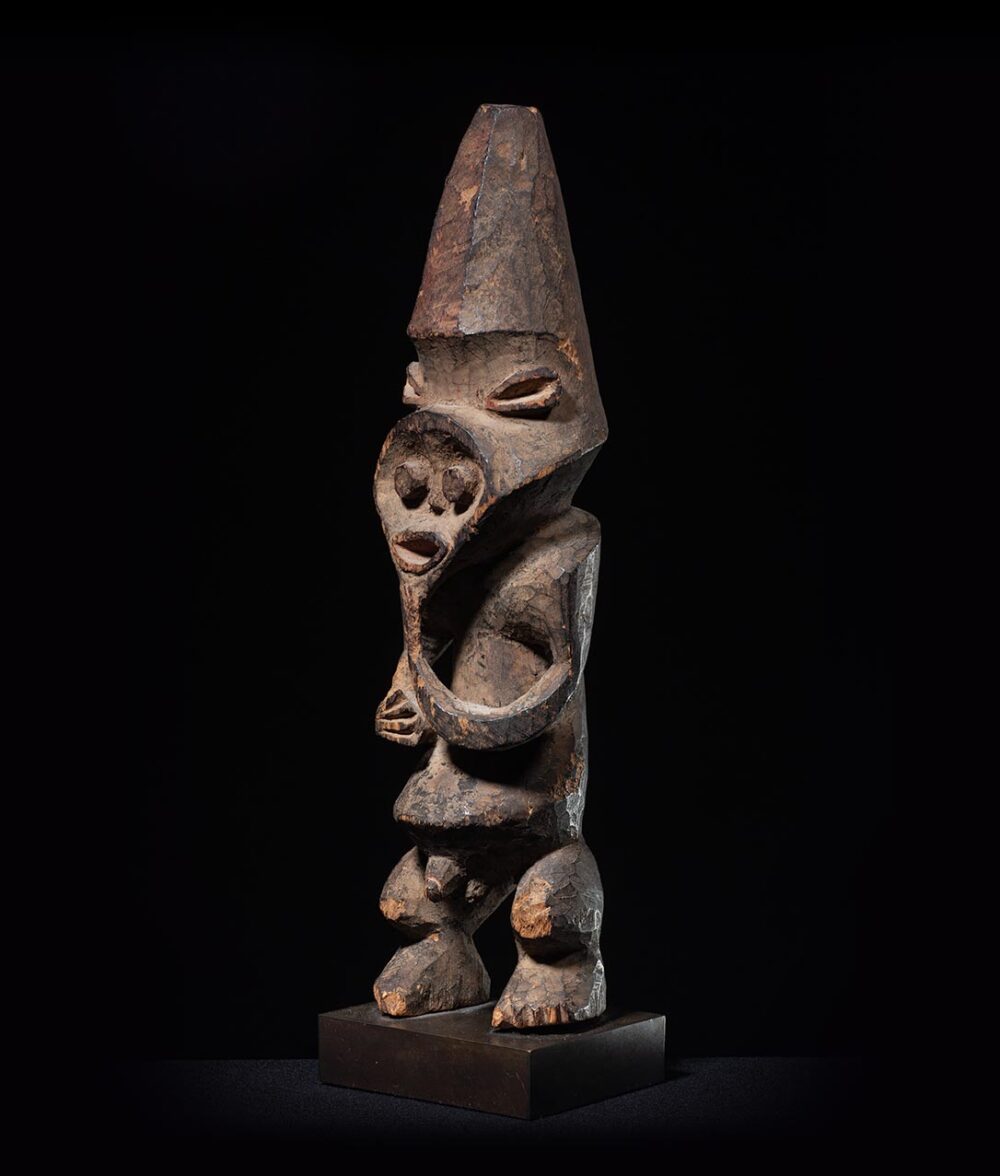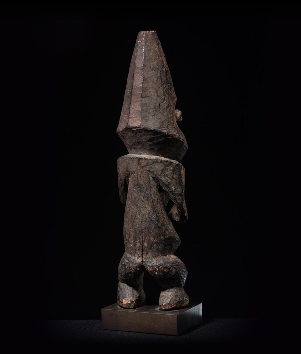 Tadep are often placed in shrines outside the village—at the threshold between civilization and the wilderness. These figures characteristically show either the left hand or both hands raised to the chin in a thoughtful gesture linked to Suaga, the Mambila society of healers who also deal with justice, protection from evil forces, and ritual cleansing.