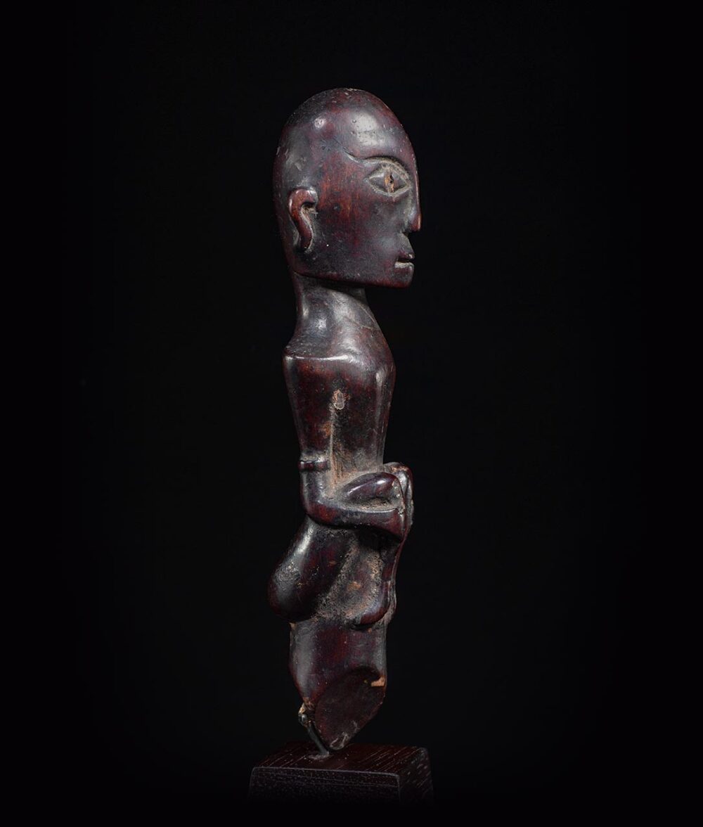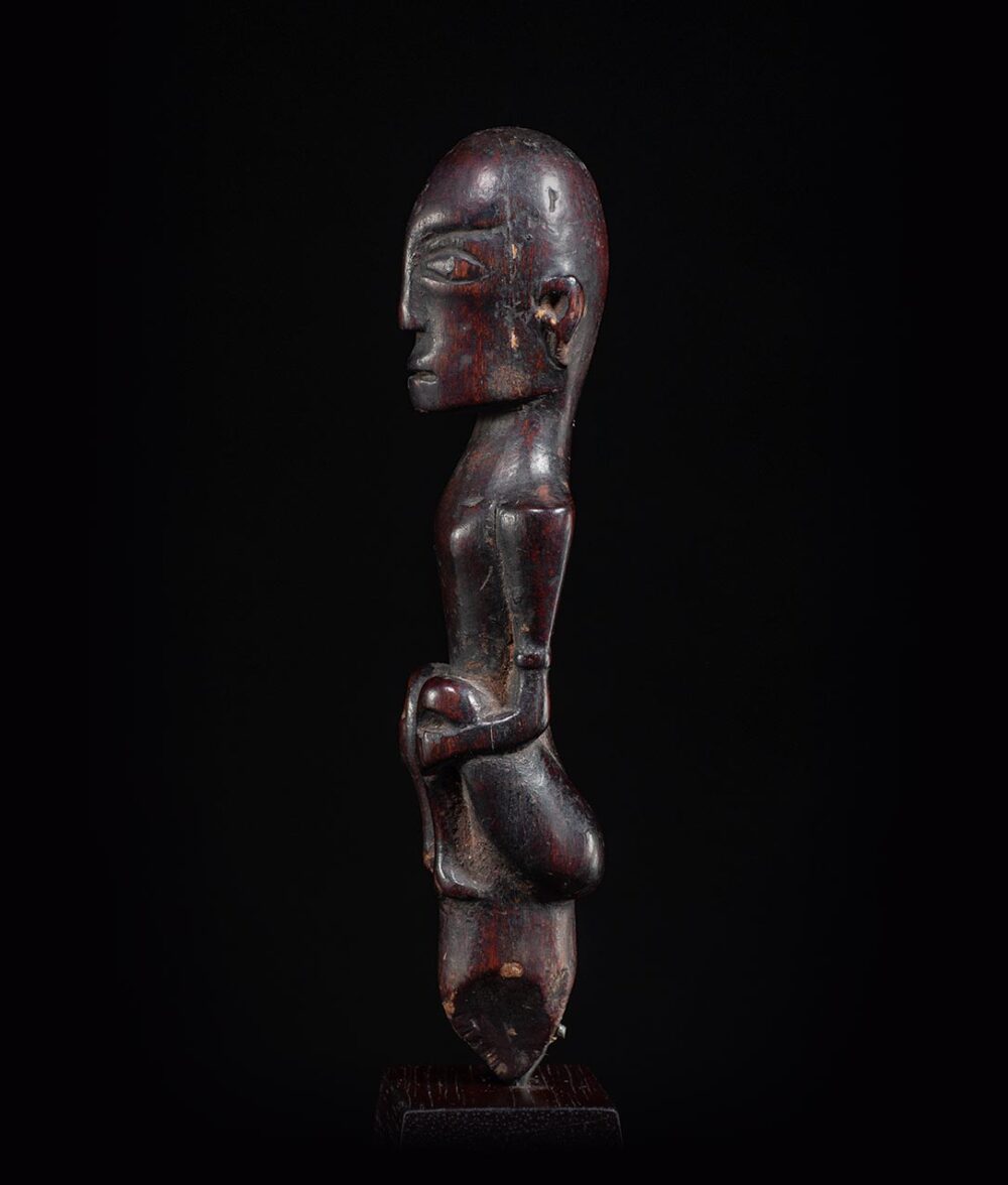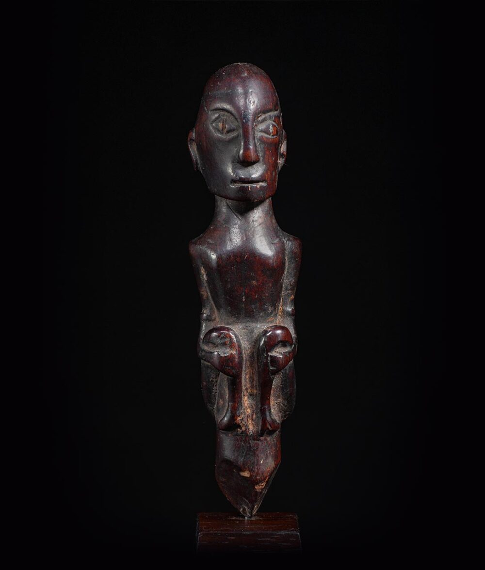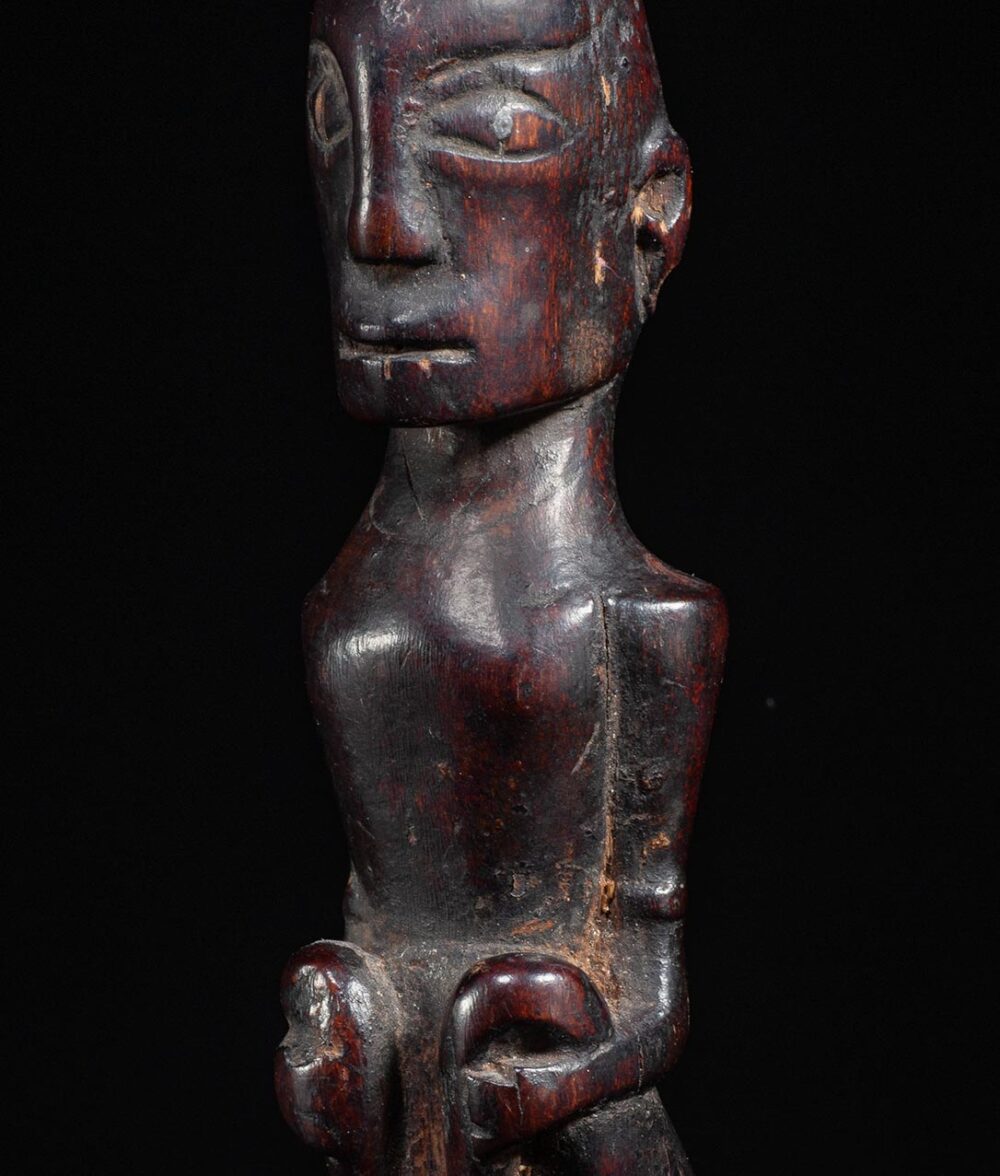 This Batak lime squeezer in the form of a seated figure is a traditional tool used in Batak culture. It is made of wood, and is intricately carved to resemble a seated figure. The figure is usually a representation of a god or ancestor, and is considered a sacred object. Due to its frequent use, it is very well worn and exhibits a deep and lustrous patina, which is a result of the natural aging process of the wood and the frequent contact with hand oils when in use. This patina is also a sign of the tool’s age and historical significance. The tool is typically used to squeeze lime juice for rituals and ceremonies, and is considered an important part of traditional Batak culture, as it is used to prepare traditional drinks and the presence of the ancestor figure is a way to honor and pay respect to the ancestors.