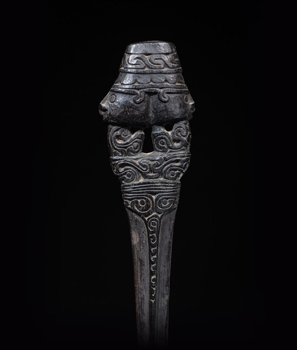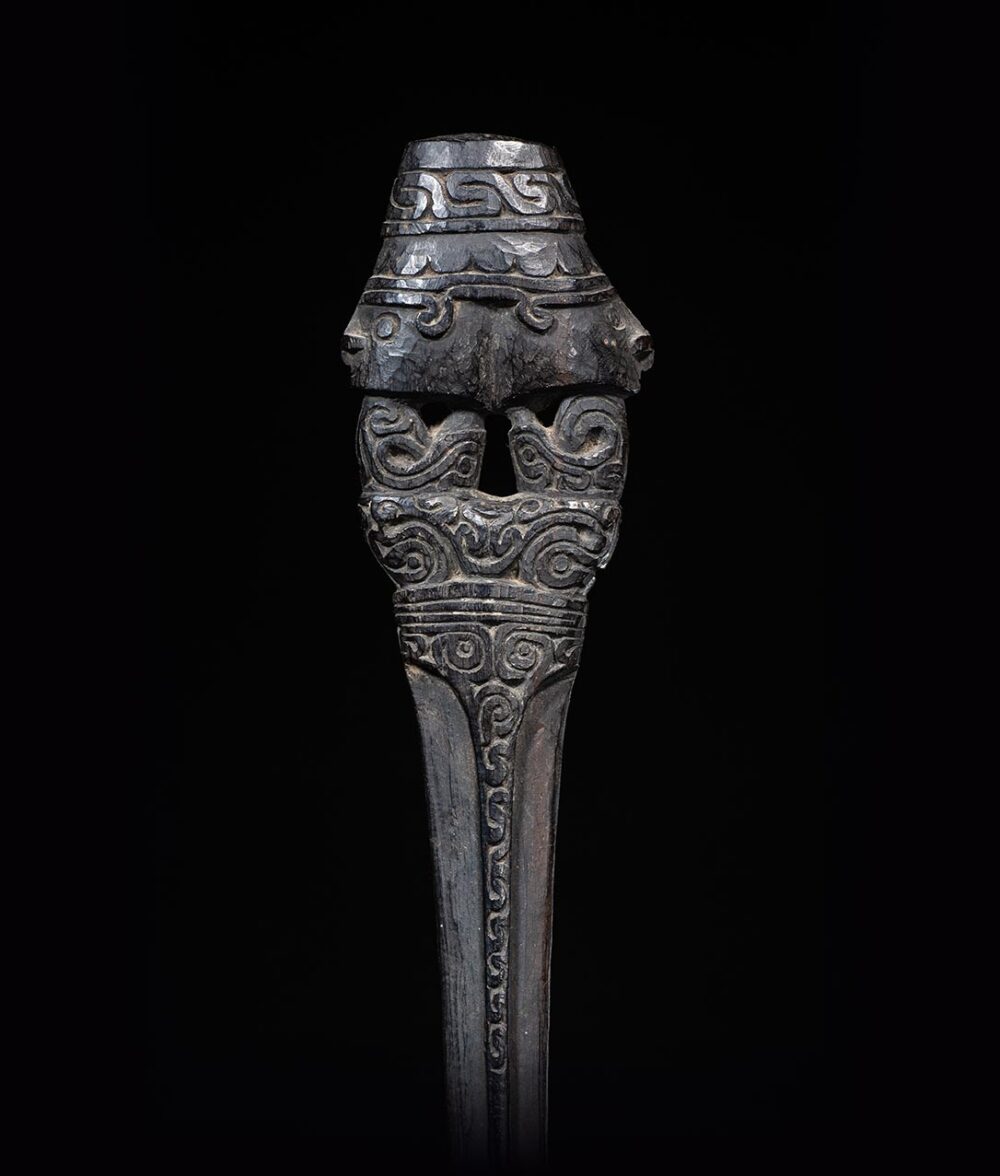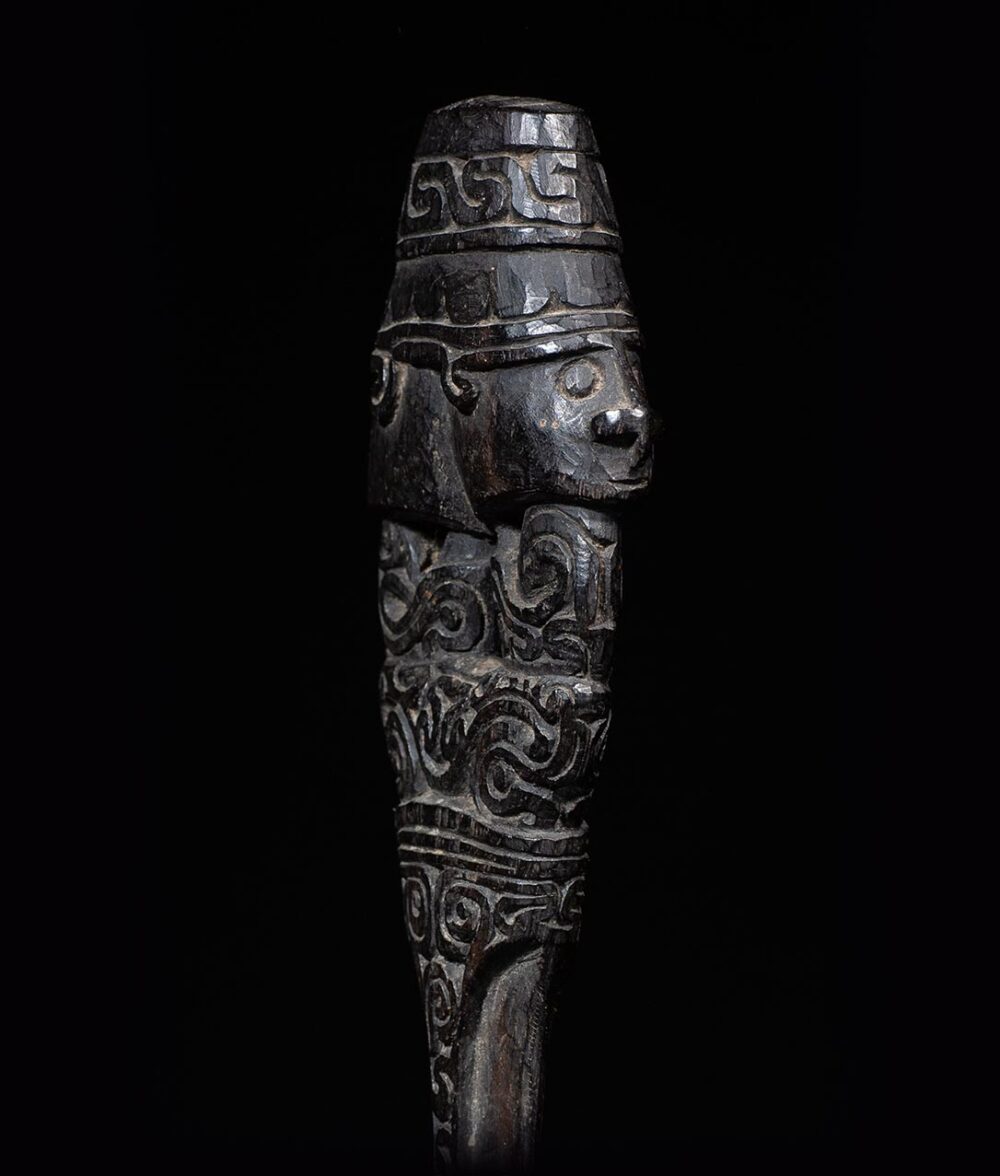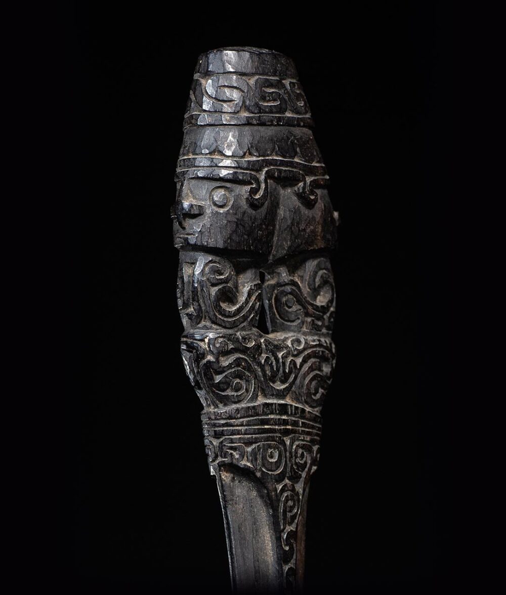 The lime spatula on offer is not only a beautiful work of art but also played a practical role in Trobriand Island culture. This spatula was used to prepare lime, which was an essential ingredient in chewing betel nut, a common social and ceremonial practice in the Trobriand Islands.