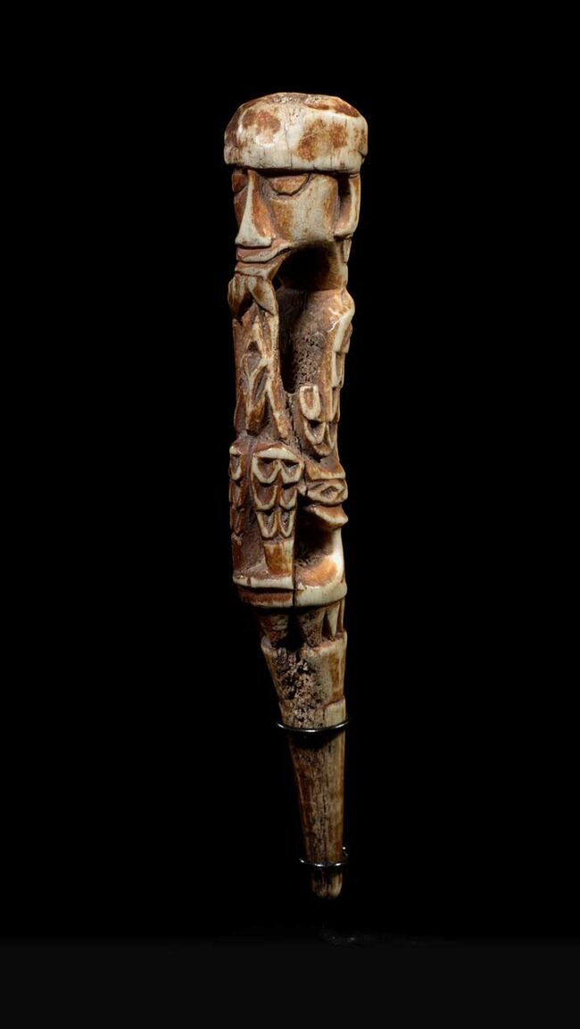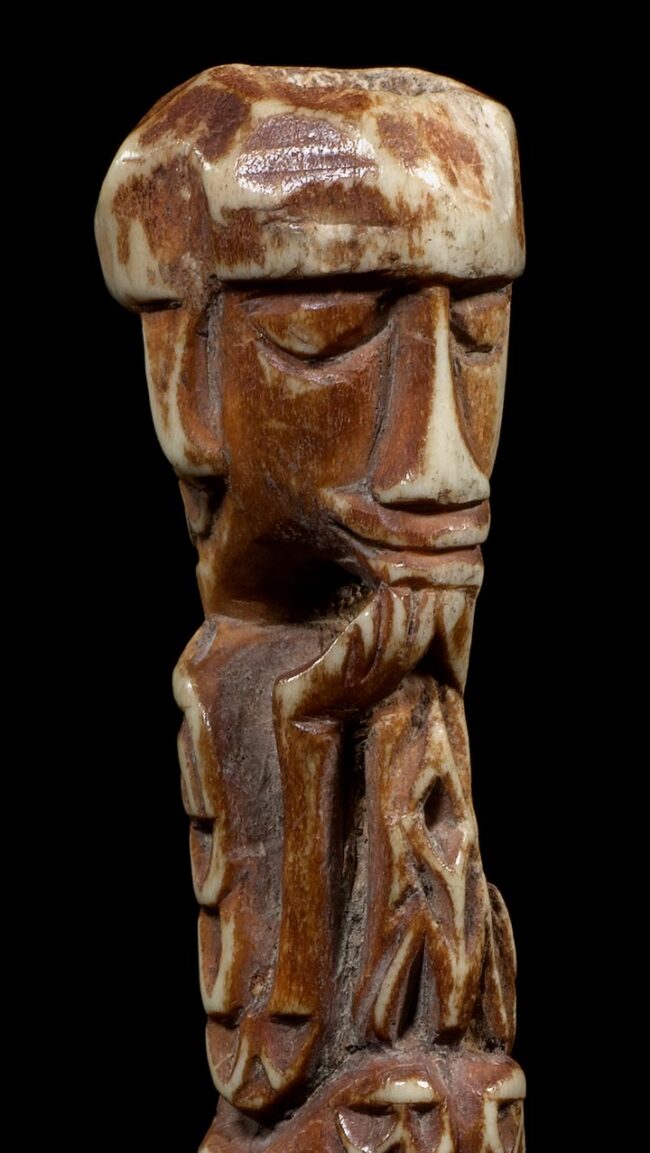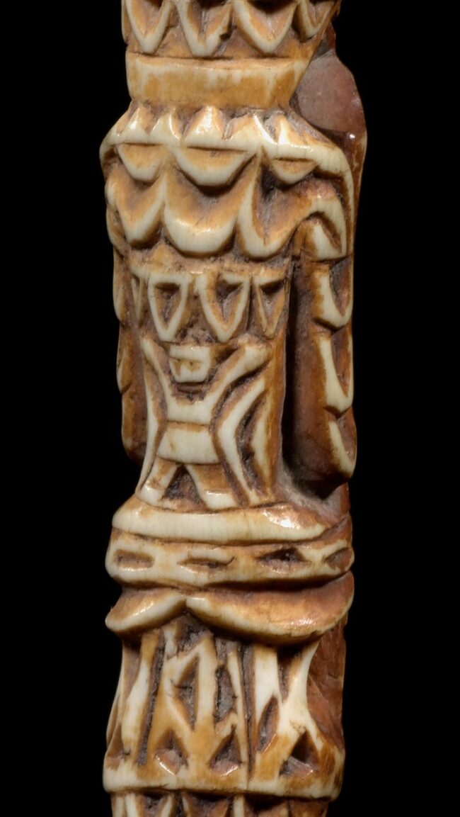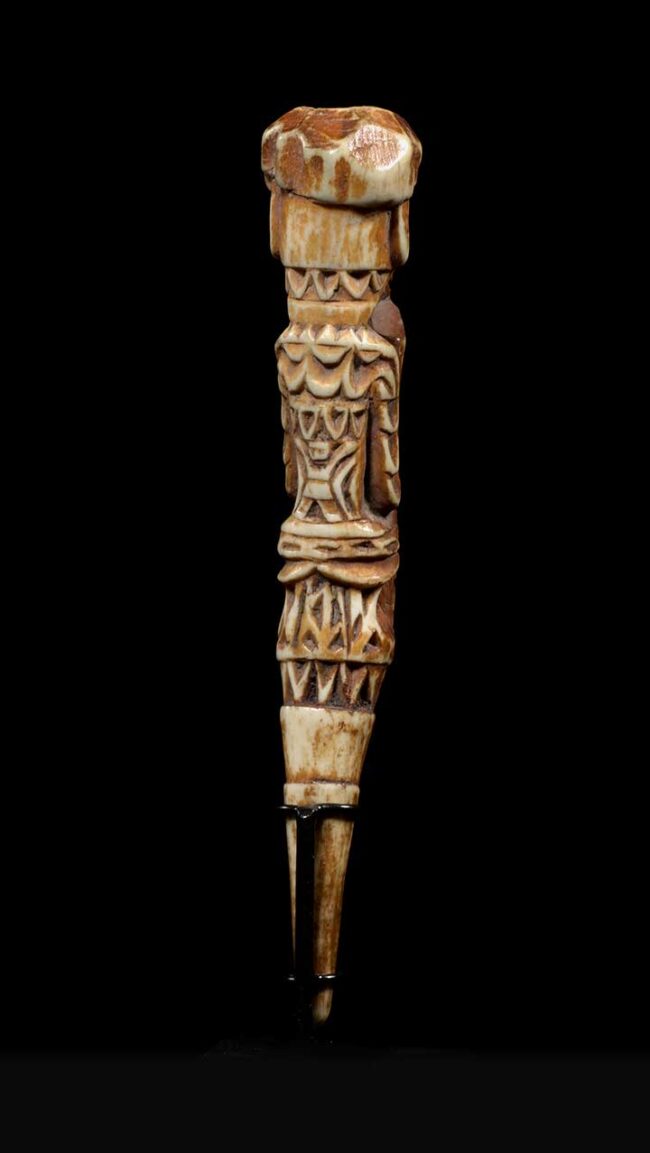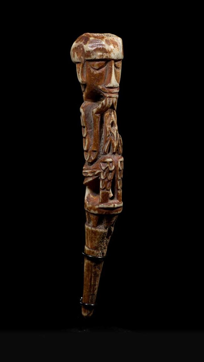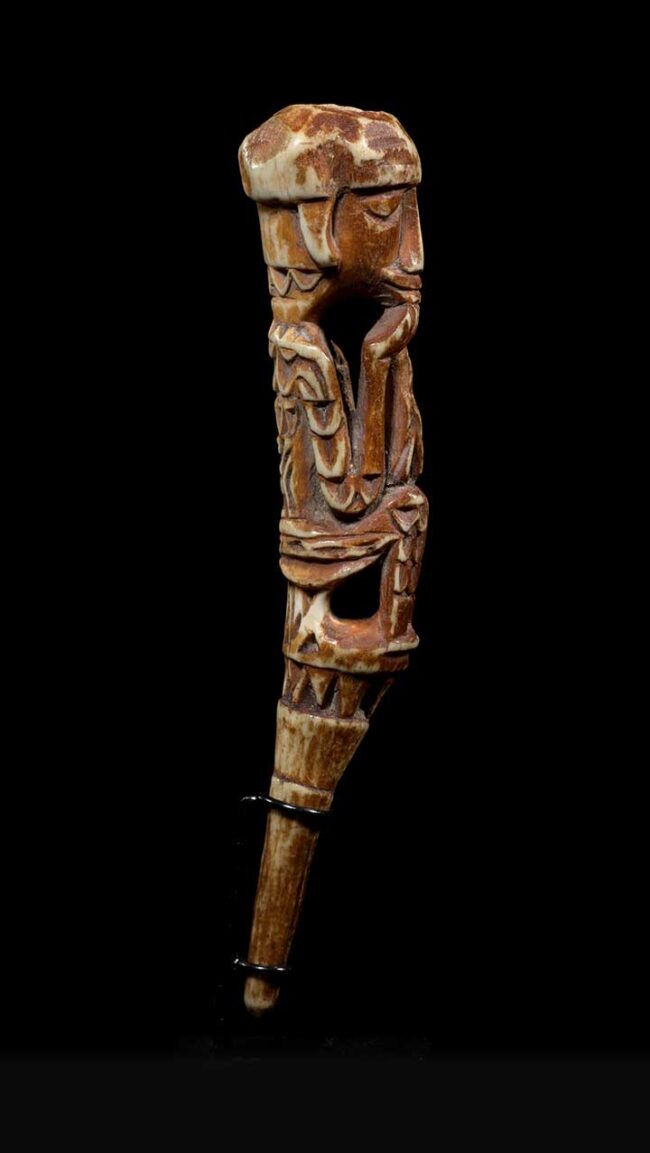 This fishermen’s amulet represents a spirit figure that would protect and ensure a good hunt for the village. This example is carved out of deer antler. These amulets are extremely rare. Beautifully carved, the attention to detail is stunning. The figure’s face is pensive, with half- moon eyes and a long nose. The figure rests his chin on top of his hands which are stacked, elbow to knee, as the figure crouches atop its base. High-relief decoration appears across the figure’s body. The looped, almost scale like carvings cover the figure’s back, arms, and legs. A small spirit figure is carved in high relief on the back. With both arms and legs outstretched, it takes a protective stance across the back of the object.
