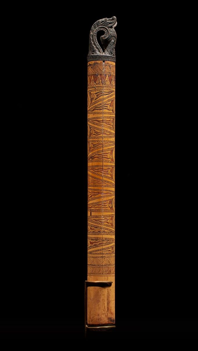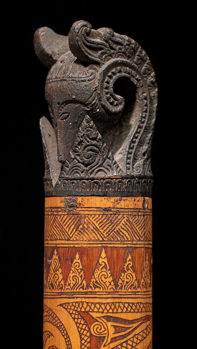 Crafted from bamboo with a wooden stopper, this particular container features intricate floral motifs incised into its surface. The stopper, artistically conceived, takes the form of a mythological creature, its neck gracefully curving into a coiffure that creates a stunning tidal wave-like design. On the reverse, a figure with raised arms is skillfully carved in relief. The patina, deep and encrusted, bears witness to decades of use, underscoring the container’s rich history and significance.