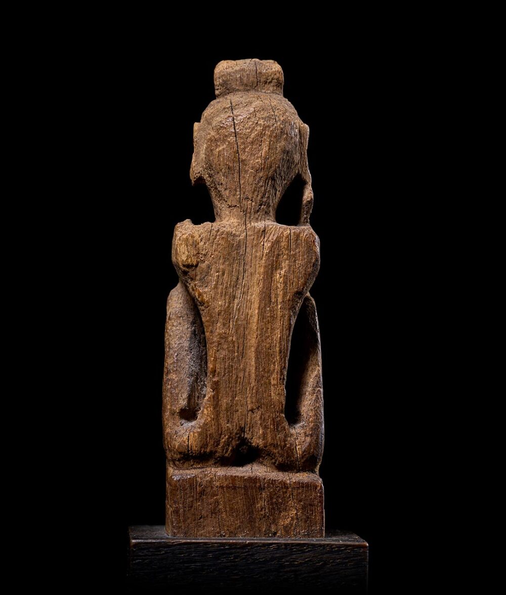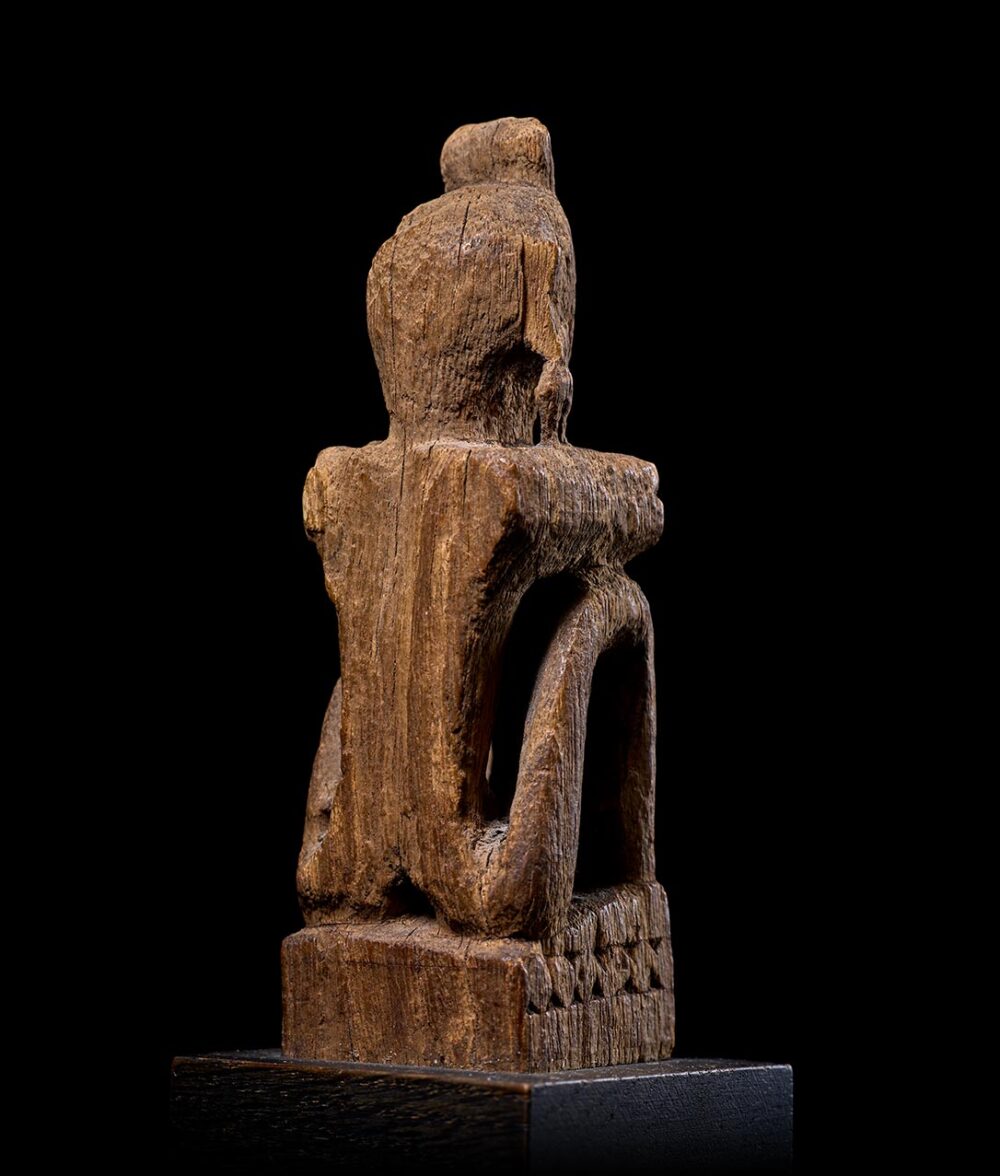 This small, and beautifully carved seated figure is from the island of Leti in Indonesia. Originally kept within the home, these figures represent recently deceased family members and served as a vessel through which a spirit could temporarily reside, receive offerings, or be consulted about important matters. These figures could be carved in a variety of different poses, which demarcate gender and social status. This particular figure, depicted in a seated position, the legs drawn up to the chest and arms neatly folded on top of the knees represents a male. Facial features and other common Leti characteristics are still visible. The sculpture is very old and heavily eroded. However, this level of erosion gives the figure a beautiful texture, bringing out the natural features of the wood. Because of the organic nature of the wood used for these figures, most sculptures of this age and from this region are very rare.
