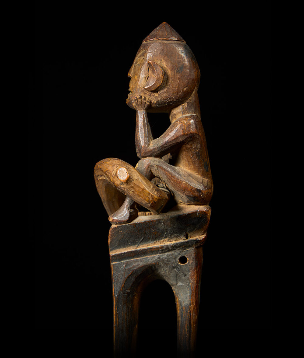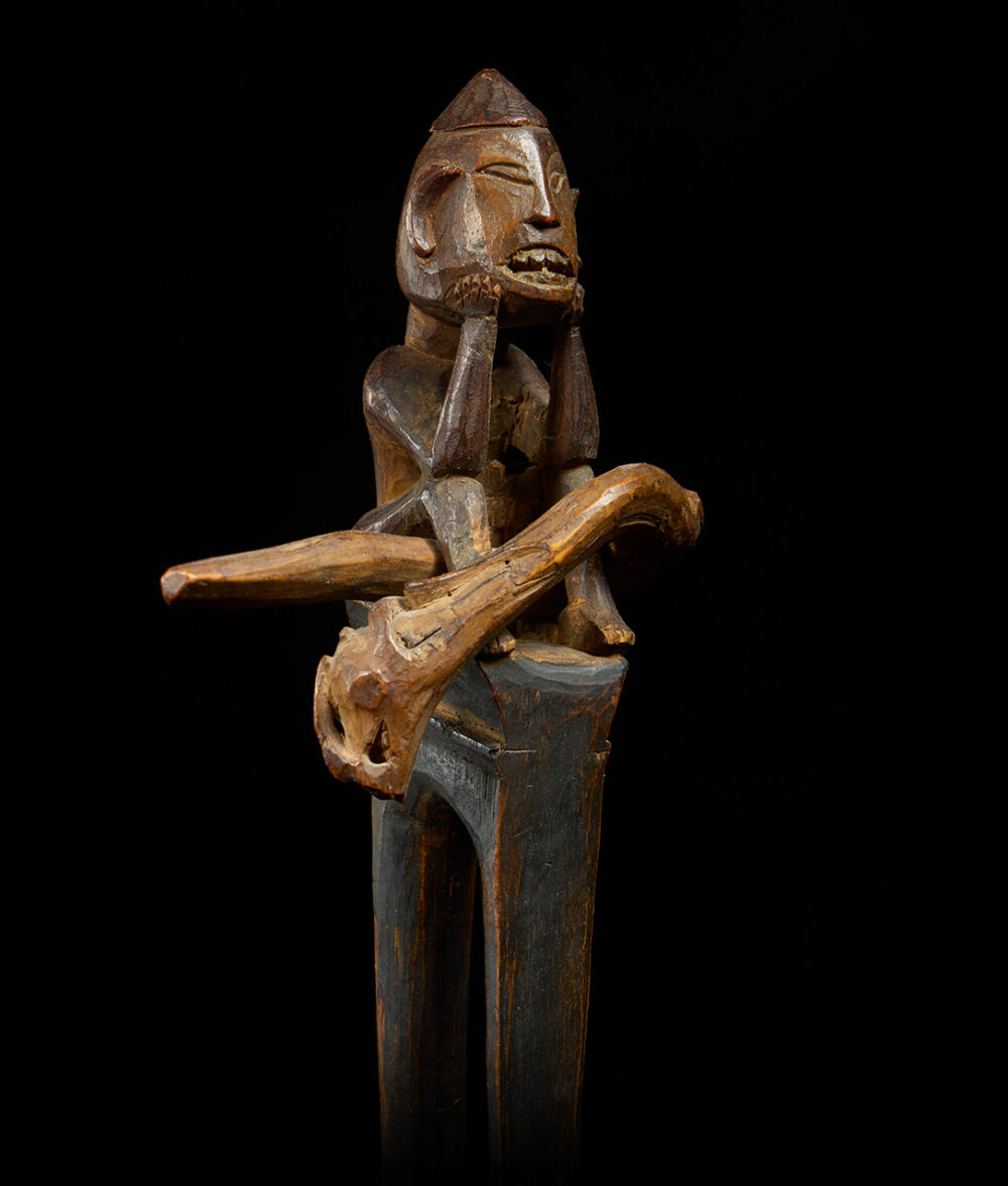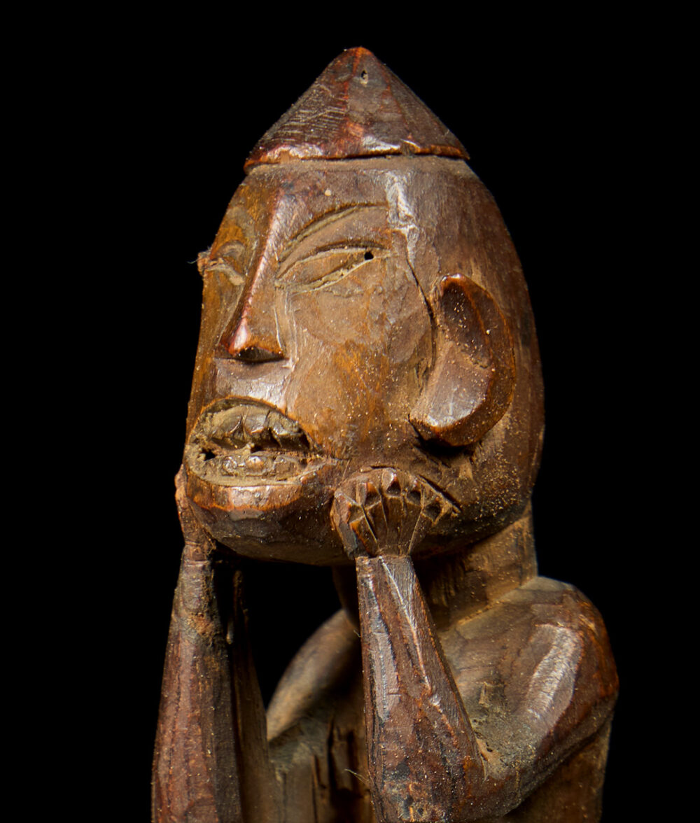 Craved from a single piece of wood, this dart clip was attached to a bamboo container that held poison darts. The forked bottom allowed the hunter to clip the Dart container to his waist or belt for easy transport. The finial, which probably also served as a handle, depicts a squatting human figure, like those seen on tuntun, with a coned cap, slit eyes and an open mouth that gives the impression he is laughing. A curved piece of rattan with its end carved in the shape of an aso head has been wrapped around the legs of the figure, it most likely served as an amulet for protection and success in hunting.