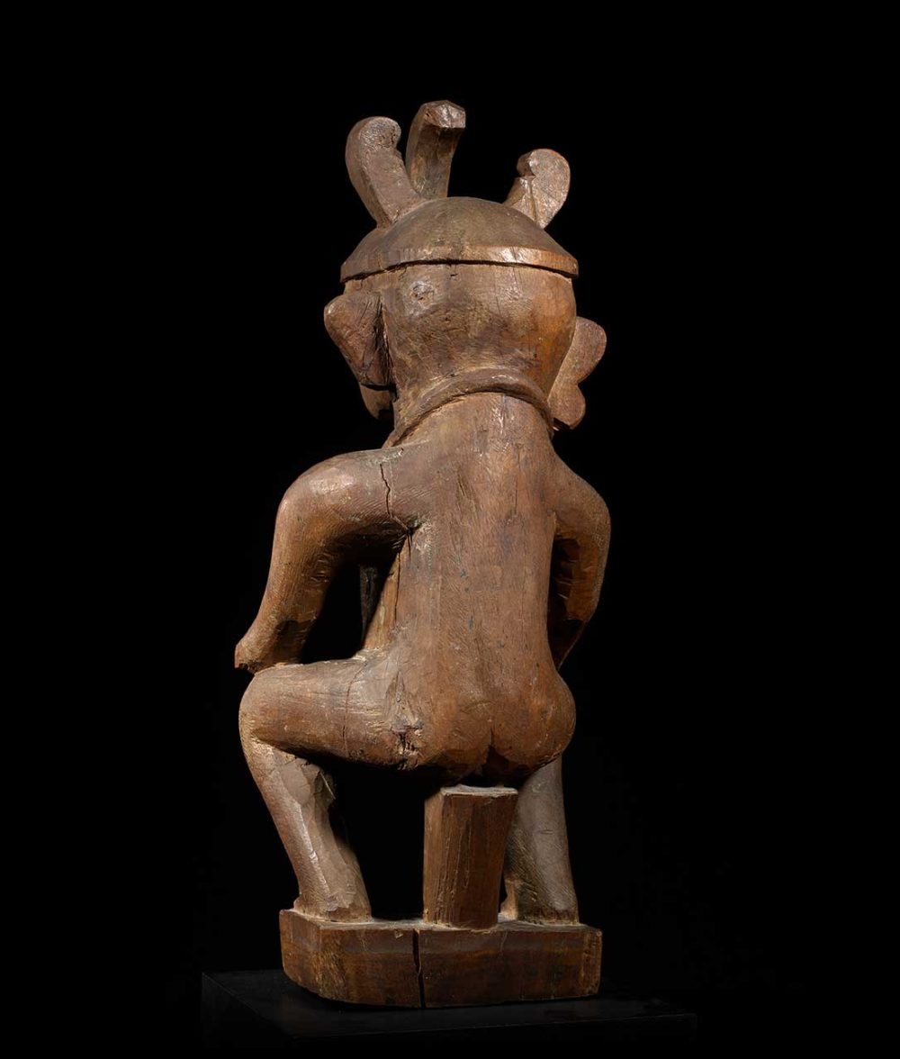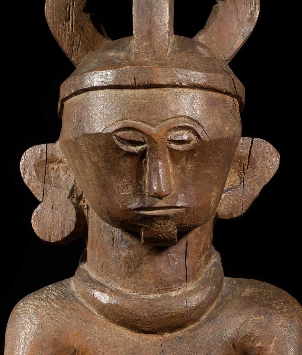 Ancestors played a vital role in the daily life for the people of Nias. Heavily adorned with markers of nobility, this figure is depicted seated on a stool, hands resting on top of its knees and adorned with a necklace, ornate crown, and single earring. The carving of the figure’s genitals is a common feature in Nias ancestor figures. The broad shoulders and serious expression give off a sense of power and authority. This depiction is of a high ranking tribesman and was once attached to a prominent altar, serving as a protector for the home.