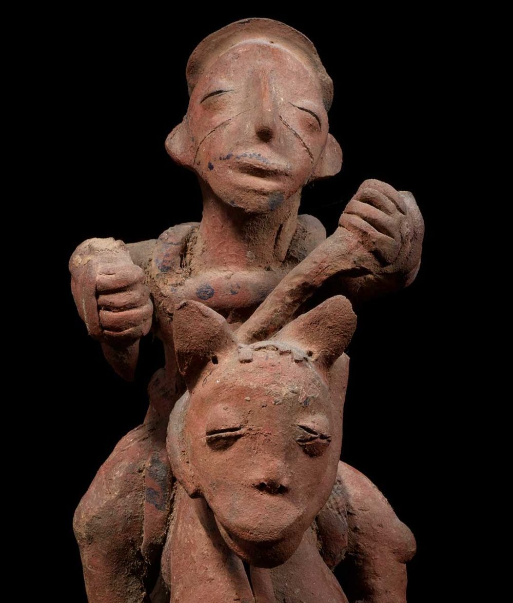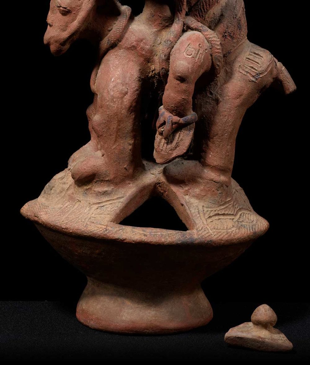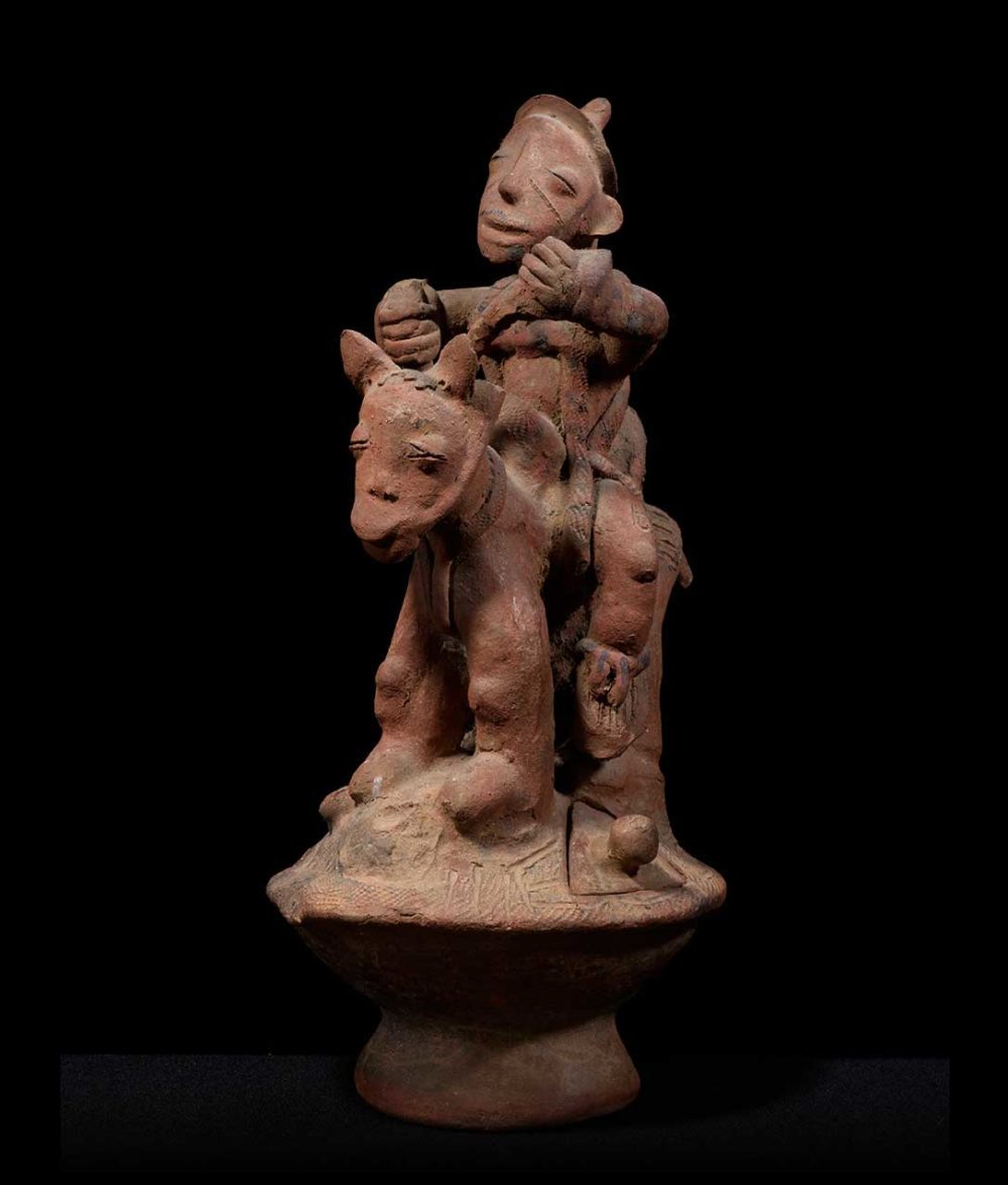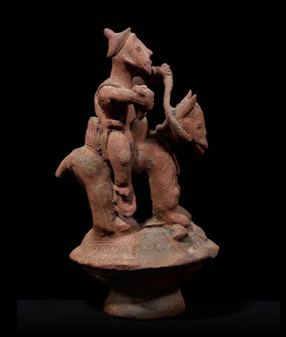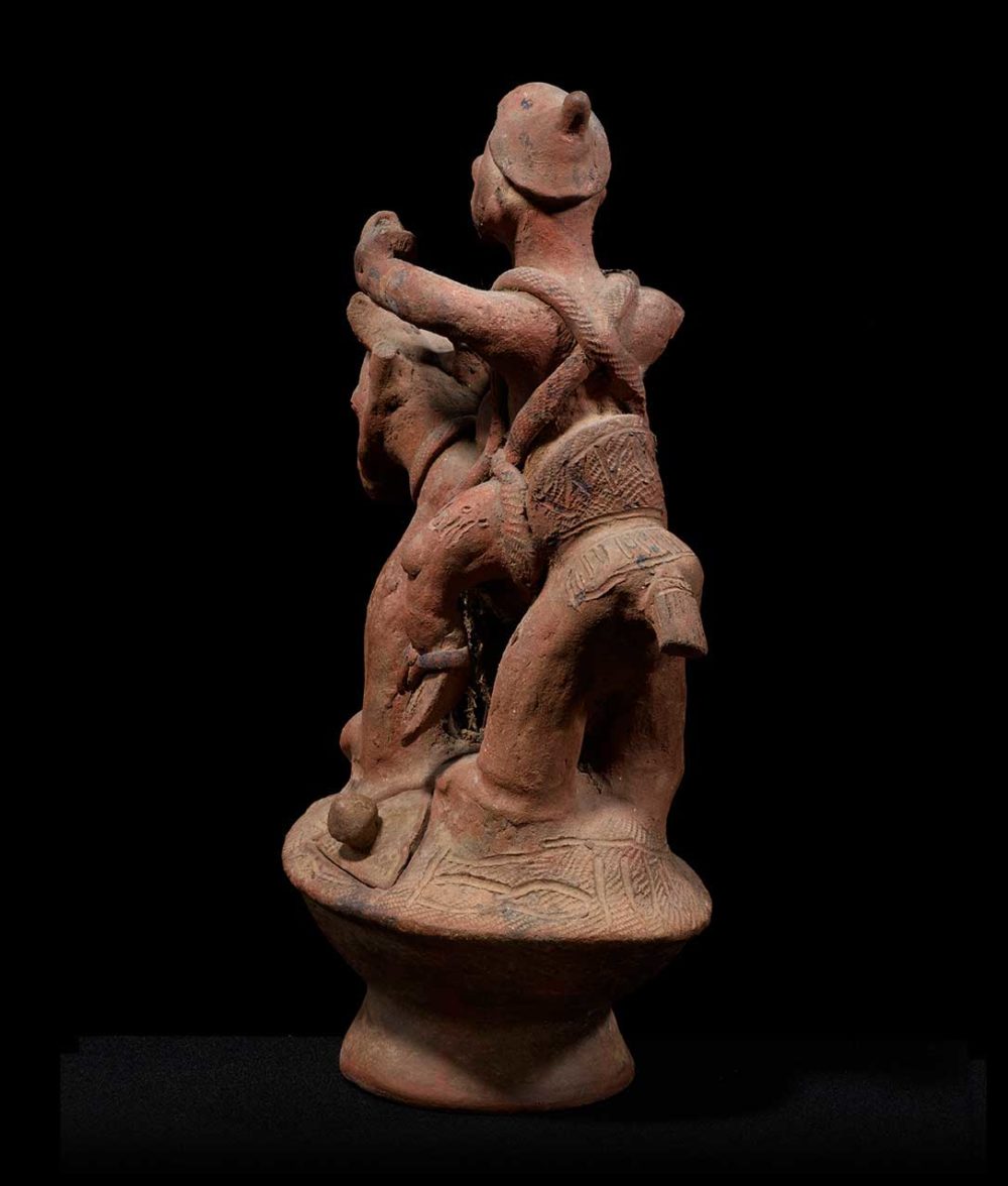 Well worn and in excellent condition. The rider and horse are very well sculpted with nice details throughout. The rider has a serene expression with a slightly tilted head seemingly gazing off toward the horizon. There are minor chips and slight losses on the figure and horse.