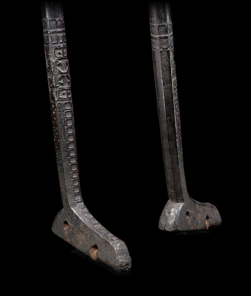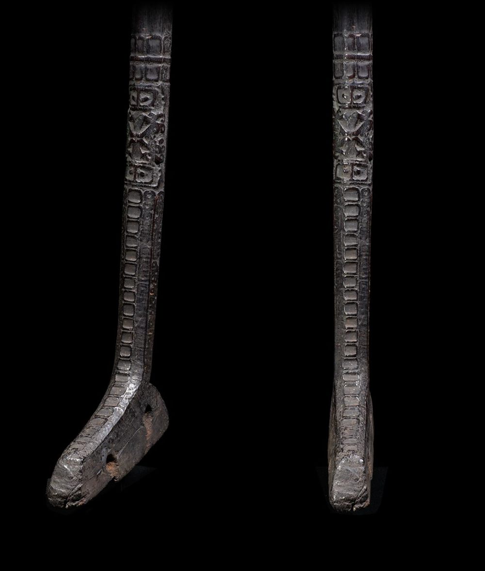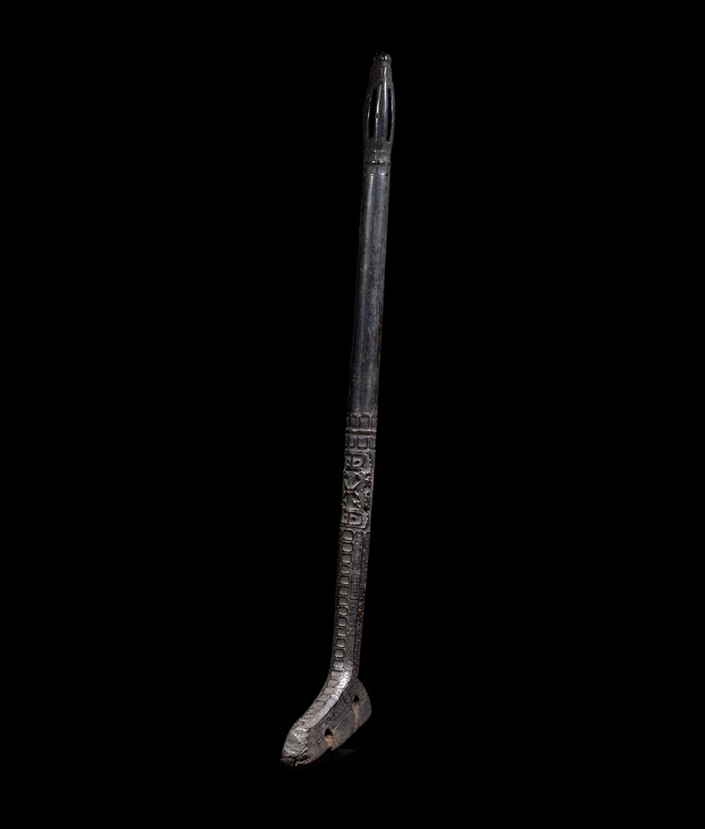 Ancestors played a vital role in daily life for the people of West Papua. This adze handle has two stacked and inverted ancestors figures carved in relief. Below the figures, the adze’s shaft and base is beautifully carved with geometric patterns. The surface is extremely well worn from many years of use. The patina is dark and brilliant.