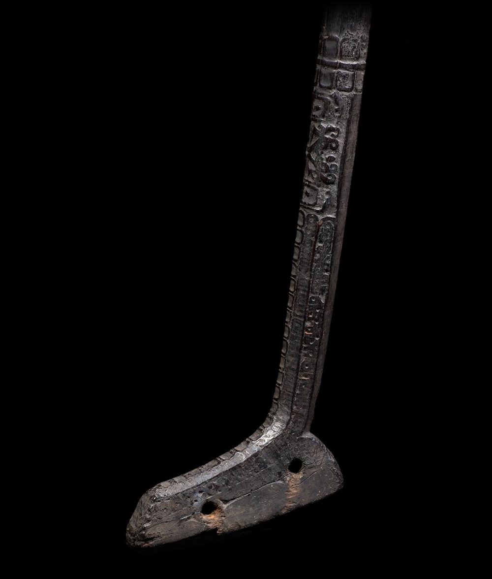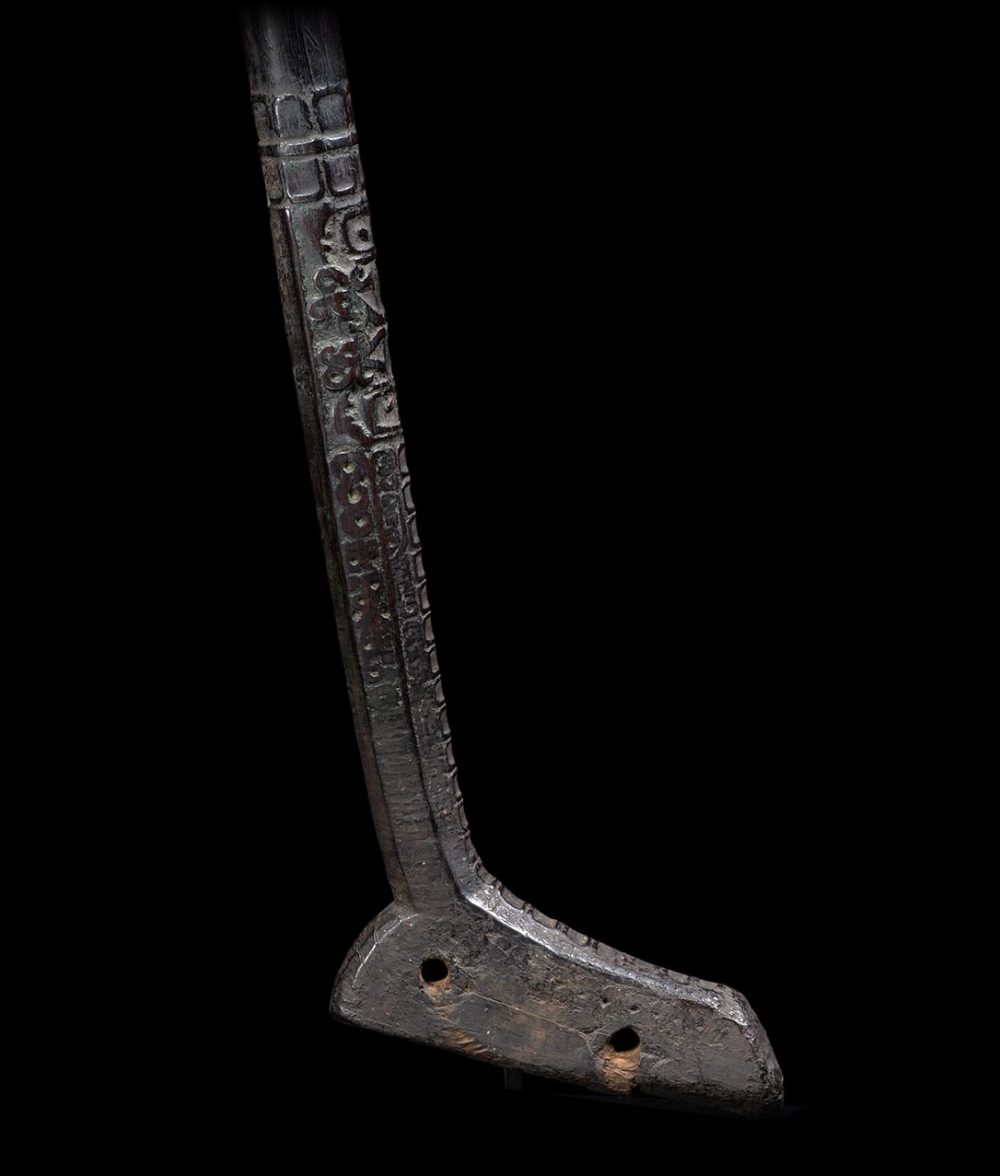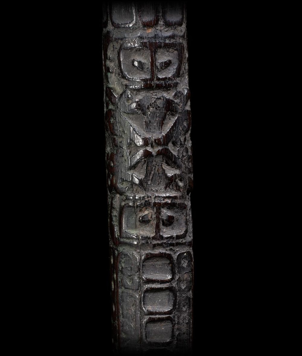 Ancestors played a vital role in daily life for the people of West Papua. This adze handle has two stacked and inverted ancestors figures carved in relief. Below the figures, the adze’s shaft and base is beautifully carved with geometric patterns. The surface is extremely well worn from many years of use. The patina is dark and brilliant.