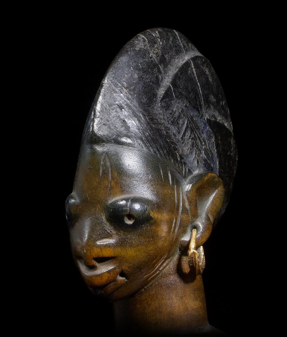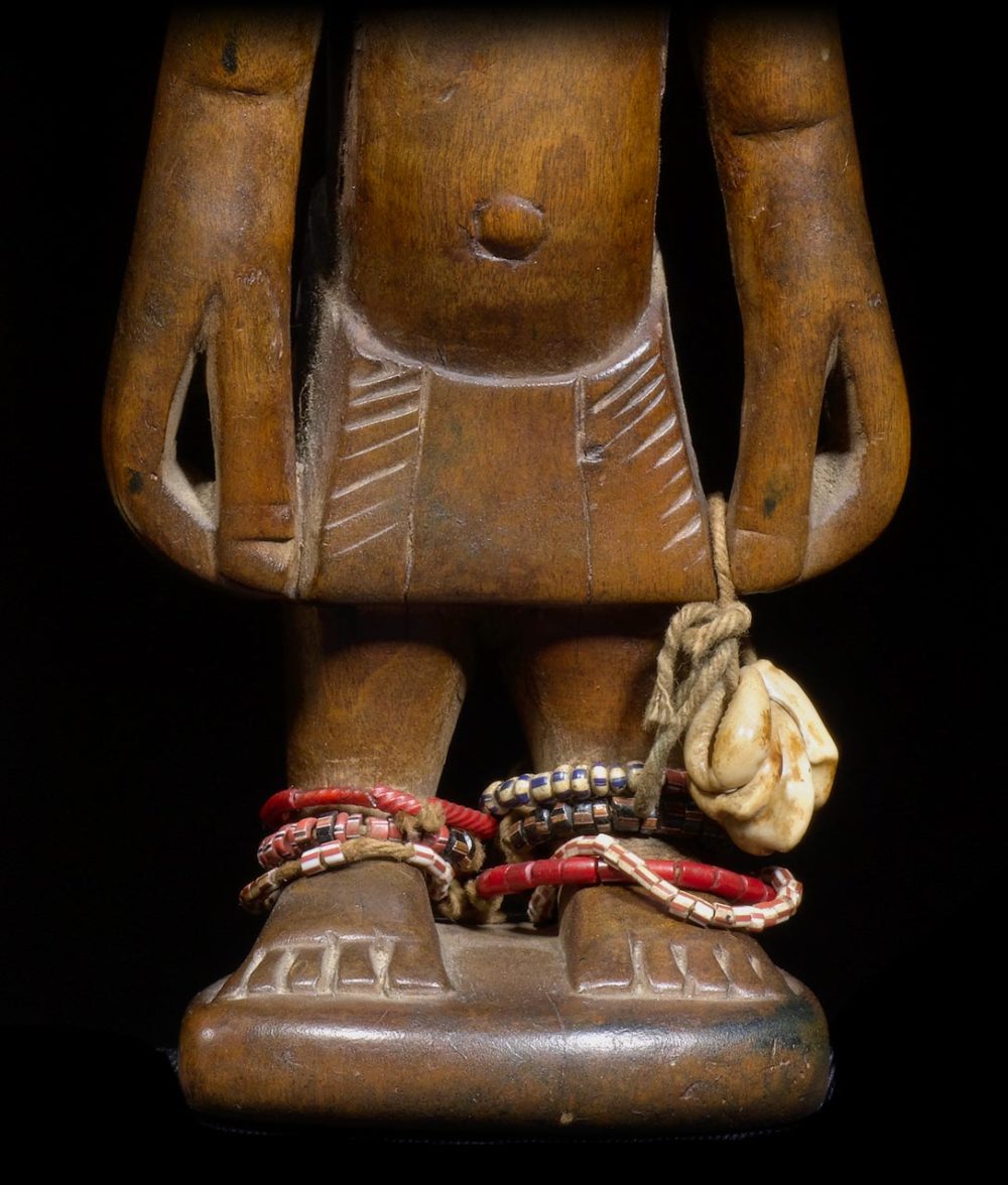 These wonderful Abeokuta styles Ibeji pair are both beautiful and elegant. The sculpture is very well balanced on both figures. The patina suggests years of ritual handling and bathes. Both figures are adorned with metal earrings, old trade beads and shells; evidence of the importance these Ibejis had when the original owner possessed them. Underneath the base of one of the figures the artist carved his stamp or signature. This pair may be in fact part of a quadruplet grouping. Recently published in the book Divine Twins, there is another nearly identical pair, very close in style; that have the same details, same beads and the same signature marking underneath the base.