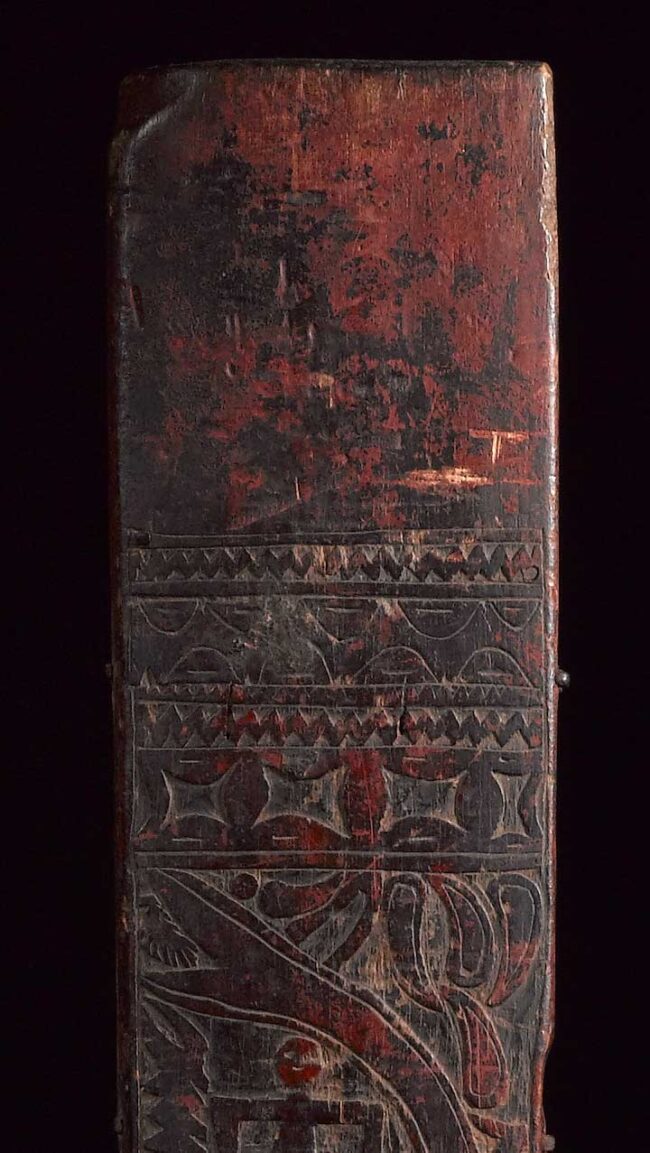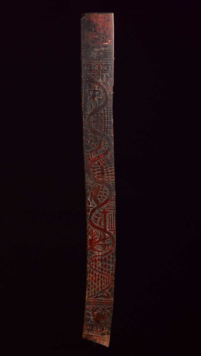 Among the Dayak, successful headhunting is considered to be the highest achievement possible for a tribesman. This remarkable pictorial sheath would have been worn by an important and accomplished leader. The carved design on this sheath relates to various themes: victory, acquisition of wealth and fertility. Rice in various stages of growth is carved on its boarder. A gigantic underworld serpent is the dominant feature of the design. In Dayak culture this creature is a guardian of the land of the dead, and a force for cyclical regrowth. In the mythic world this creature must be fed to harness the beast’s power, its open mouth has been fed a bird. Leeches are also depicted on several parts of the sheath. Their presence symbolizes the need of blood for sustenance. The hungry sword also required “harvested” heads of enemies to satiate its soul. Below the serpent’s head, a figure is carrying a basket with an enemies’ freshly taken head inside it. This finely carved sheath beautifully pays tribute to the Dayak’s warrior tradition.