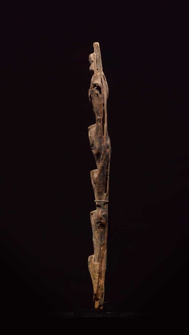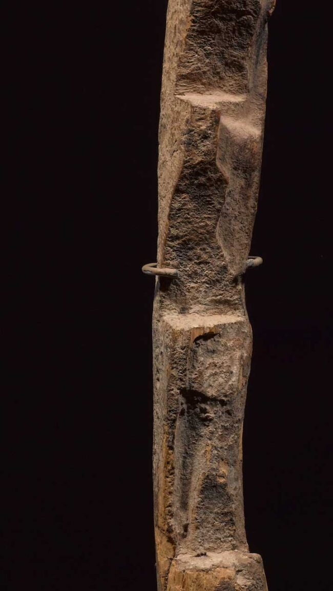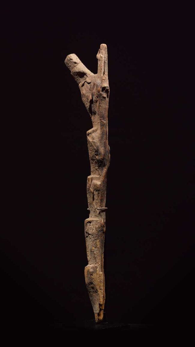 Called miniature ladders, these works replicate the form of the full-size versions, yet their purpose is spiritual rather than utilitarian. Along with pottery and figures, miniature ladders were placed on interior domestic shrines, where Dogon thought the souls of specific ancestors dwelled. The Dogon believe the ladders facilitate a spirit’s ability to reach his ancestor. In Dogon sacrificial practice, poured libations created a layered patina over the carved wood. The patina on this ladder developed over a very long period of time from the numerous ritual libations it received, most likely consisting of mixtures of animal blood, minerals from the surrounding landscape, and millet.