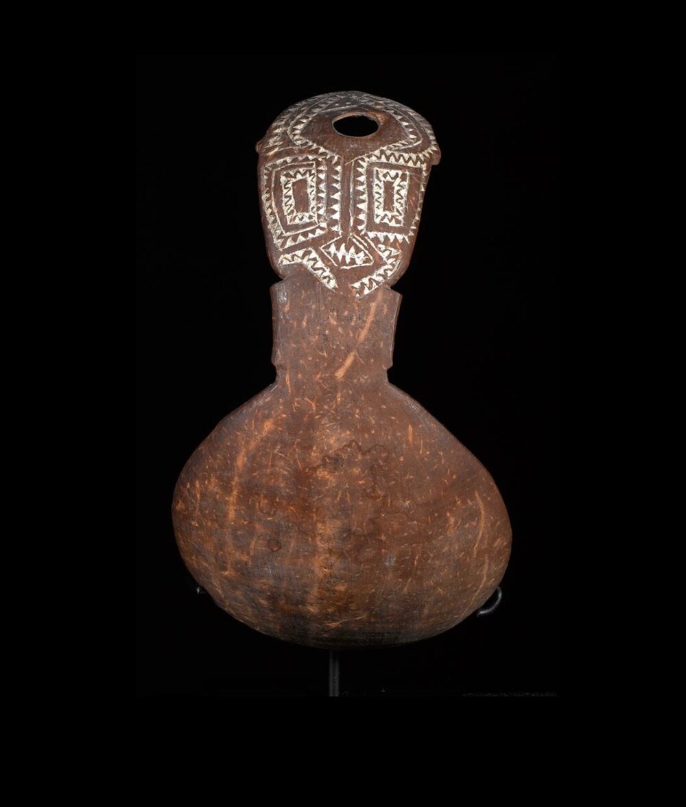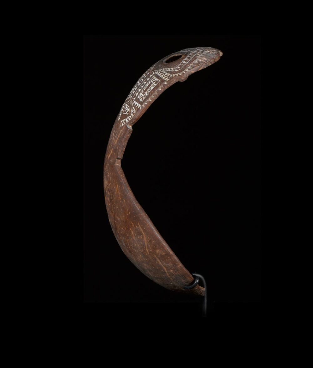 This object is a perfect example of how Papuan Gulf art can fuse both form with function. This spoon was both a utilitarian object and one of the items given to young men to use during the hevehe ritual cycle, where they chew ginger during a six-week isolation stage with strict food and sexual taboos. Young men use these special spoons exclusively to avoid possible contact with forbidden foods being consumed by people not undergoing initiation. The round open section at the top of the spoon was created so that tassels of dyed sago leaf and sprigs of ginger could be attached. This example was carved with a central spirit face. The design is carved in low relief and highlighted with crushed limestone powder. Included with this spoon is Schnell’s original inventory card, presumably created shortly after he acquired it in 1962 from Ohly.