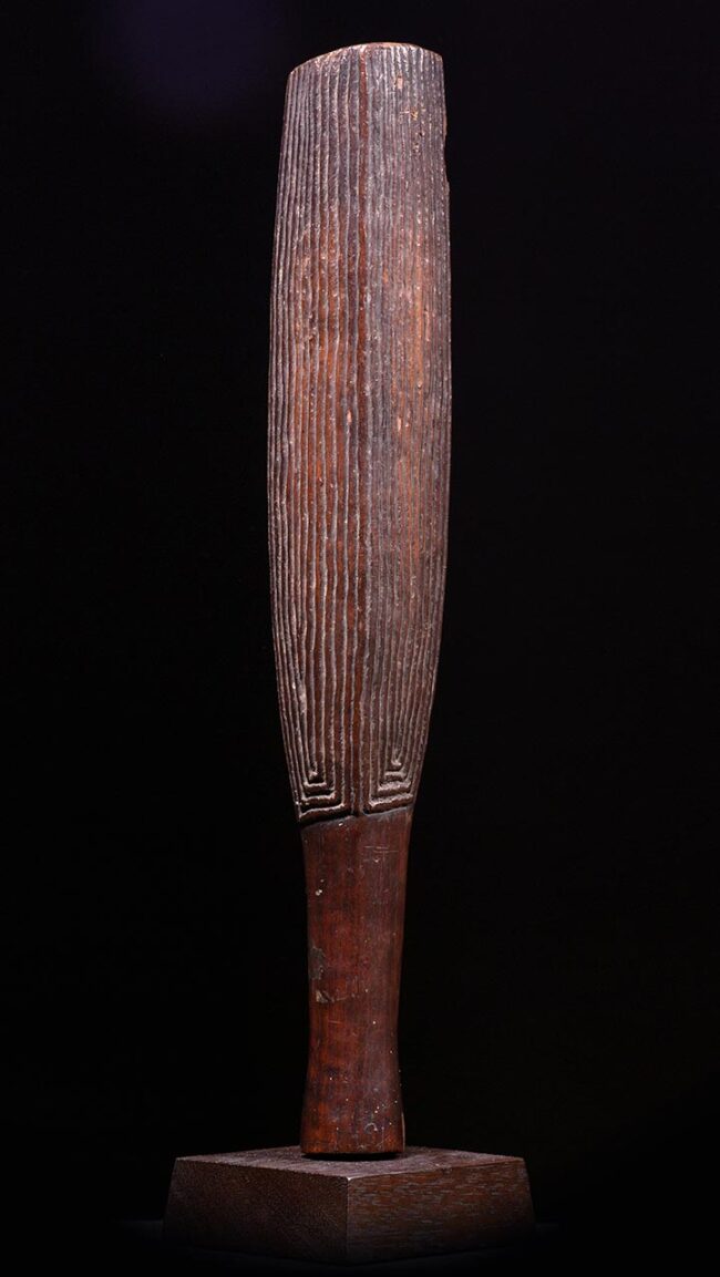 A wooden bark cloth beater from Fili is used for beating and softening the fibers of the inner bark of trees to produce the material known as “bark cloth.” The process involves repeatedly hitting the bark with the beater to make it flexible and pliable for weaving or sewing into various cultural and traditional items such as clothing, mats, and household goods.