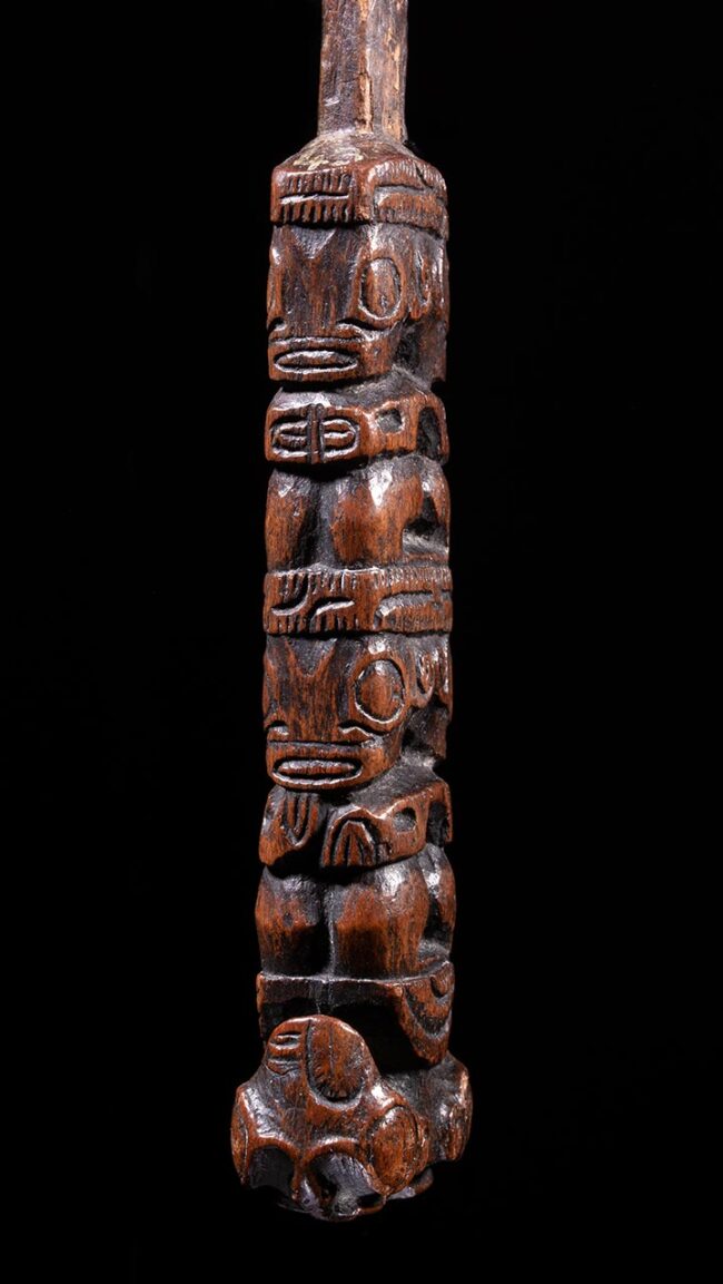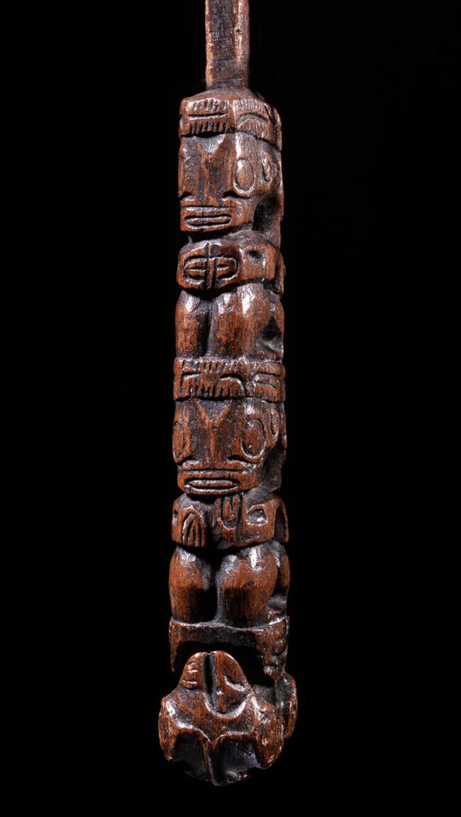 In the Marquesas Islands fans were used as important ceremonial objects in various rituals and dances. They were often held by dancers or placed on the ground as a decorative element during performances. This handle is carved with two sets of Janus figures standing back-to-back. They are known as tiki figures, and they represented deities or ancestral spirits that were believed to protect the owner of the fan from negative energies or spirits. The tiki figures were often depicted in a stylized, abstract form, with exaggerated features and bold lines. This style of carving was meant to convey the power and importance of the figures, as well as their connection to the spiritual realm. The figures standing back-to-back were often seen as a representation of the balance between male and female energies, which was an important aspect of Marquesan cosmology. The Marquesan’s believed that all things were made up of both male and female elements, and that maintaining a balance between these forces was essential for spiritual harmony.