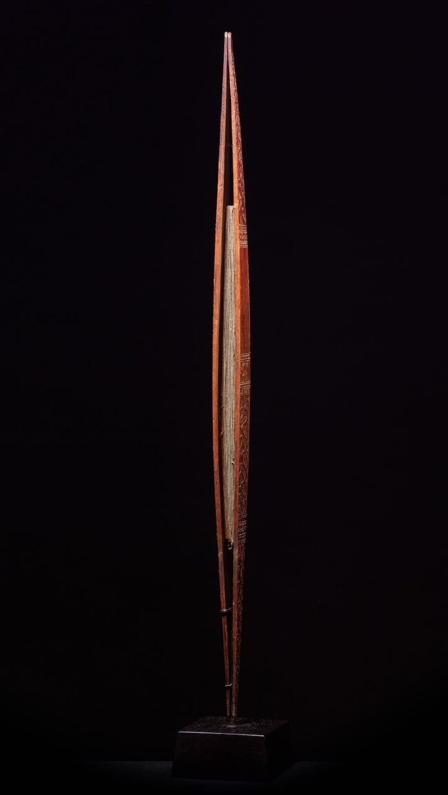 Wooden shuttles were traditionally used by the Iban people, an indigenous group from the island of Borneo, for weaving textiles. The shuttles were designed to carry the weft threads back and forth through the warp threads on a loom, allowing the weaver to create a patterned fabric. This example still retains cotton threads wrapped inside it. The shuttles are often covered in intricate carved designs that reflect the Iban culture and beliefs. These designs are typically symbolic and may represent various aspects of nature, such as plants, animals, and insects. They may also depict important cultural and spiritual motifs, such as the hornbill, which is considered a powerful symbol of strength and wisdom. In addition to their decorative function, the carved designs on the shuttles may have served a practical purpose as well. They may have helped the weavers to identify their own shuttles in a communal weaving space.