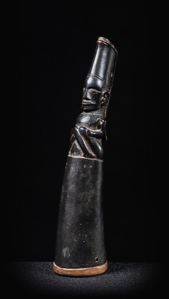 The Batak adopted firearms quickly after Westerners introduced them. This is a fine and rare example of a gun powder holder. The posture is strong and graceful with a delicate curvature of the back. The sharp jutting convention of the nose, chin and clavicle are softened by years of handling. The patina shows extensive wear which illuminates the depth and beauty of the buffalo horn’s surface. In excellent condition.