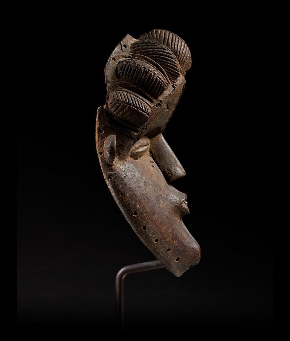 The facial section of this mask was affixed diagonally to a rattan basketry, cap-like structure. Consequently, the wearer does not peer out through the eyes, even if they are carved open. Instead, vision is facilitated through a slit in the cloth suspended beneath the mask and headdress. The features of this mask, akin to its movements, exude refinement and grace, often associated with femininity. Although worn by men and considered the spirit force of a gender-neutral order, the mask is simultaneously imbued with feminine attributes. The narrow, half-closed eyes and the elaborate hairstyle, featuring a central plait or crest and rows of smaller, symmetrically arranged forms, adhere to Bassa’s standards of feminine beauty. Additionally, the vertical pattern on the forehead, represents a traditional tattoo.